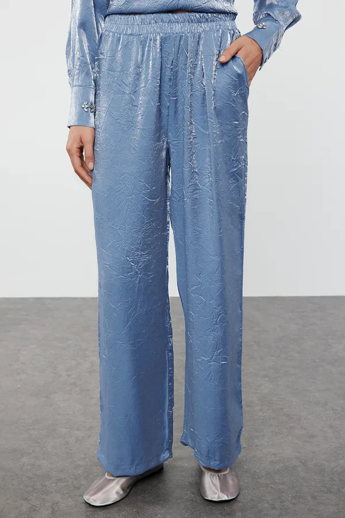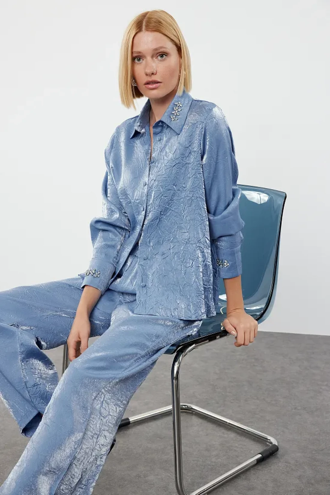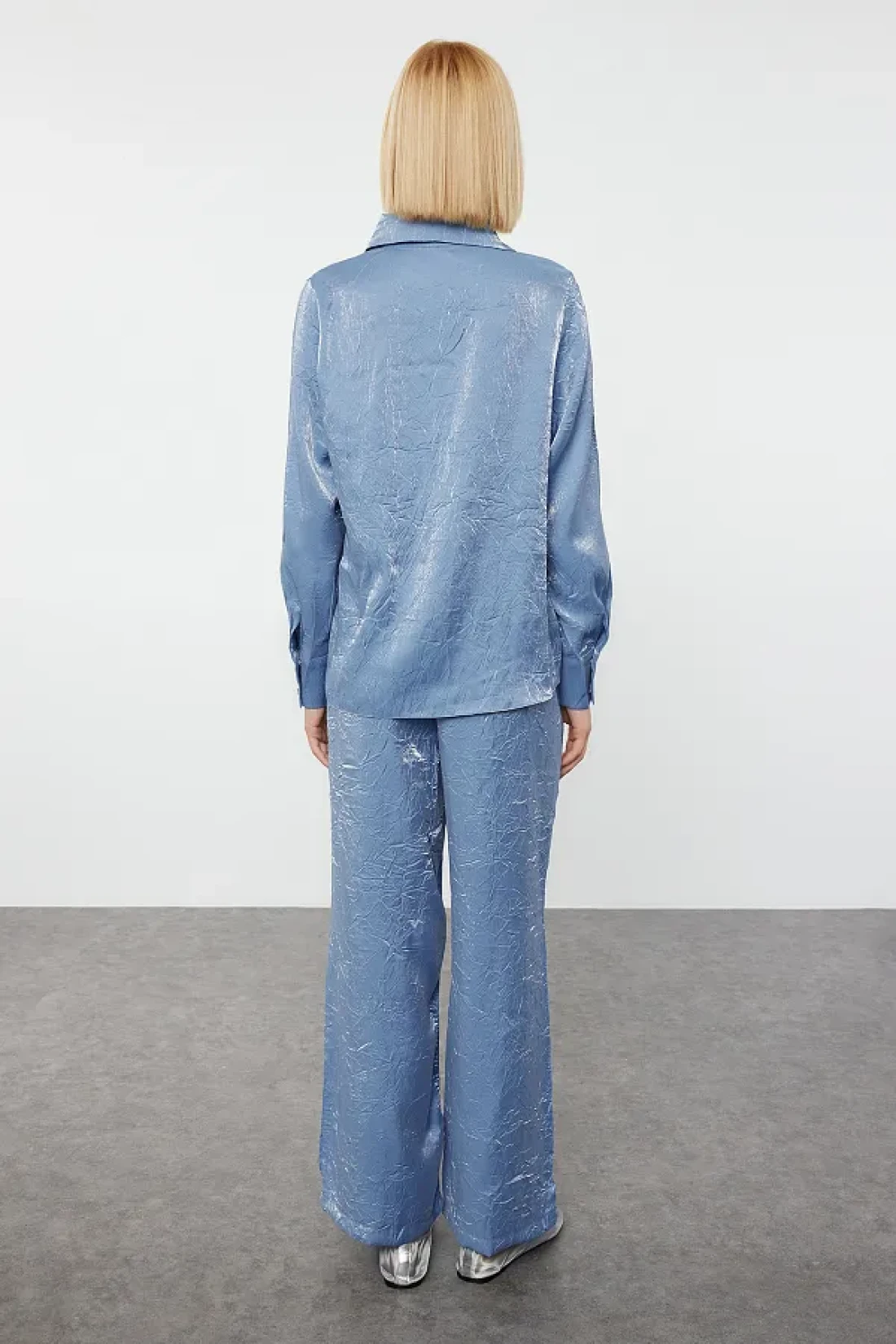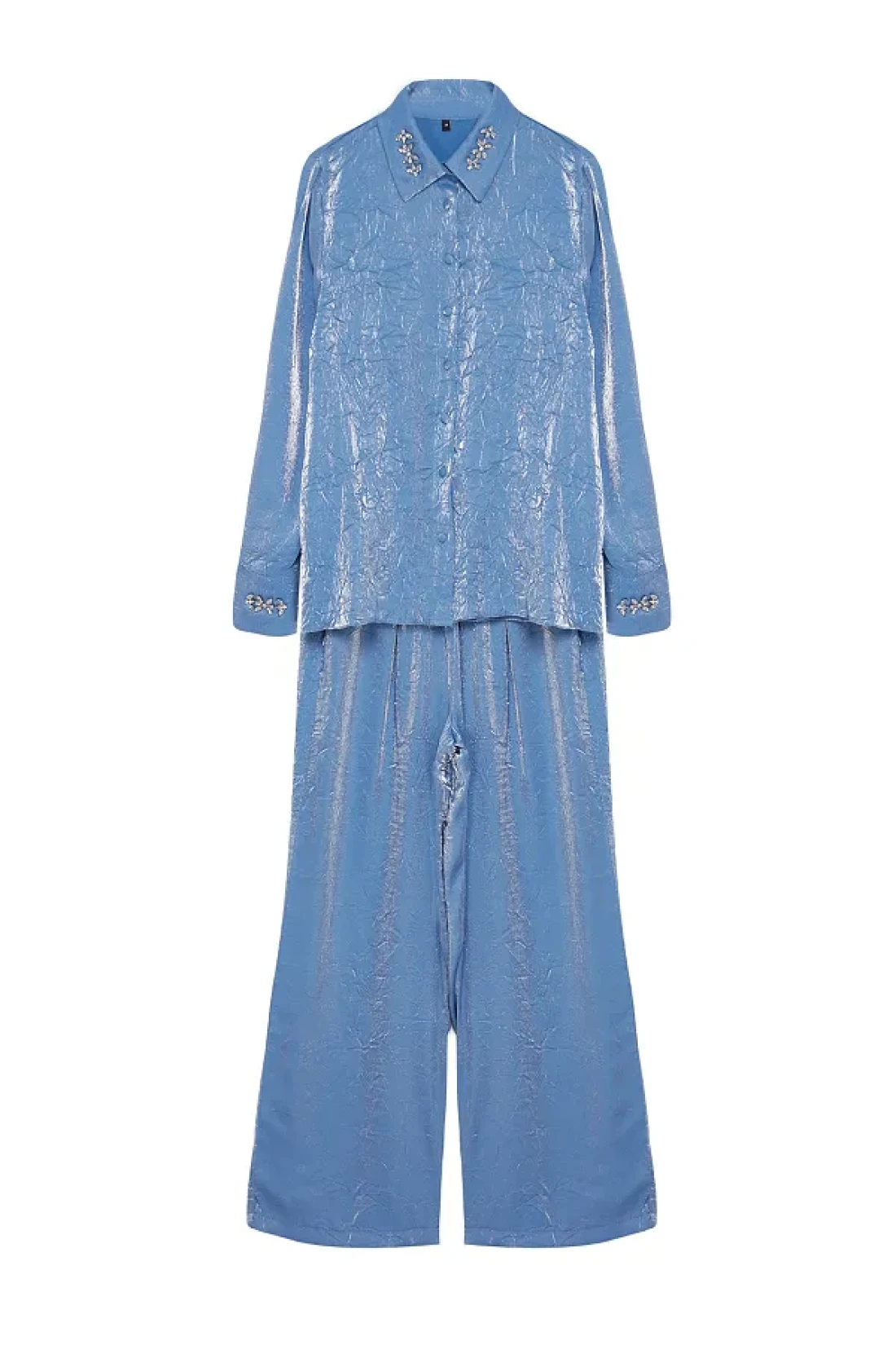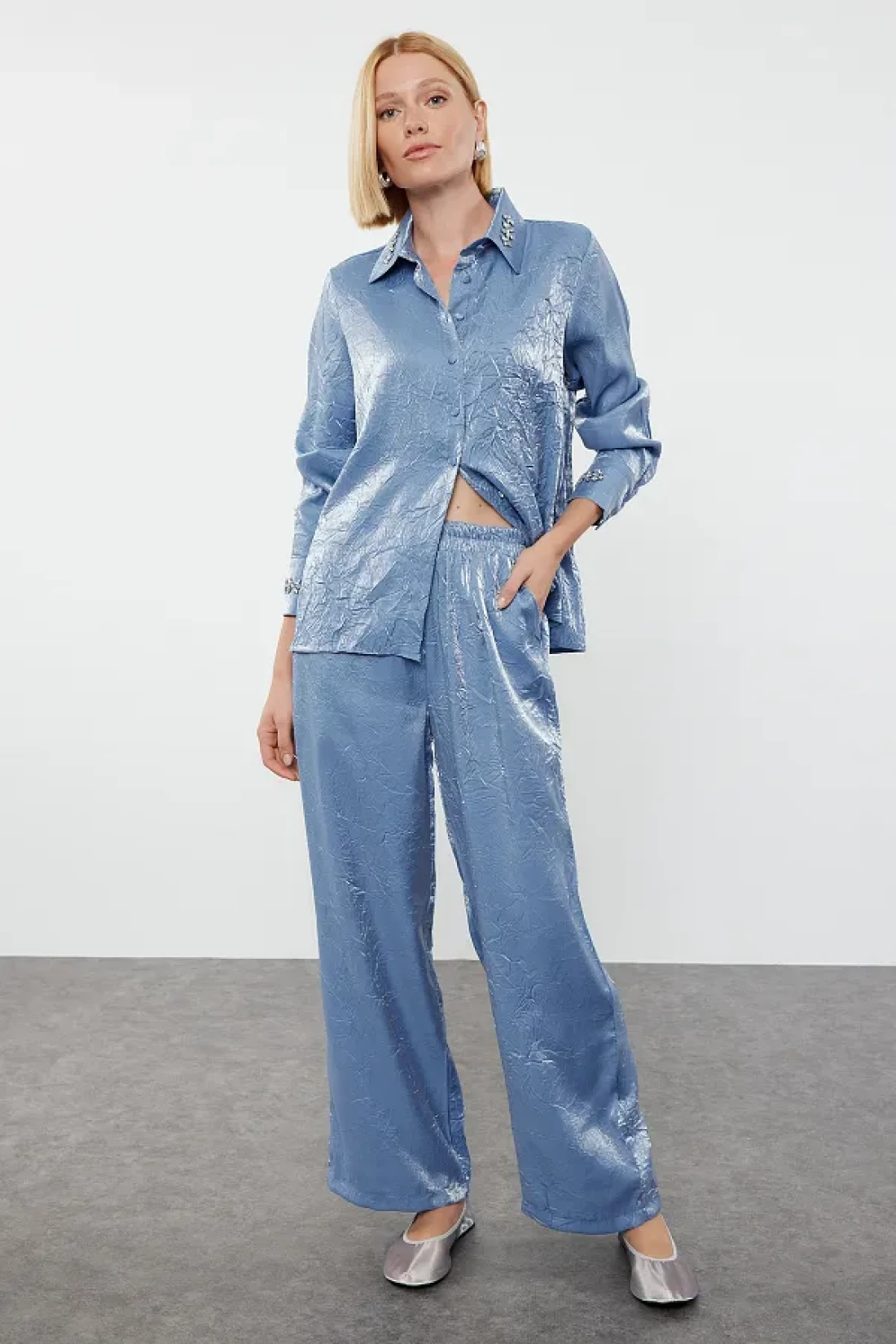 Collection Satin Woven Navy Blue Shirt and Trousers Set - Accessory Detailed TWOAW25AU00088