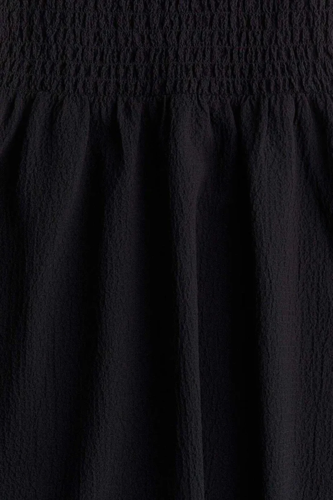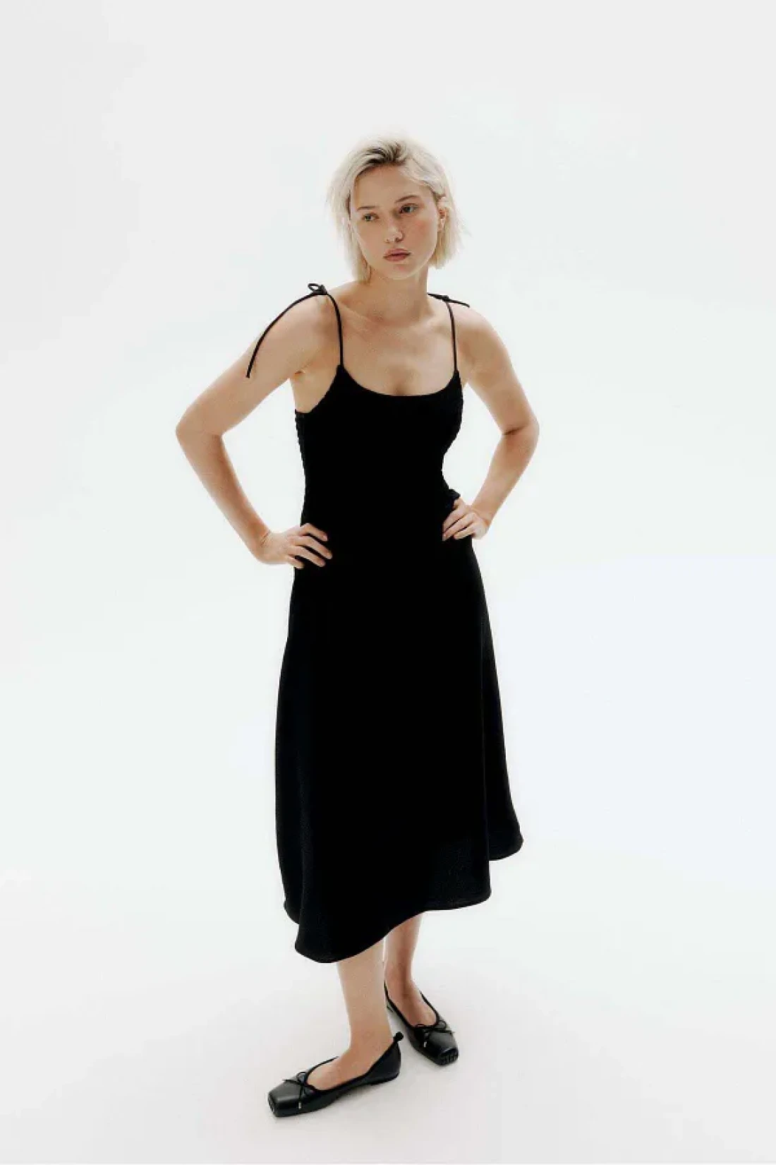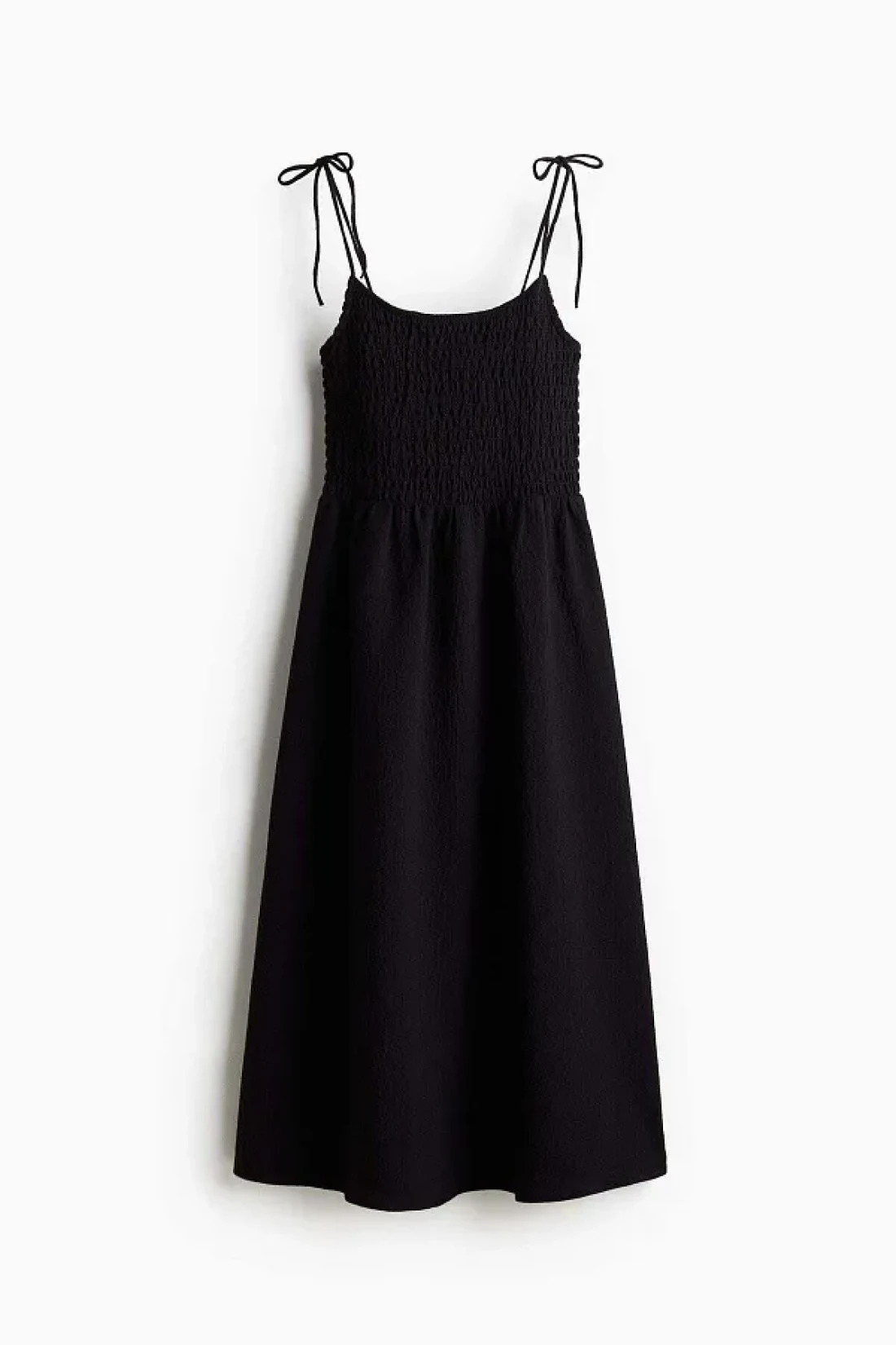 Calf-length dress in woven fabric with a fitted, smocked bodice, deep, round neckline and tie-top spaghetti shoulder straps.
