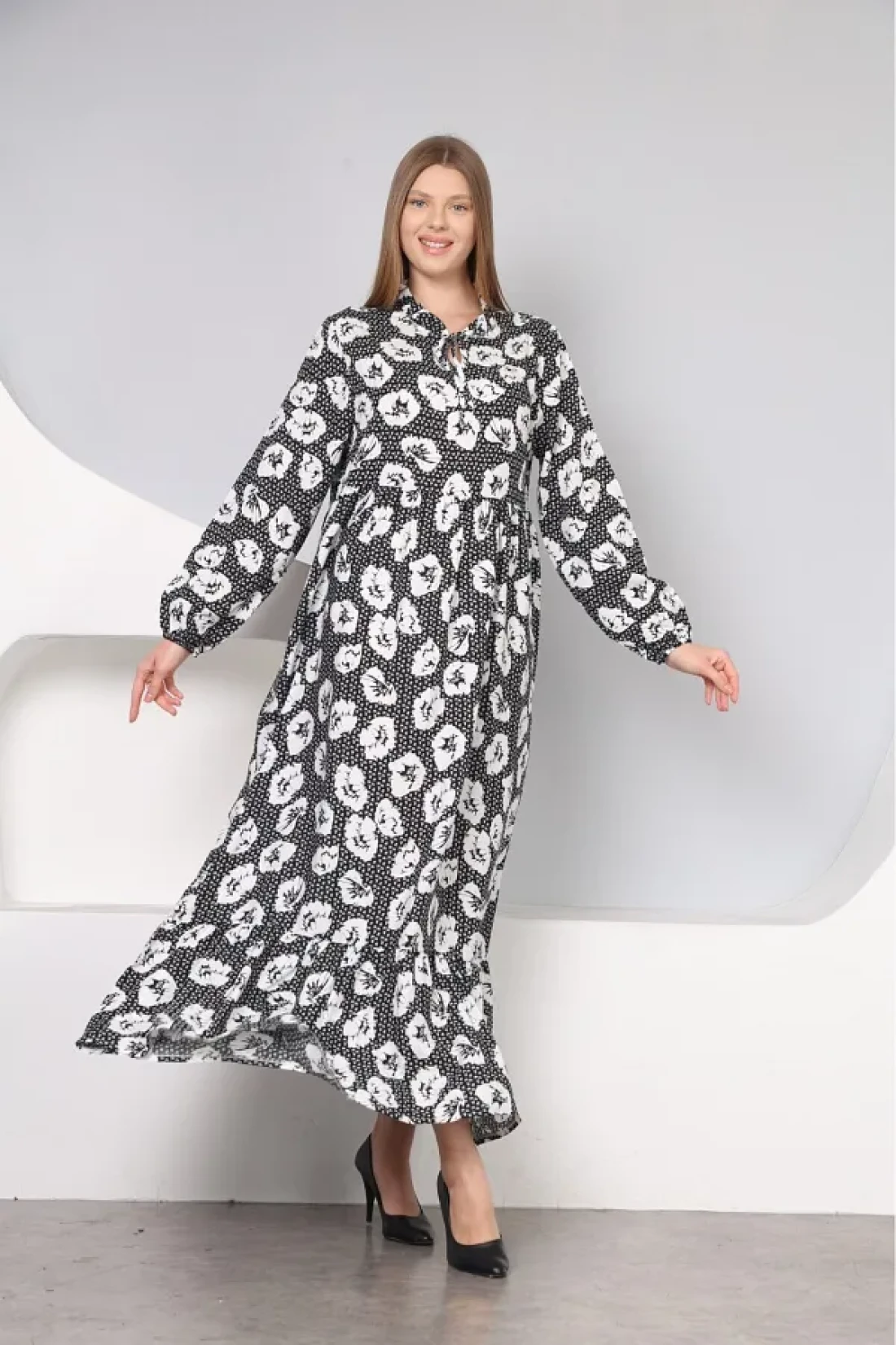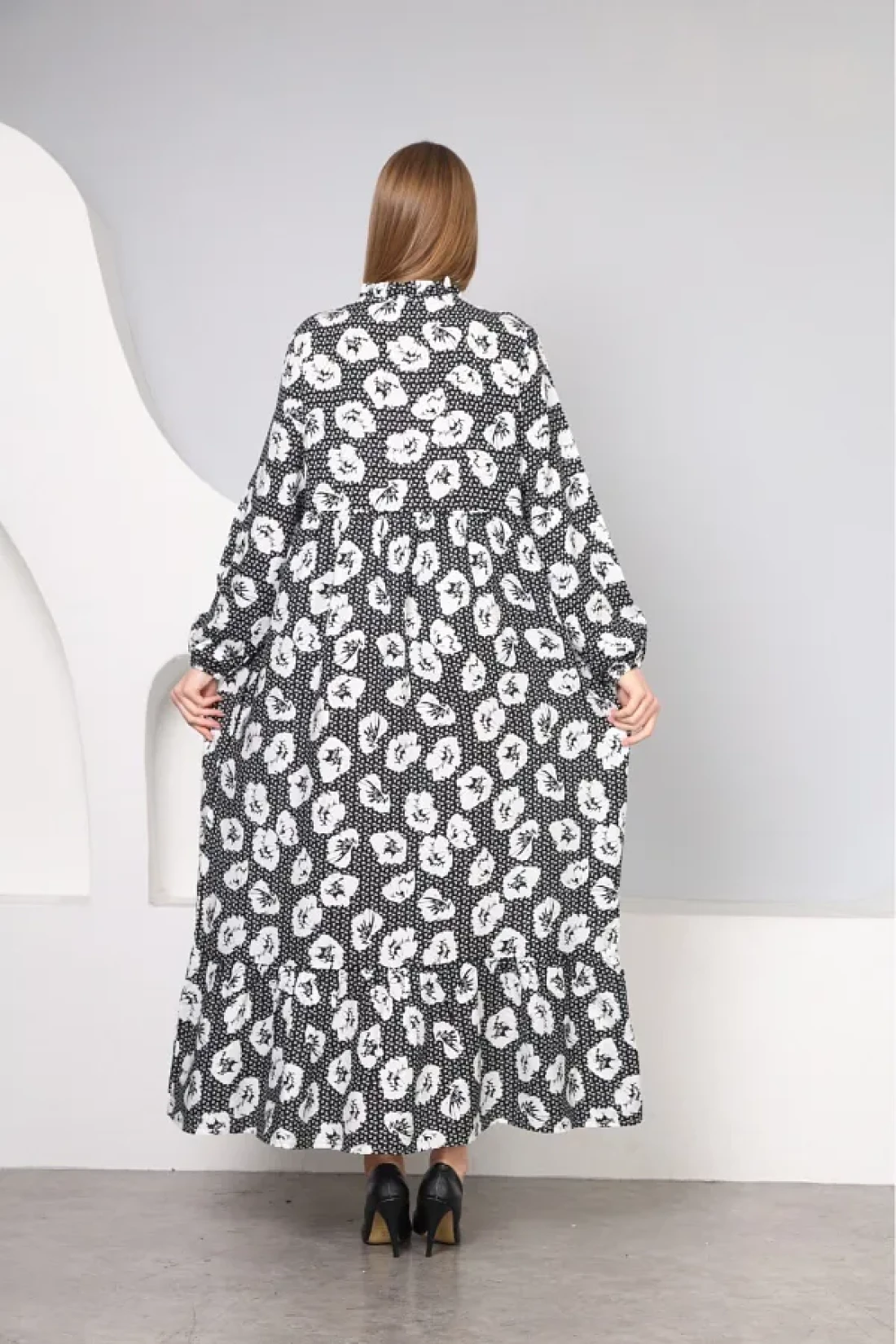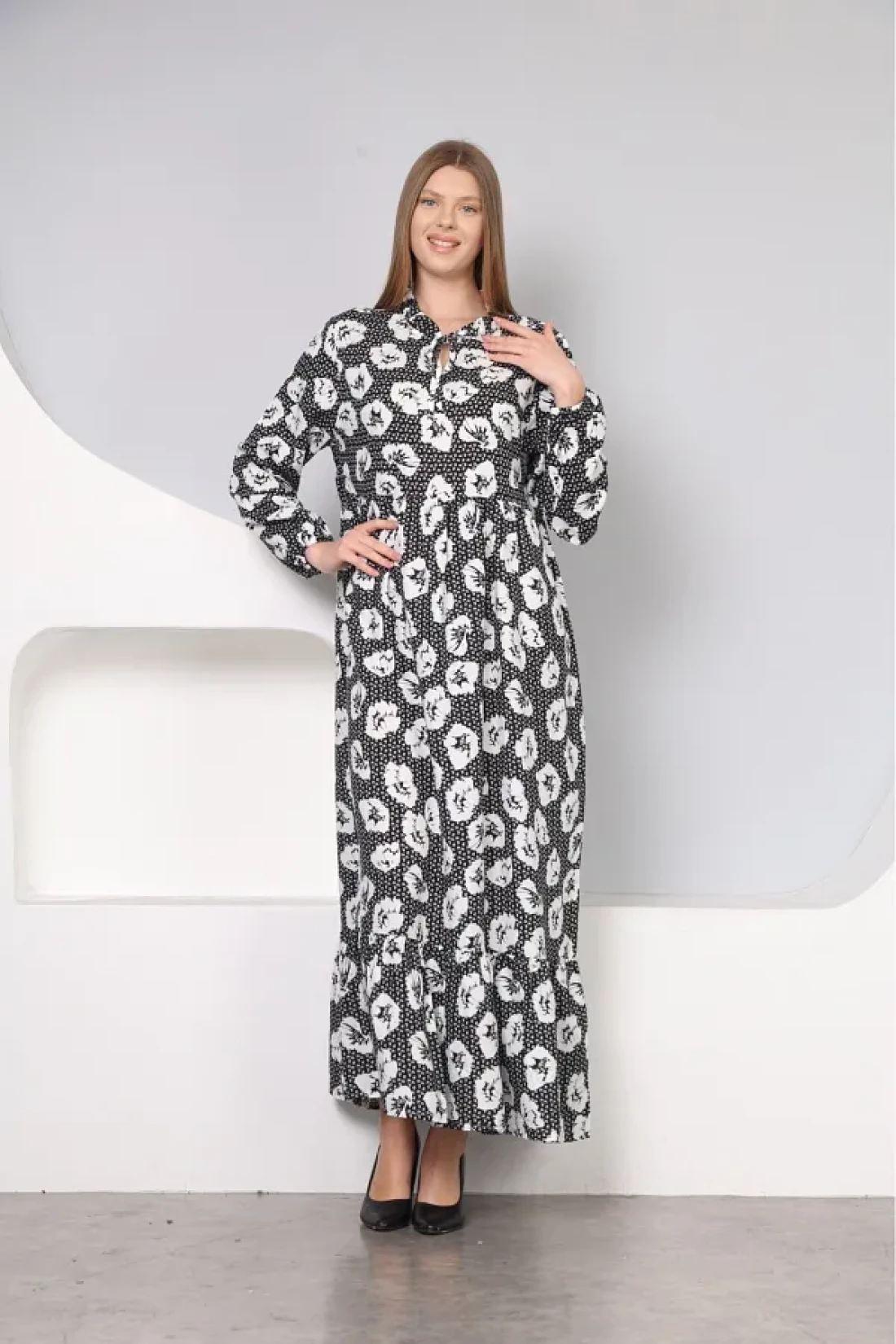 With its long-sleeved design, it offers comfortable use during seasonal transitions and cool weather. It provides a modern and stylish look thanks to its crew neck cut. It is a suitable option for everyone with its wide size range that appeals to all age groups. It offers comfort and elegance together with its casual style suitable for daily use. It creates an eye-catching style with its patterned structure, and gives a soft touch feeling thanks to its polyviscon weaving type. It draws an elegant silhouette by highlighting feminine lines with its flared pattern. Viscose material provides comfort all day long with its lightness and breathable structure. Woven fabric type increases durability, allowing long-term use Specially designed for hijab clothing collection It offers elegance and covering principles together With its long length, it gives you the freedom to move comfortably and displays an elegant stance.