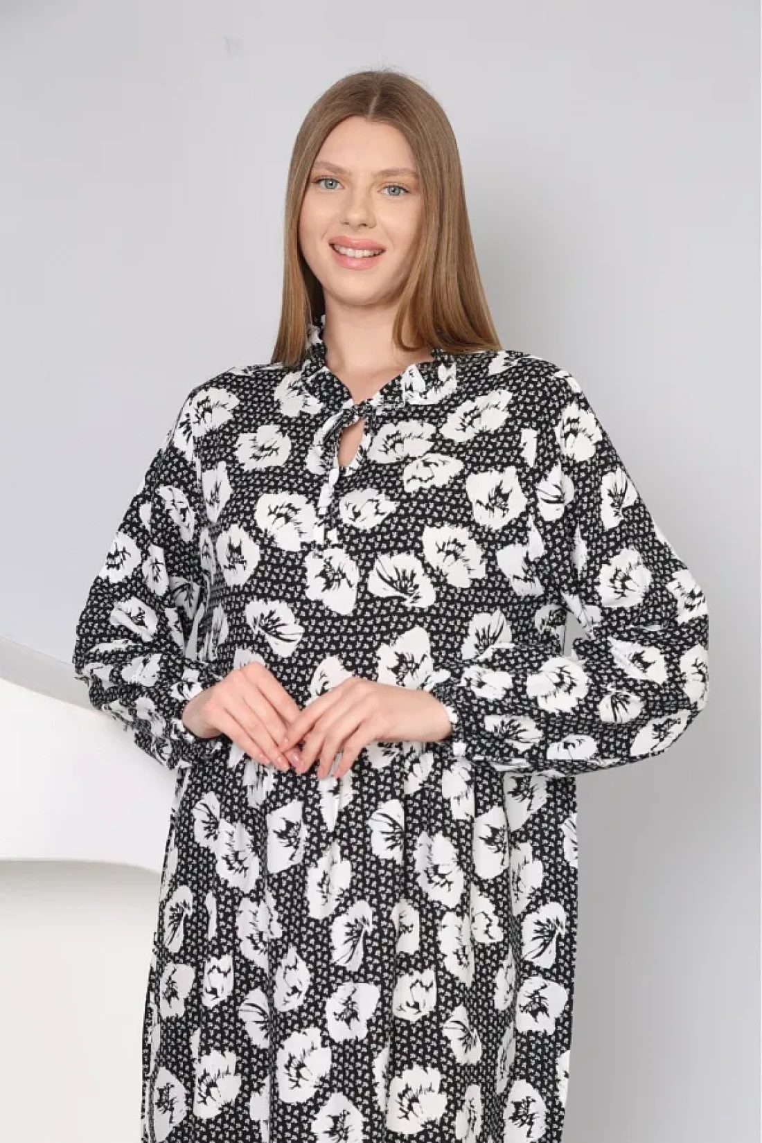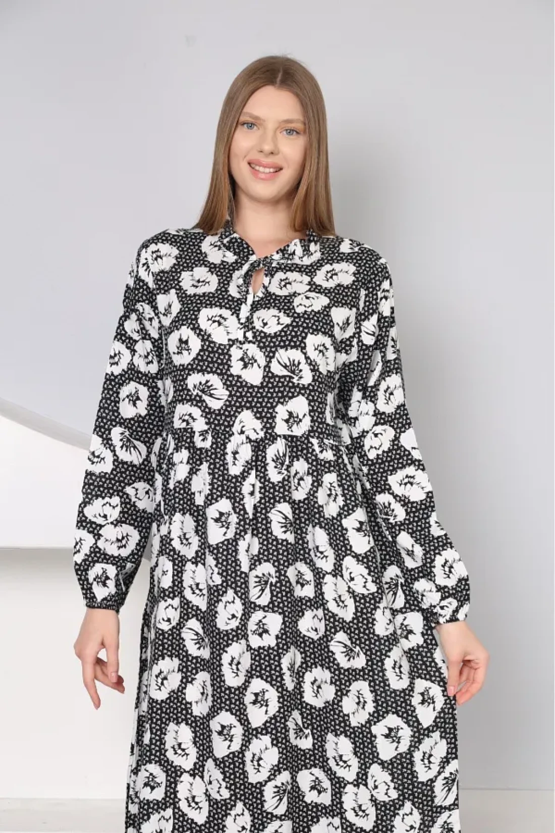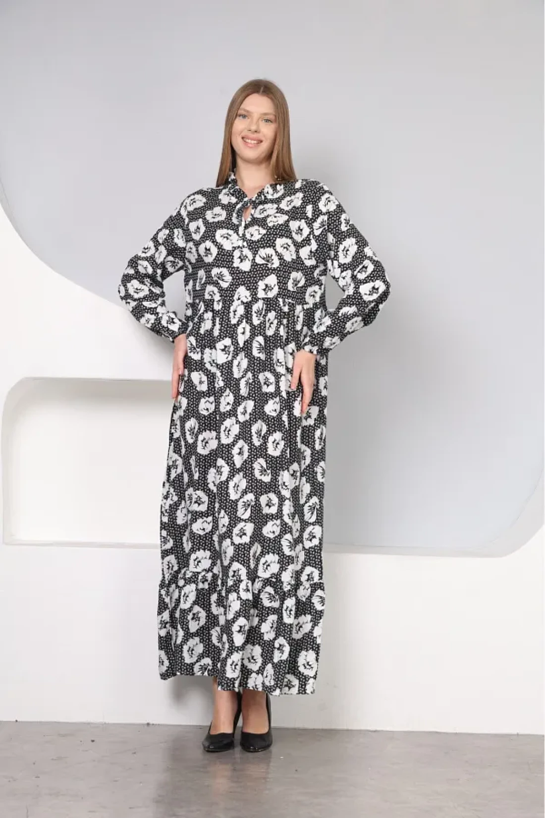 With its long-sleeved design, it offers comfortable use during seasonal transitions and cool weather. It provides a modern and stylish look thanks to its crew neck cut. It is a suitable option for everyone with its wide size range that appeals to all age groups. It offers comfort and elegance together with its casual style suitable for daily use. It creates an eye-catching style with its patterned structure, and gives a soft touch feeling thanks to its polyviscon weaving type. It draws an elegant silhouette by highlighting feminine lines with its flared pattern. Viscose material provides comfort all day long with its lightness and breathable structure. Woven fabric type increases durability, allowing long-term use Specially designed for hijab clothing collection It offers elegance and covering principles together With its long length, it gives you the freedom to move comfortably and displays an elegant stance.
