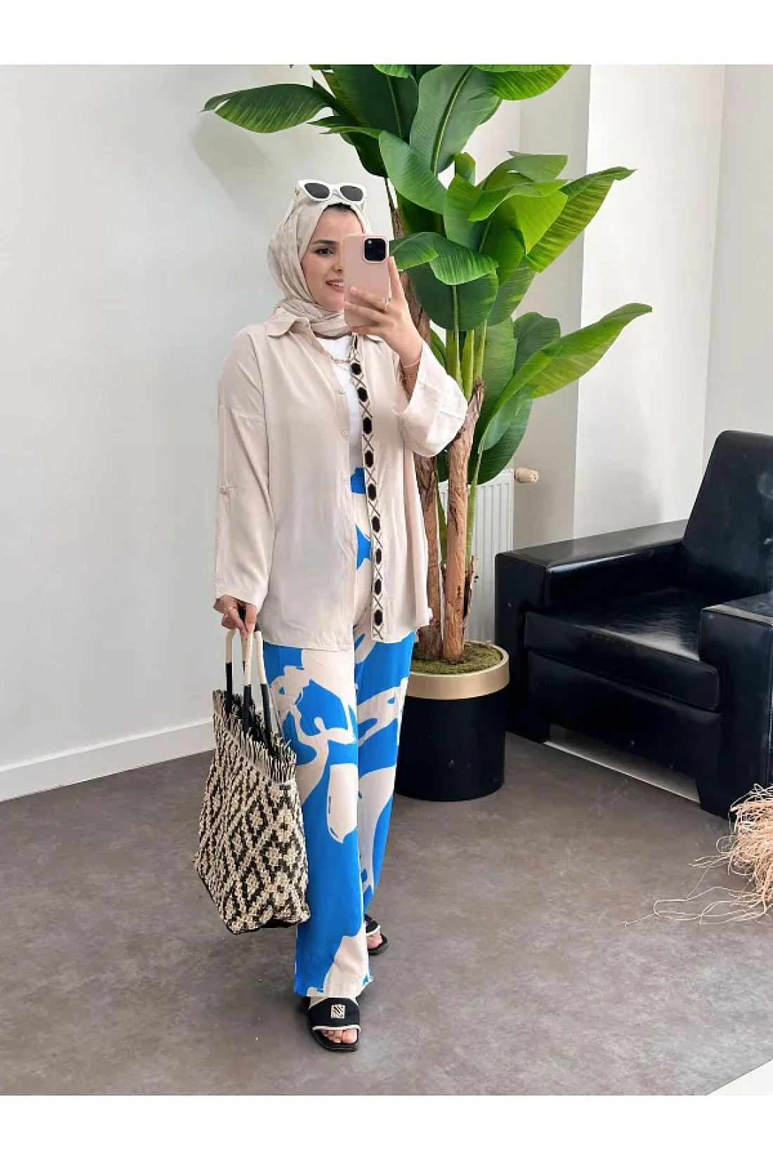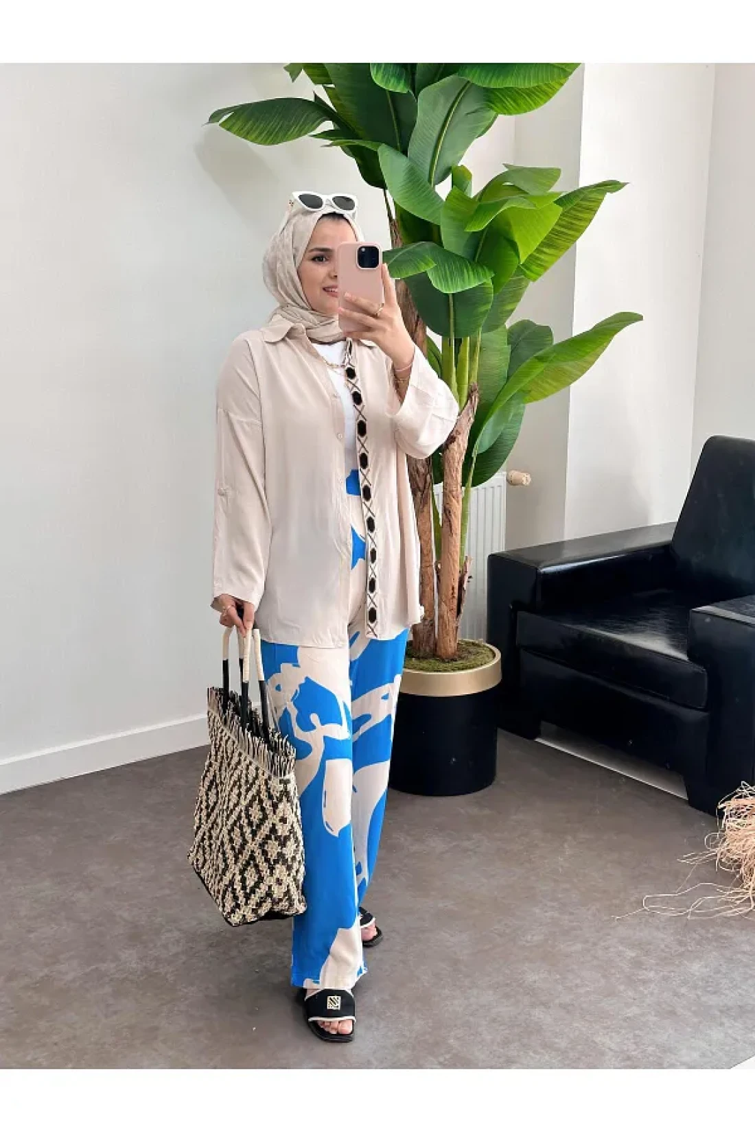 ASEL FASHİON Beige-Blue Embroidered Cotton Viscose Set