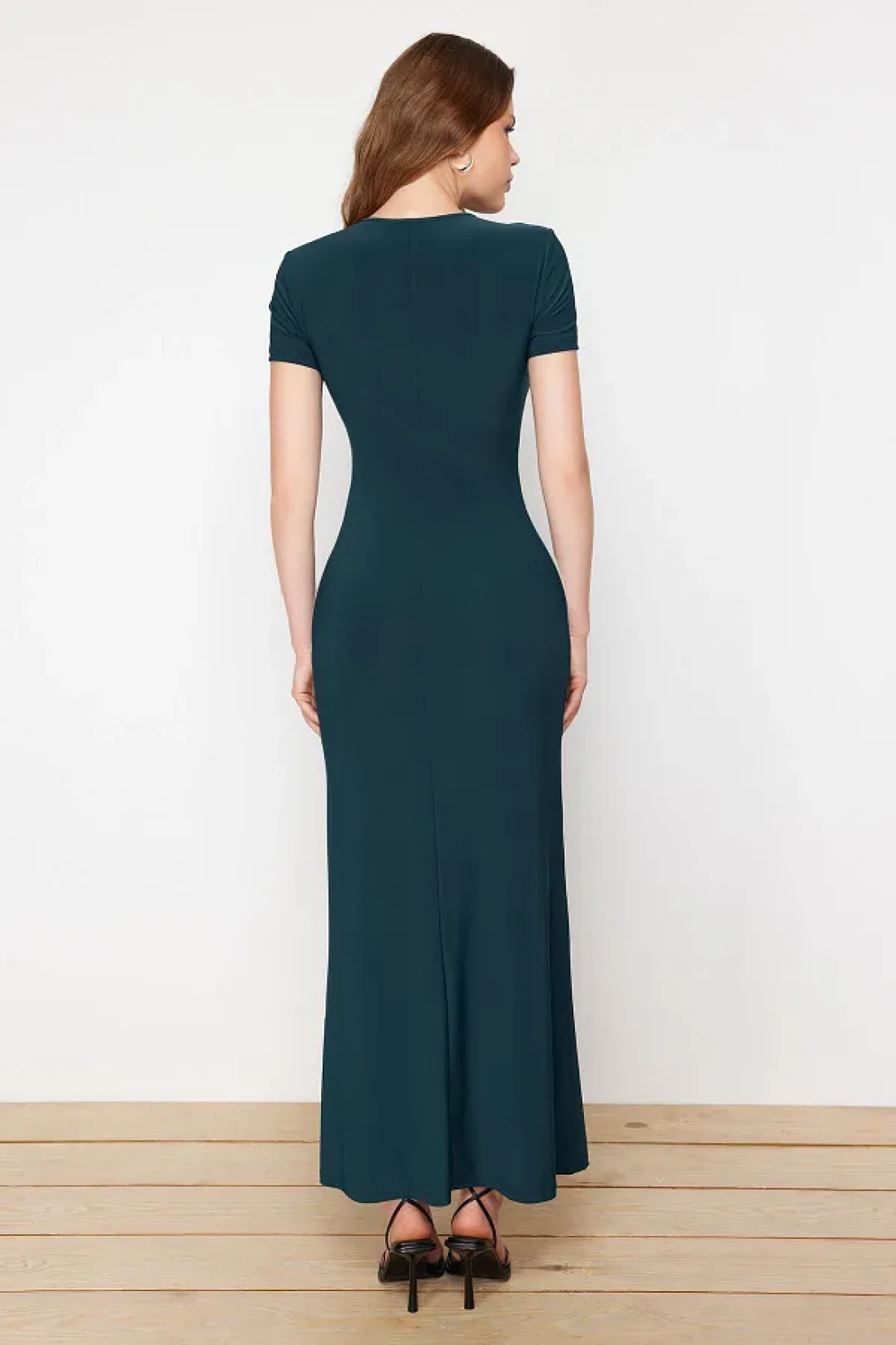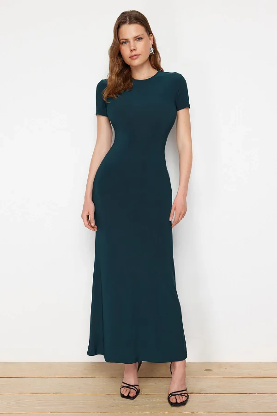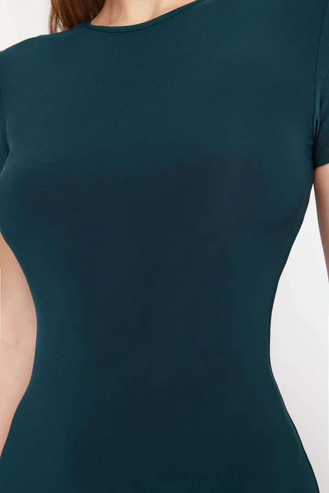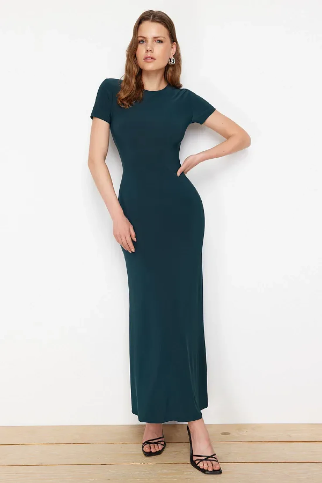 Collection Emerald Green Short Sleeve Fitted Crew Neck Flexible Knitted Maxi Pencil Dress TWOSS24EL00097