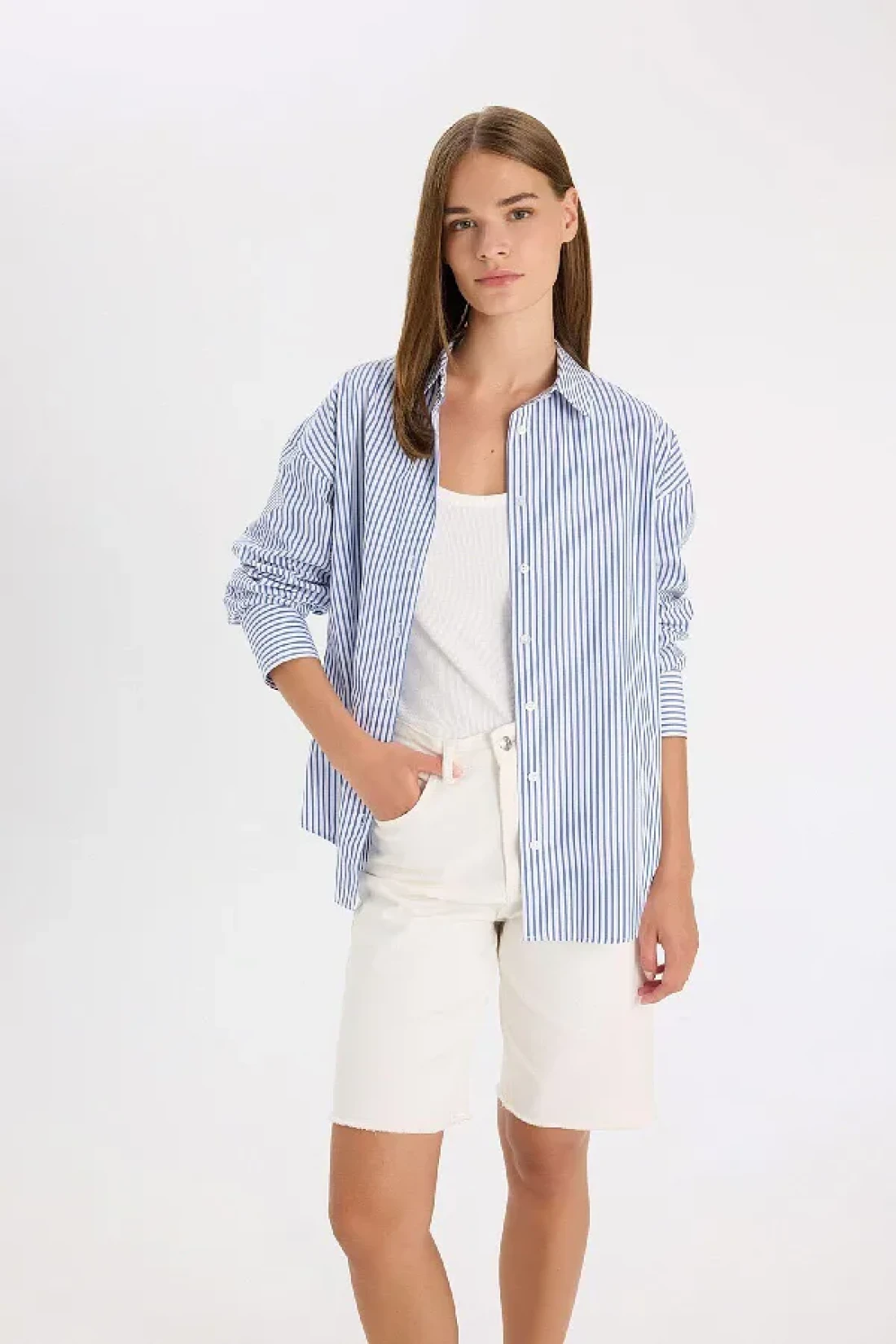 Defacto Oversize Wide Fit Striped Poplin Long Sleeve Shirt D4899Ax24Au