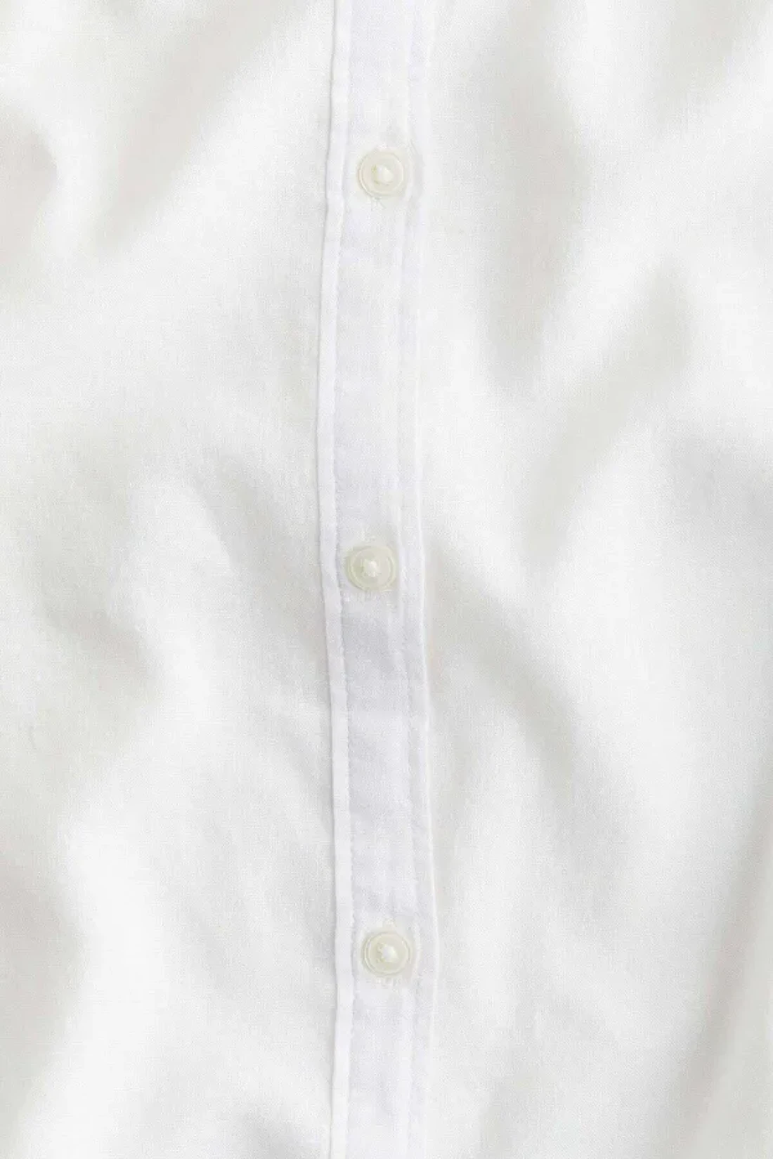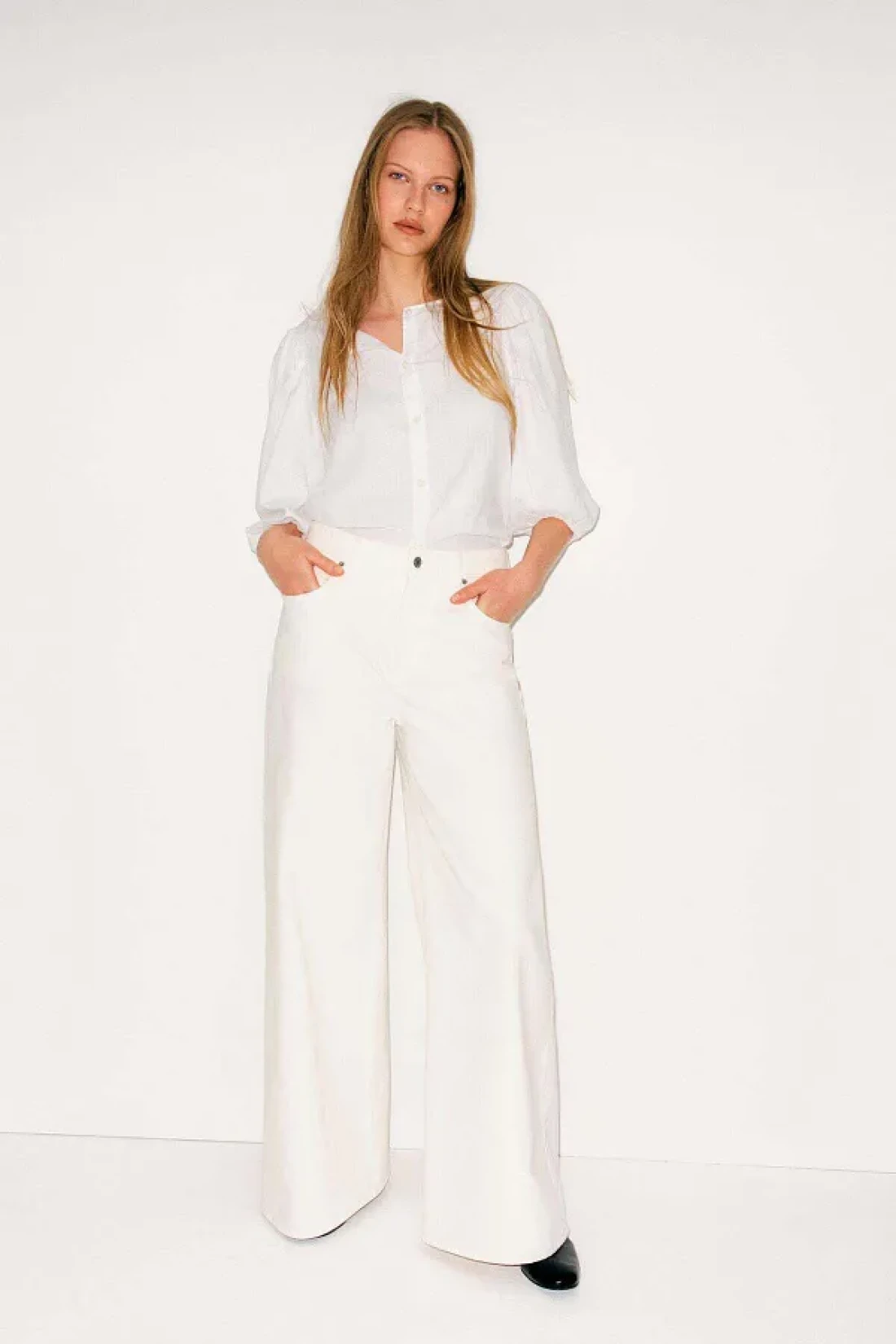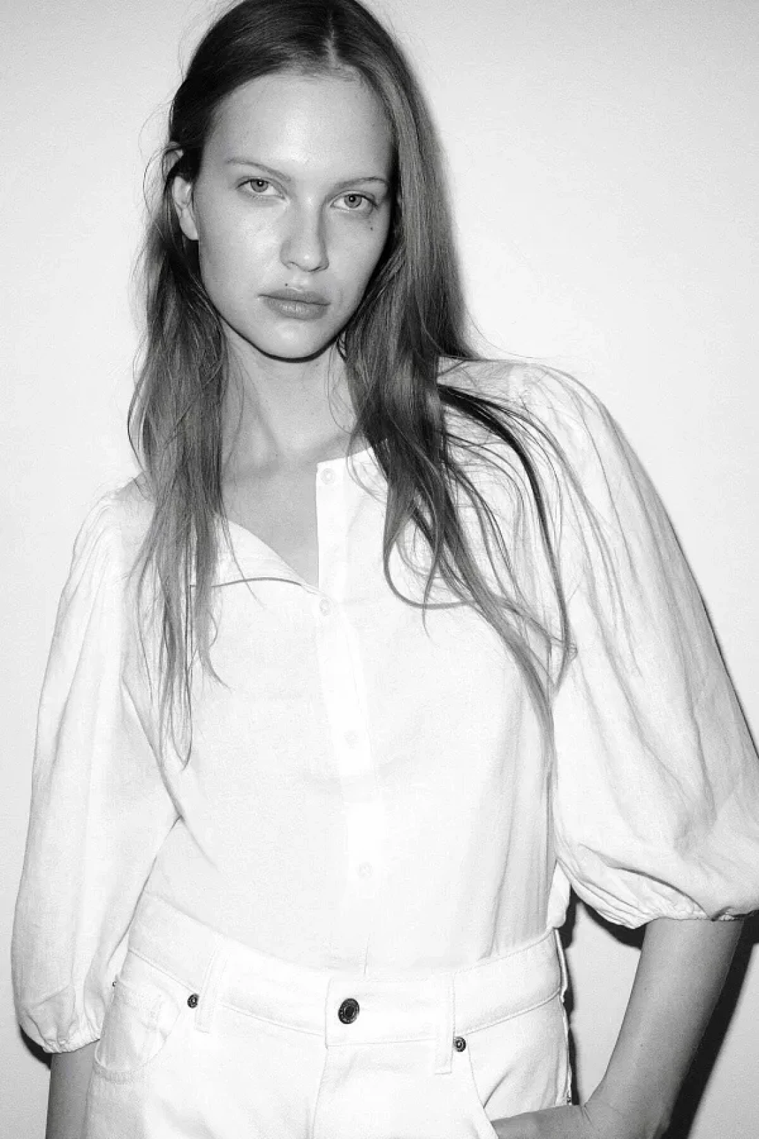 Round neckline, buttons down the front and 3/4-length balloon sleeves with elasticated cuffs.