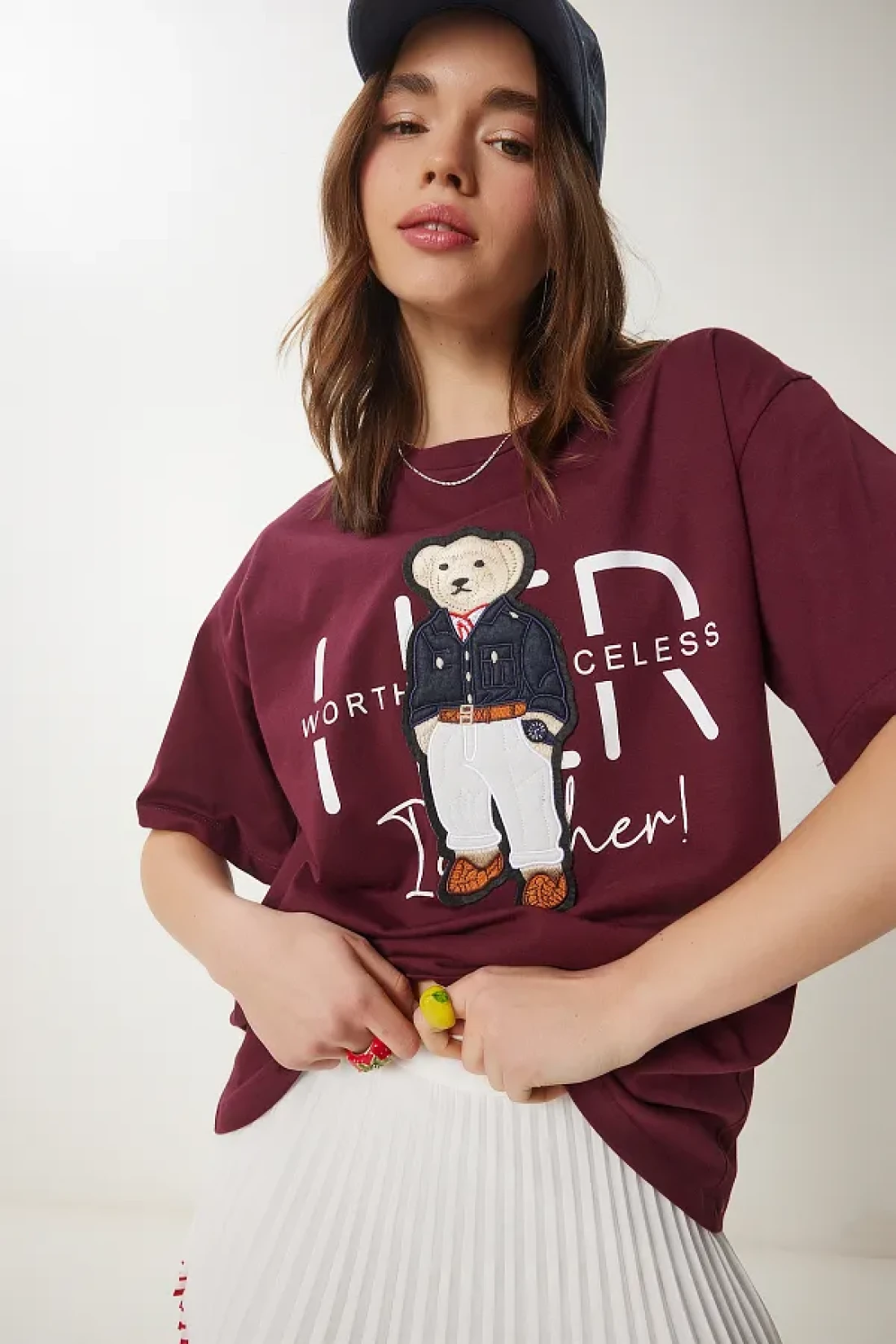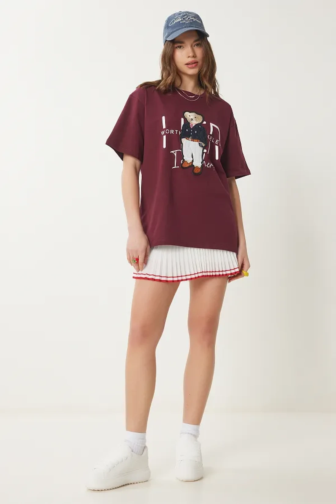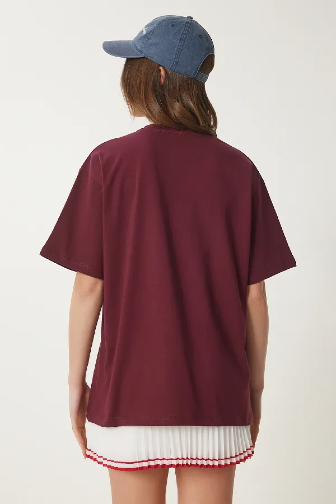 Happiness İstanbul Women's Oversize Burgundy Embroidered Cotton T-Shirt Cr00452