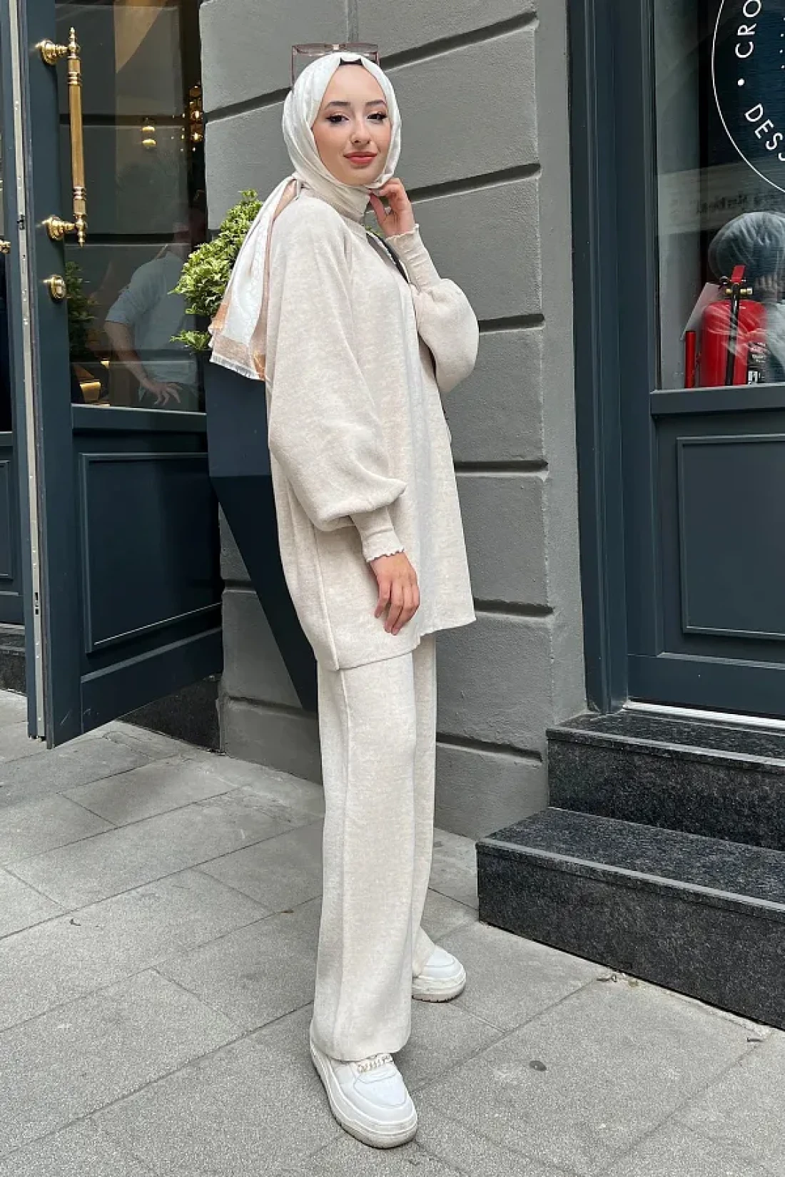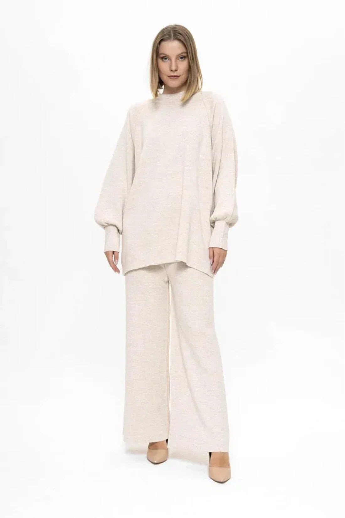The striped patterned balloon sleeve knitwear set, which offers a modern and stylish look, provides comfort and style suitable for daily use. thanks to its oversized design, it provides comfortable use and freedom of movement with its wide cut. the knitwear fabric offers comfort and breathability all day long with its soft texture. its long-sleeved design provides an ideal temperature balance during seasonal transitions. with its bicycle collar detail, it creates a simple and elegant style, appealing to all age groups. it is specially designed for hijab clothing collection, offering elegance and hijab principles together. the wide-leg trousers allow for comfortable movement while attracting attention with its trendy silhouette. with its standard size, it adapts to different body types, making it suitable for all sizes. It is ideal for daily use in casual environments, prioritizing both comfort and elegance.
