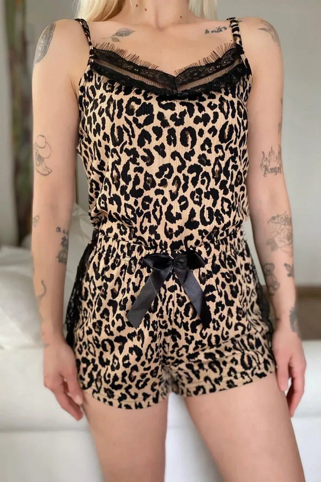 featured with dark brown leopard print, this pajamas set is vivid and clear looking with digital printing technology.
