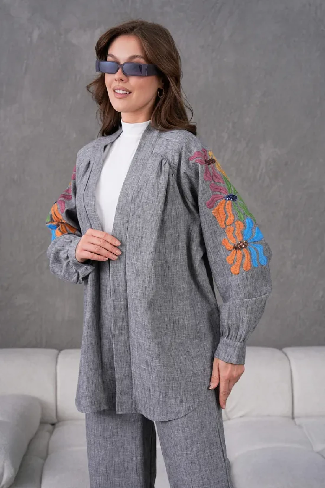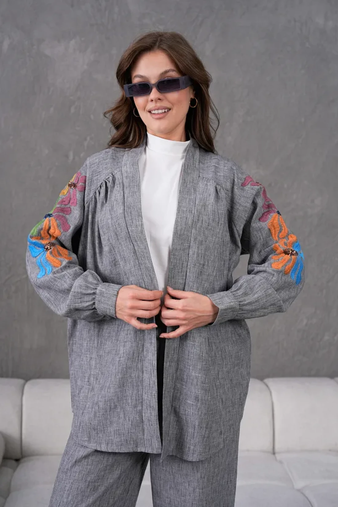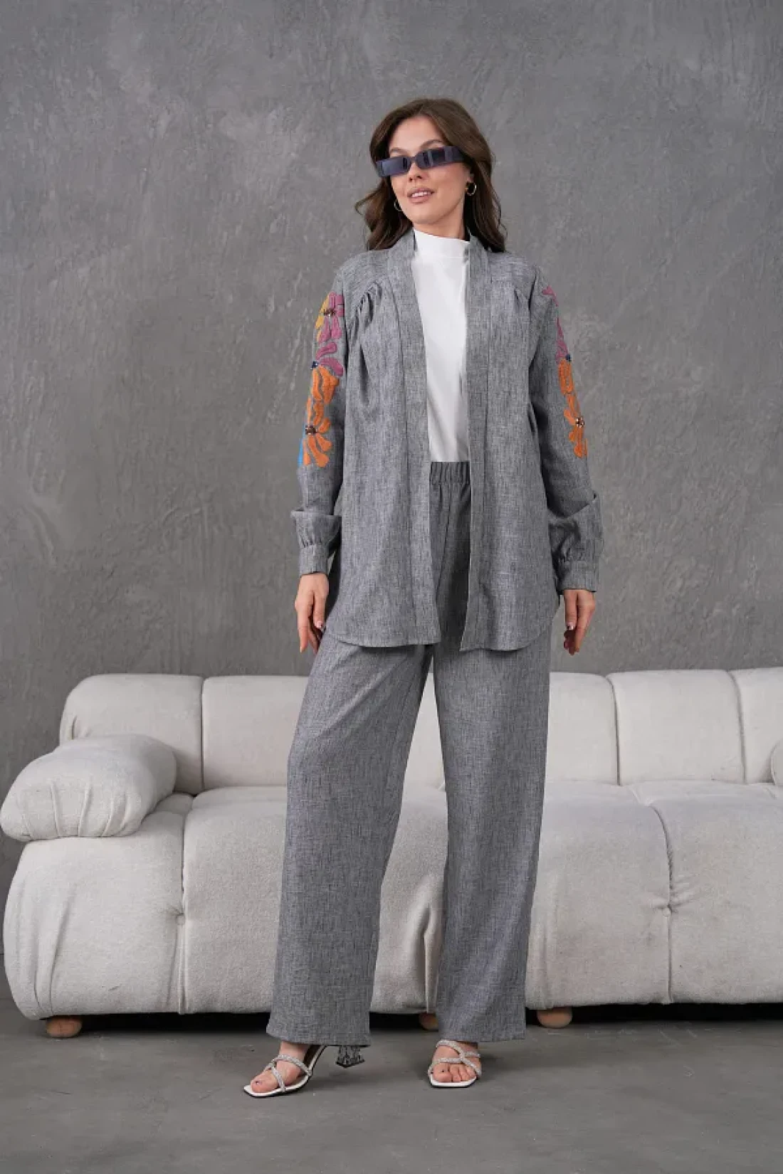 Miss Allos Women's Back and Sleeves Sequin Sequin Embroidered Linen Kimono Coat and Pants Bottom Top Suit