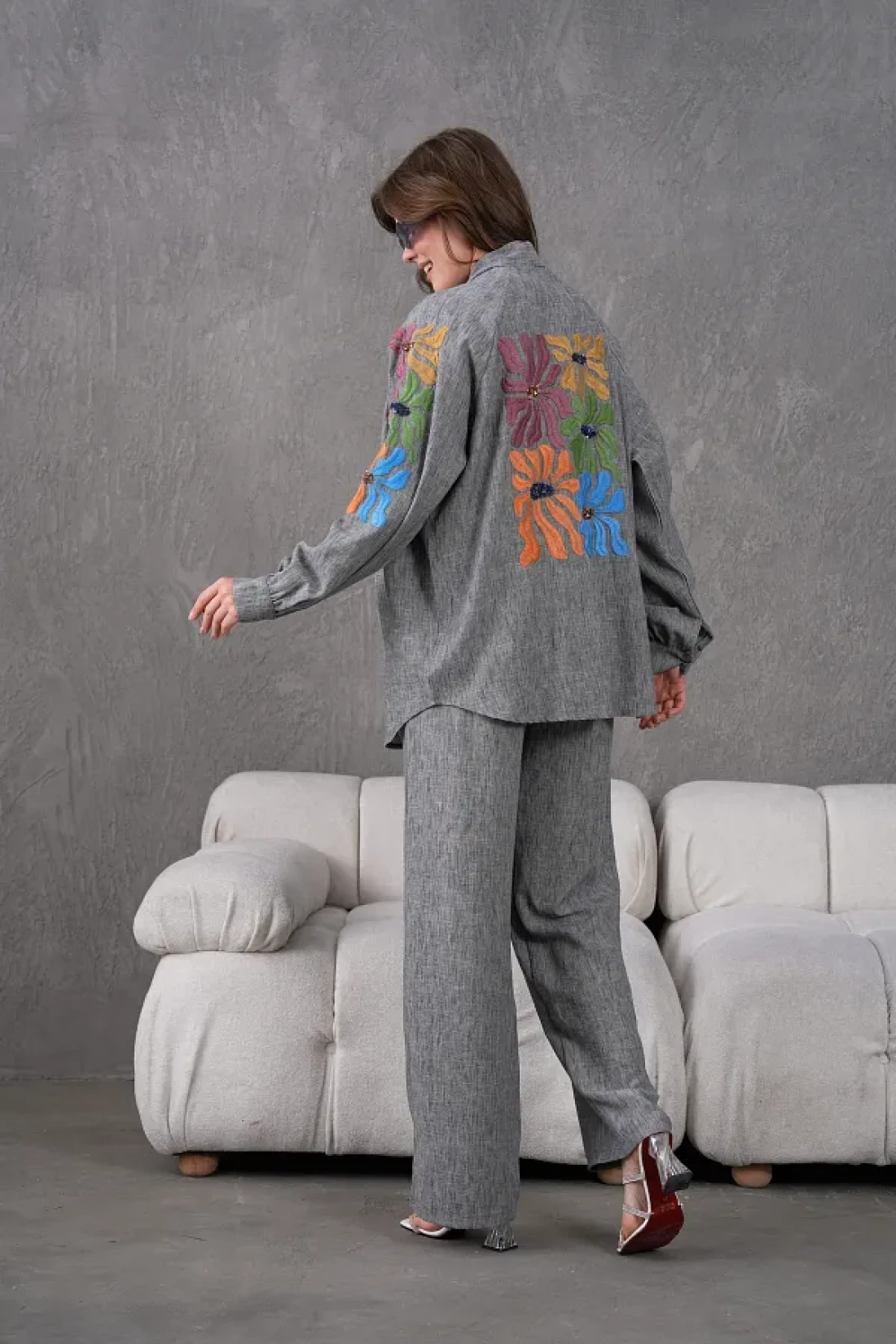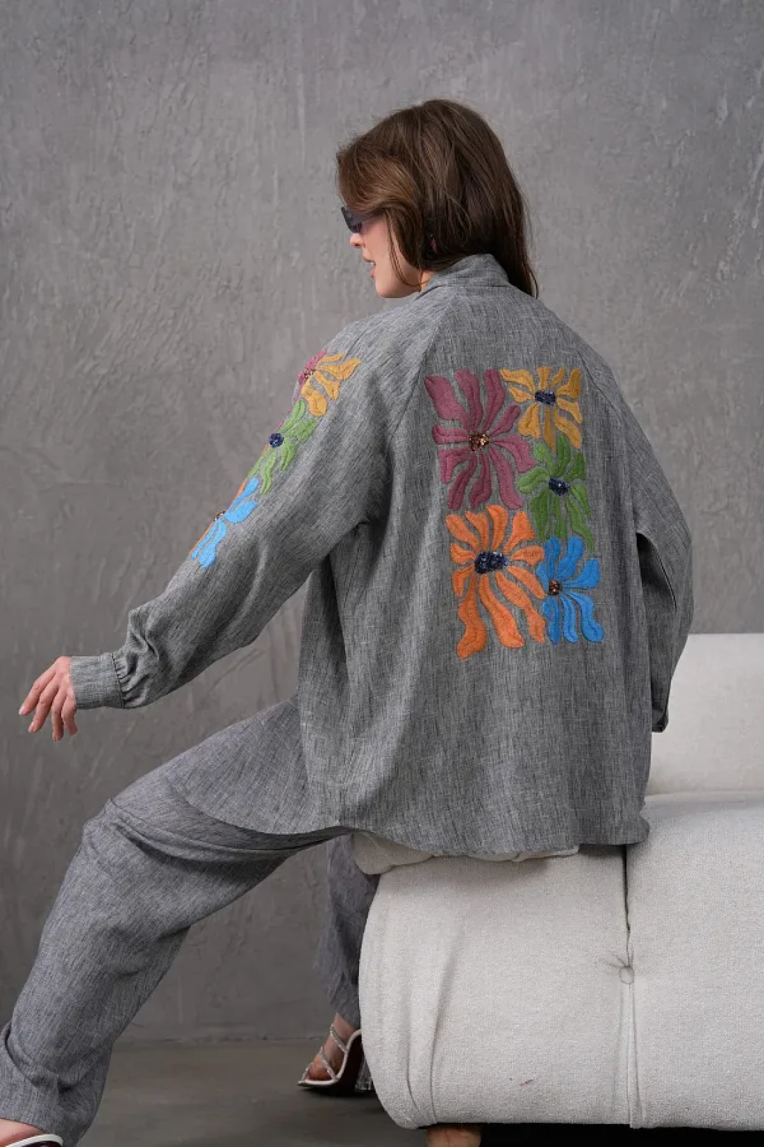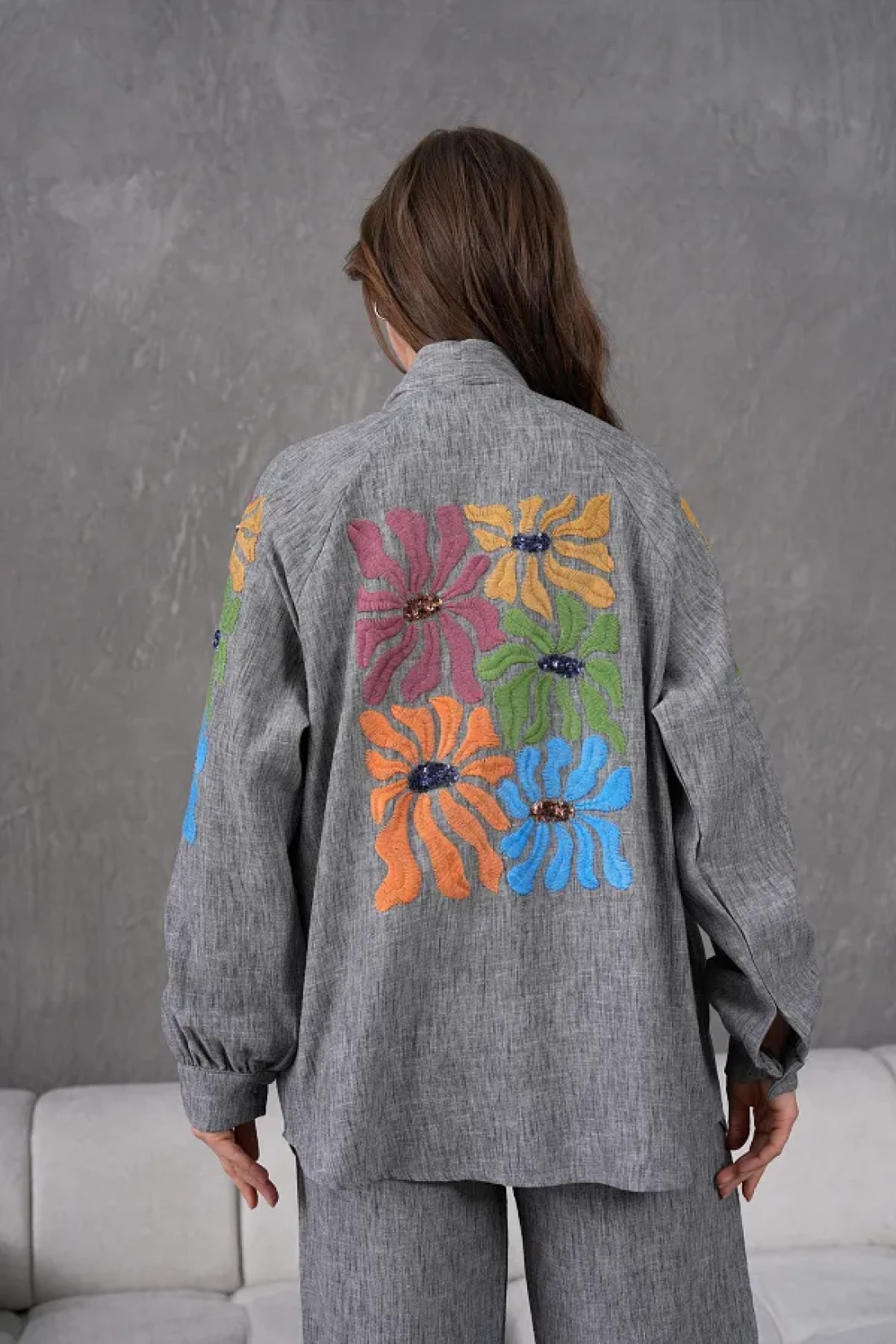 Miss Allos Women's Back and Sleeves Sequin Sequin Embroidered Linen Kimono Coat and Pants Bottom Top Suit