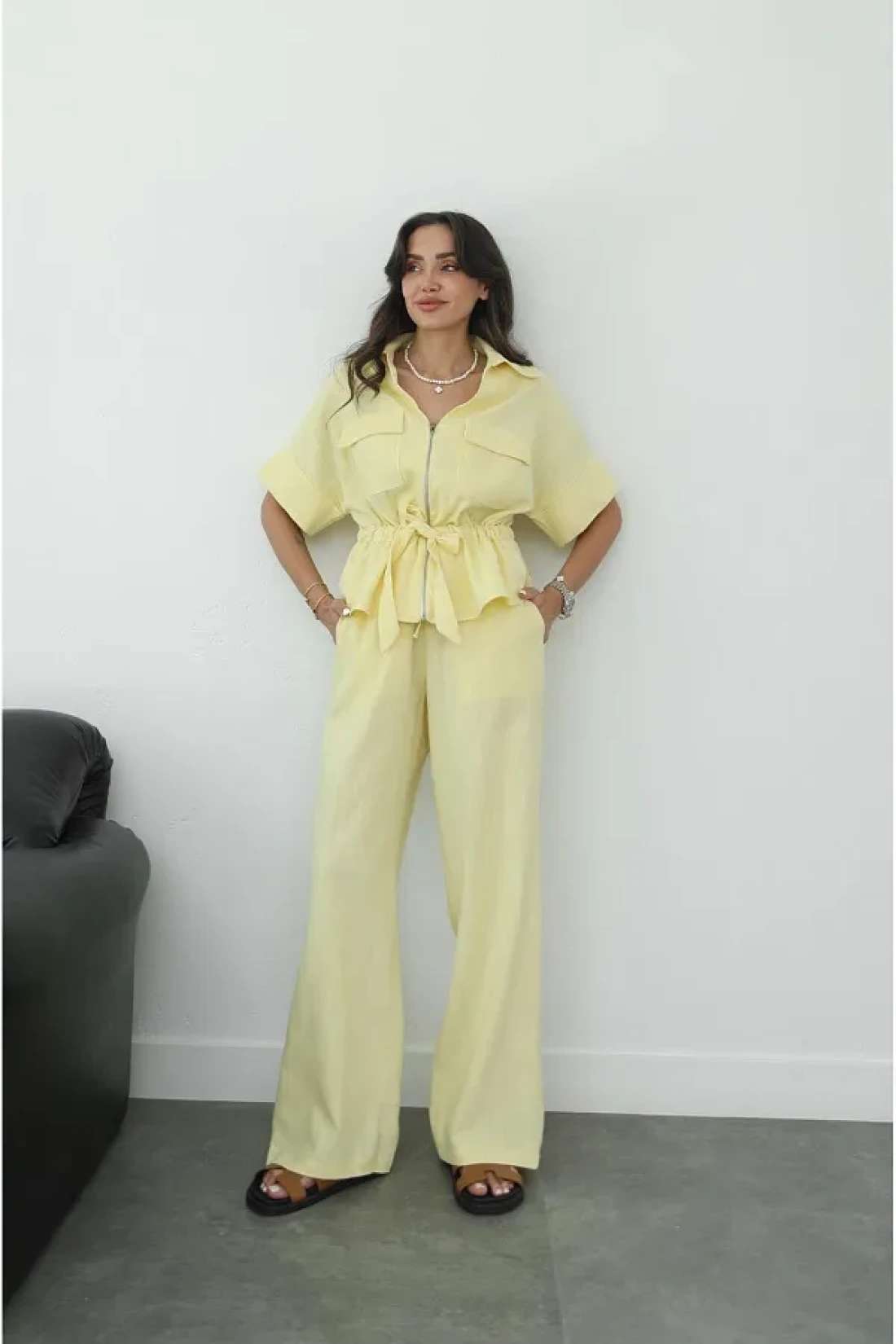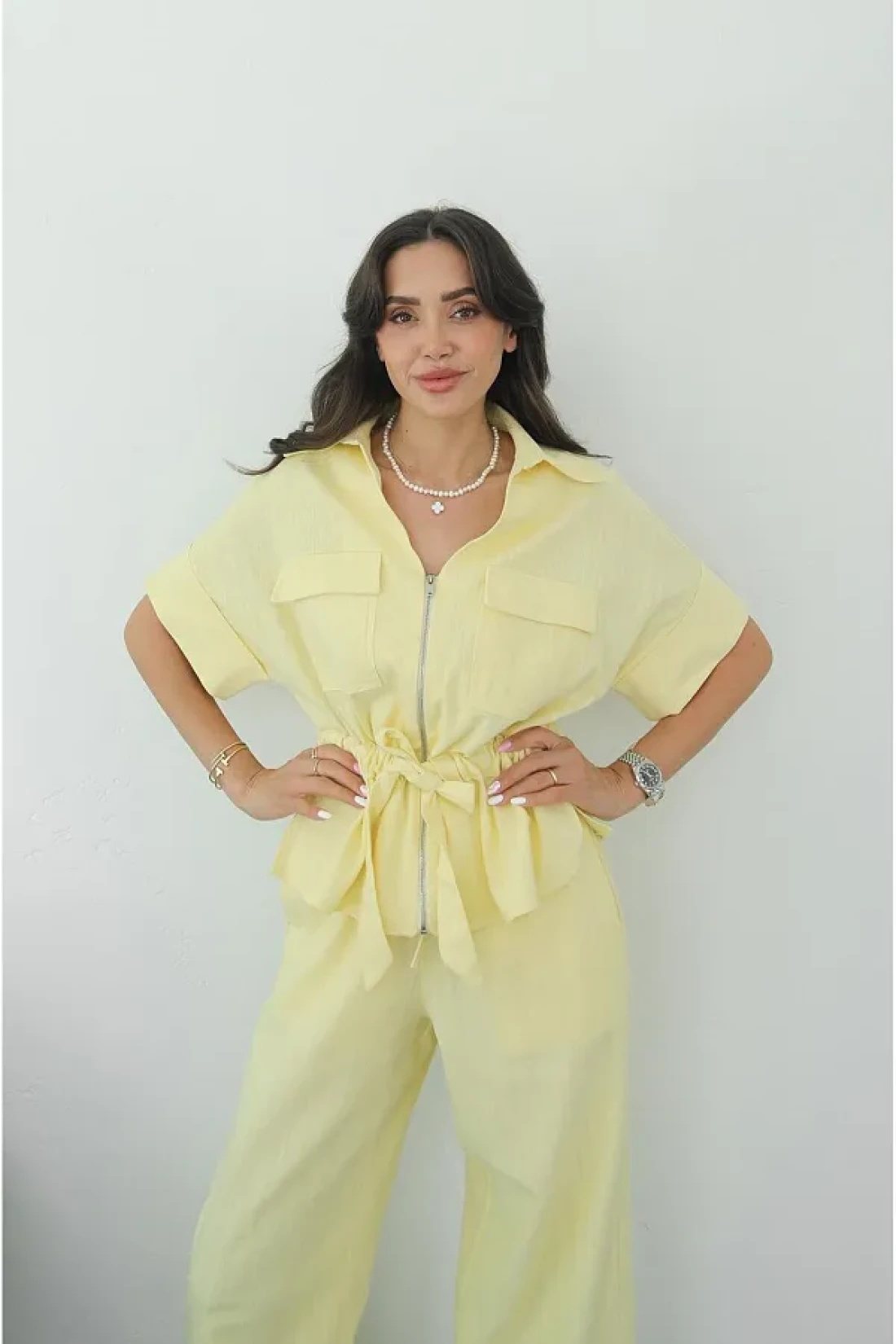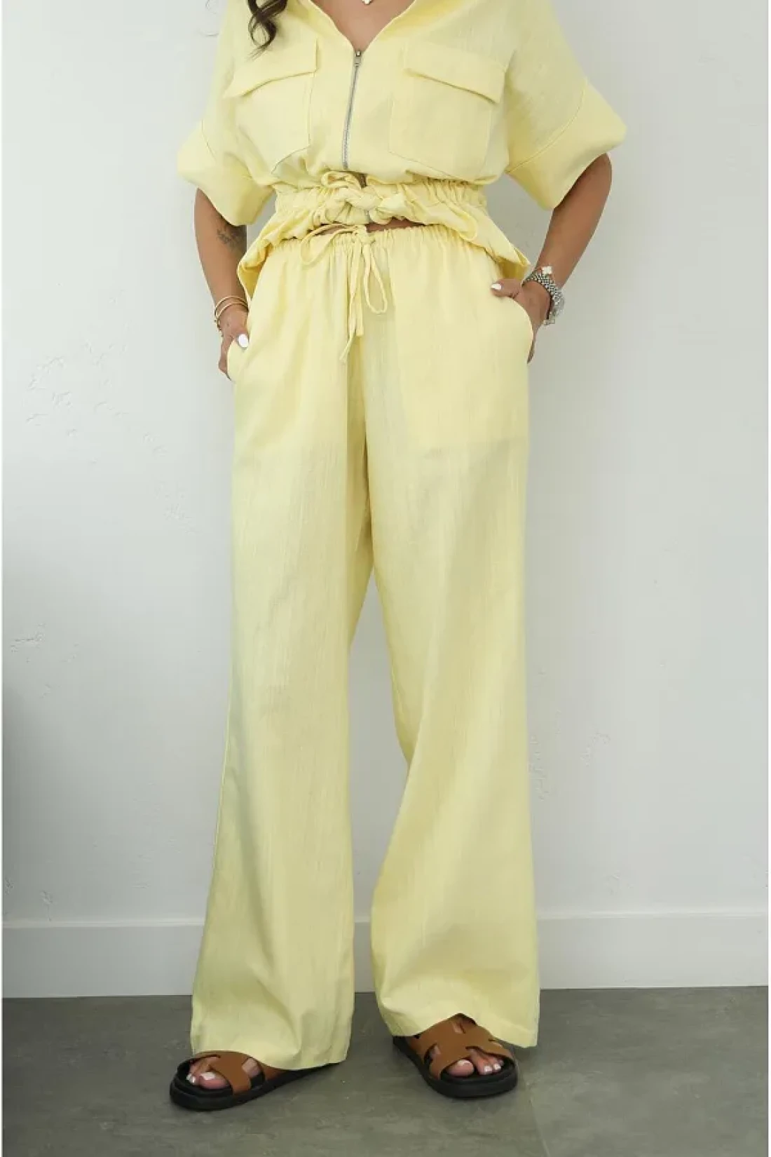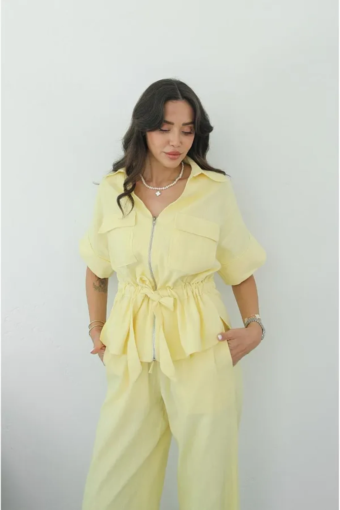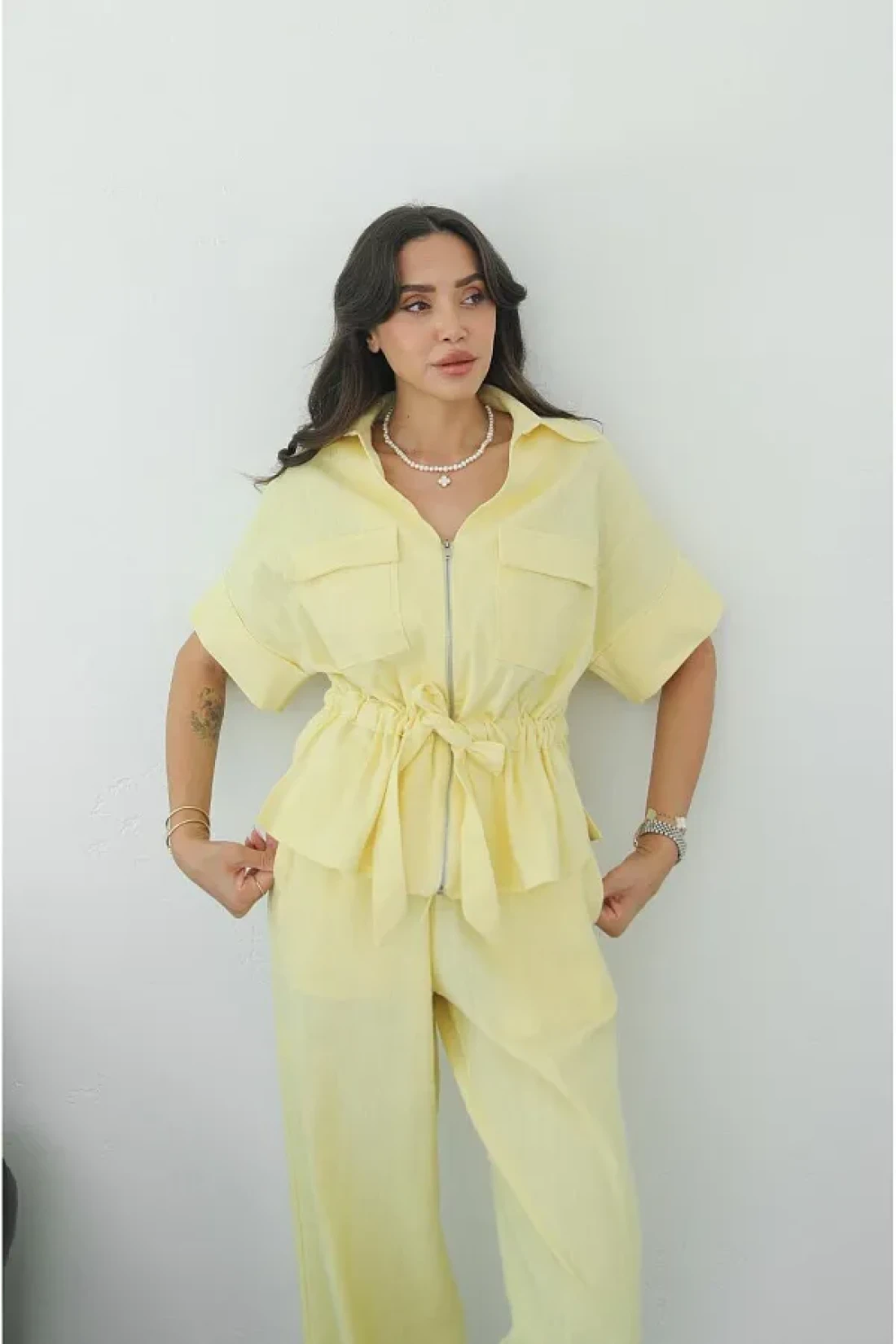 Havoş Yellow Front Zippered Belted Blouse Trousers Set