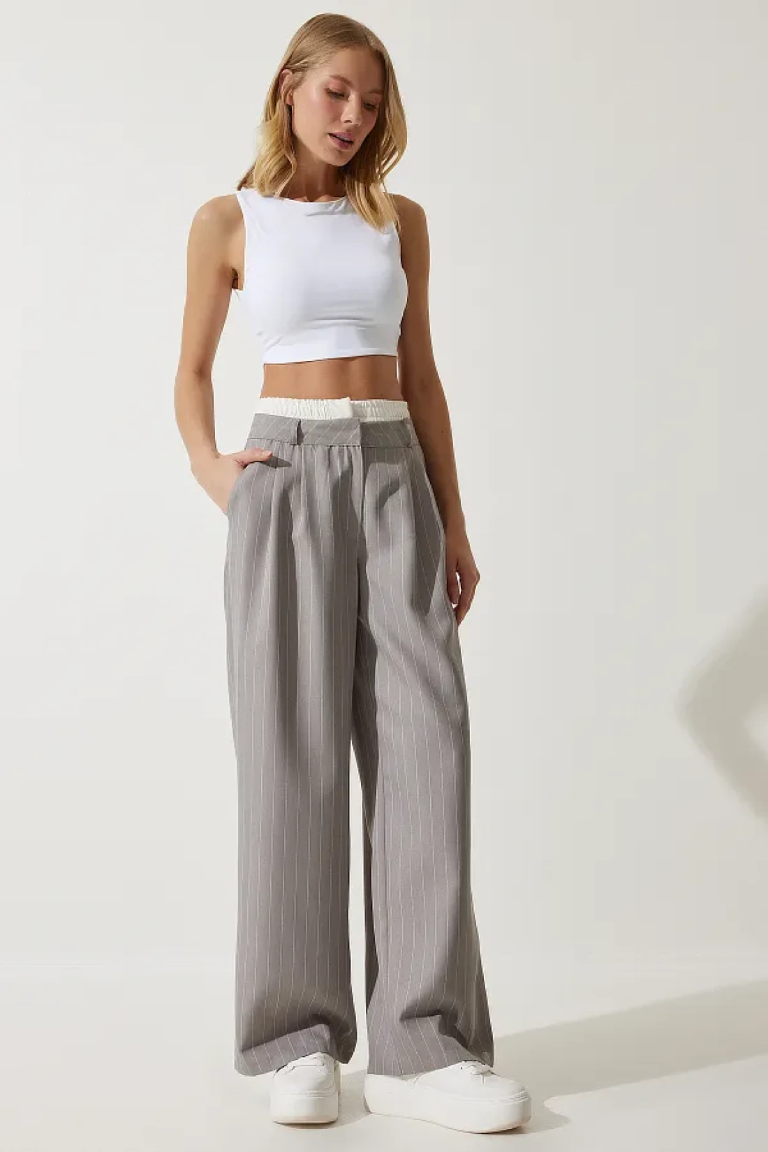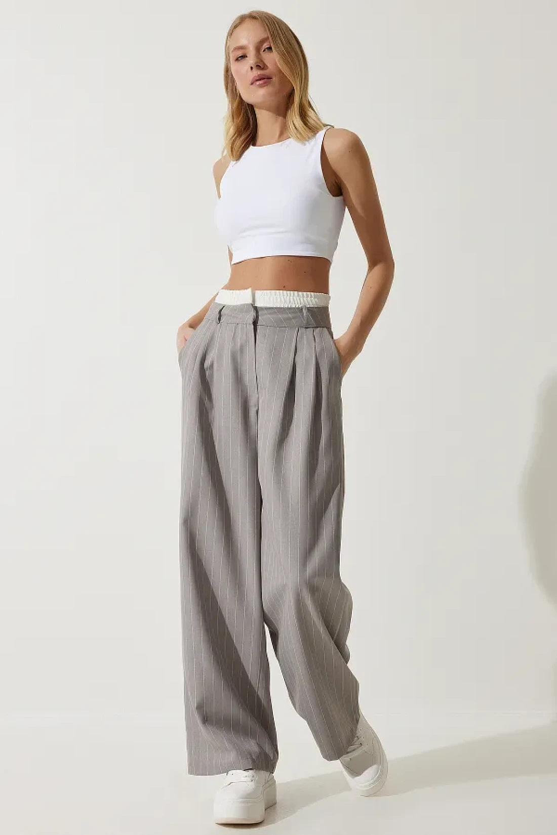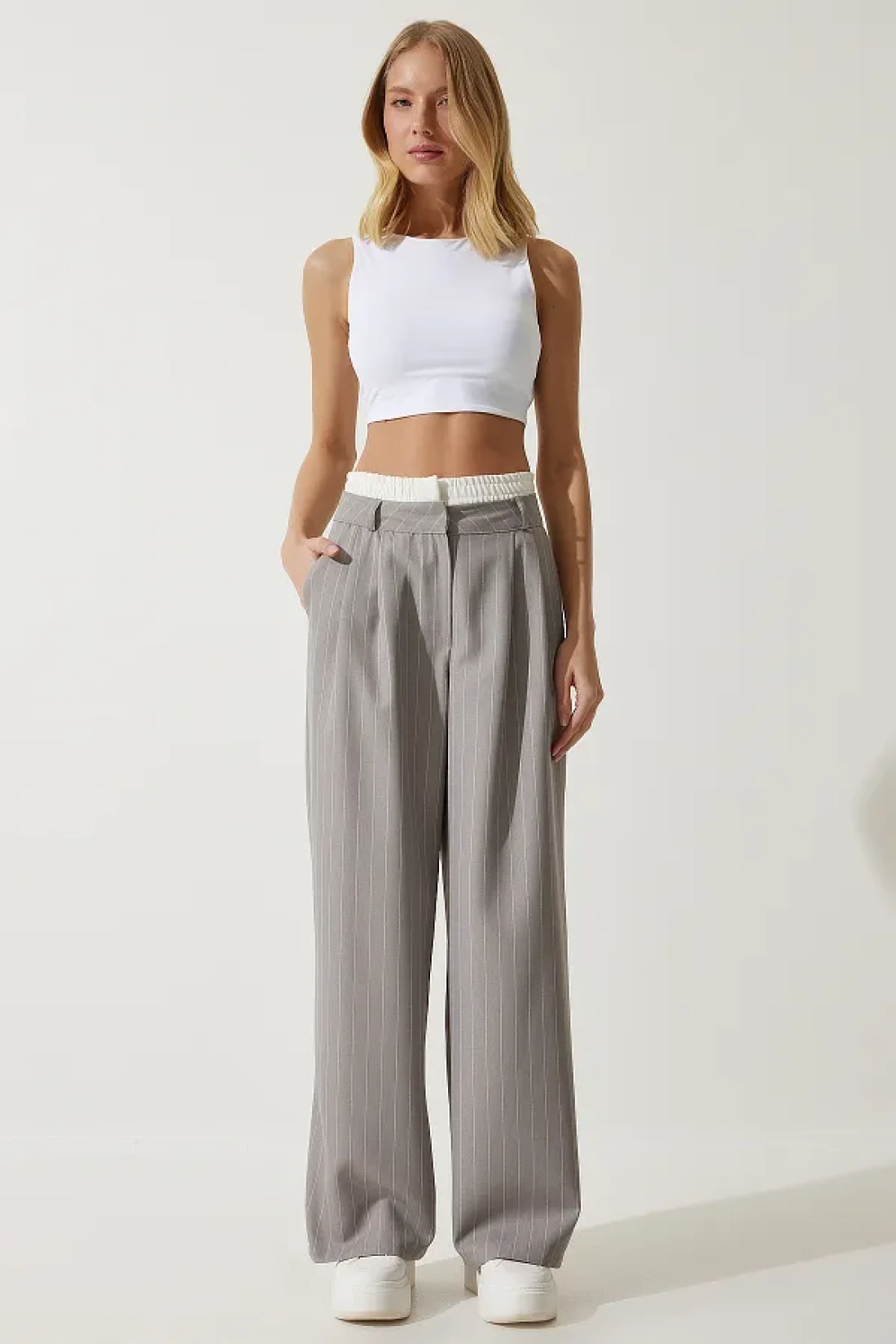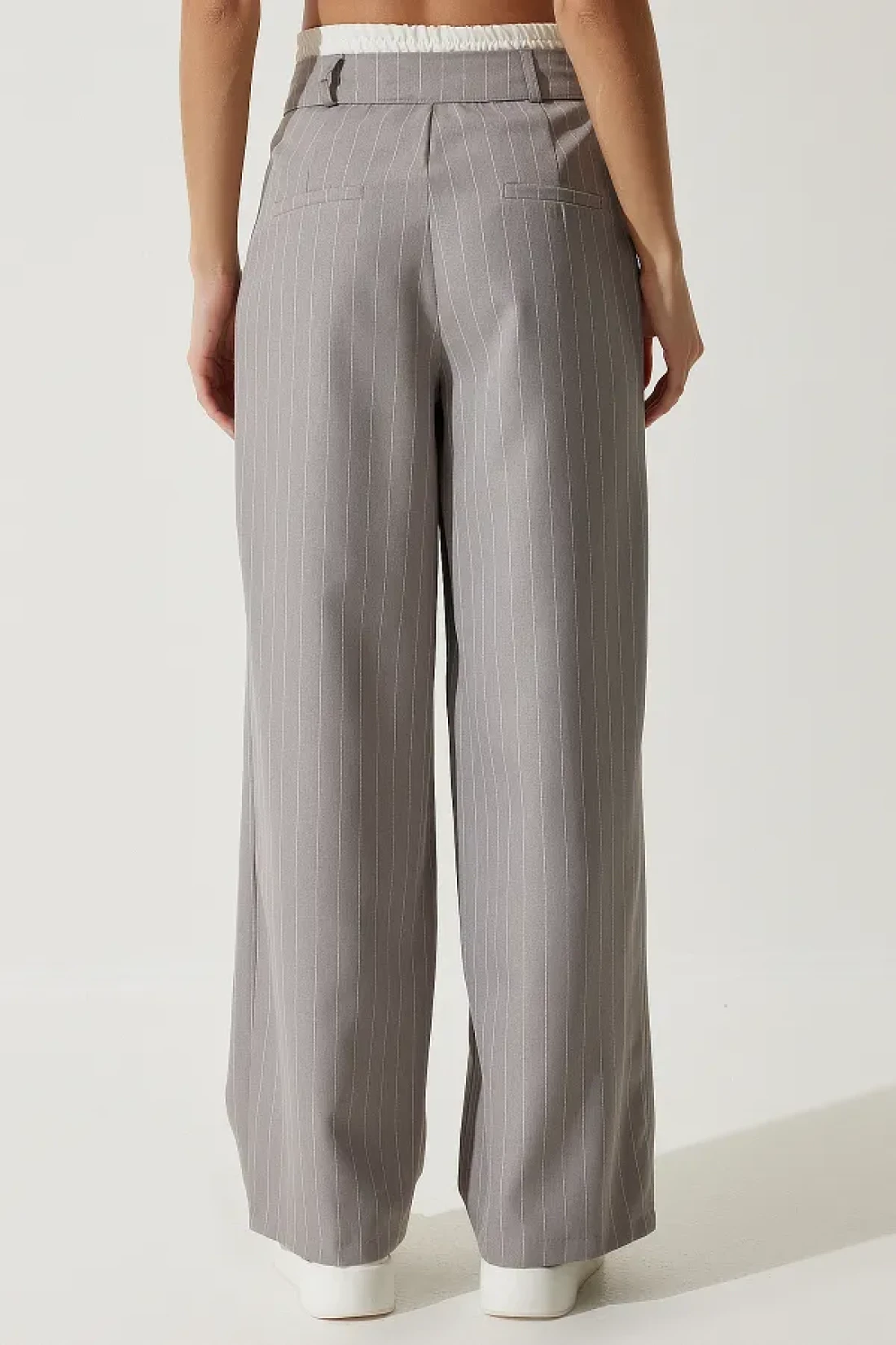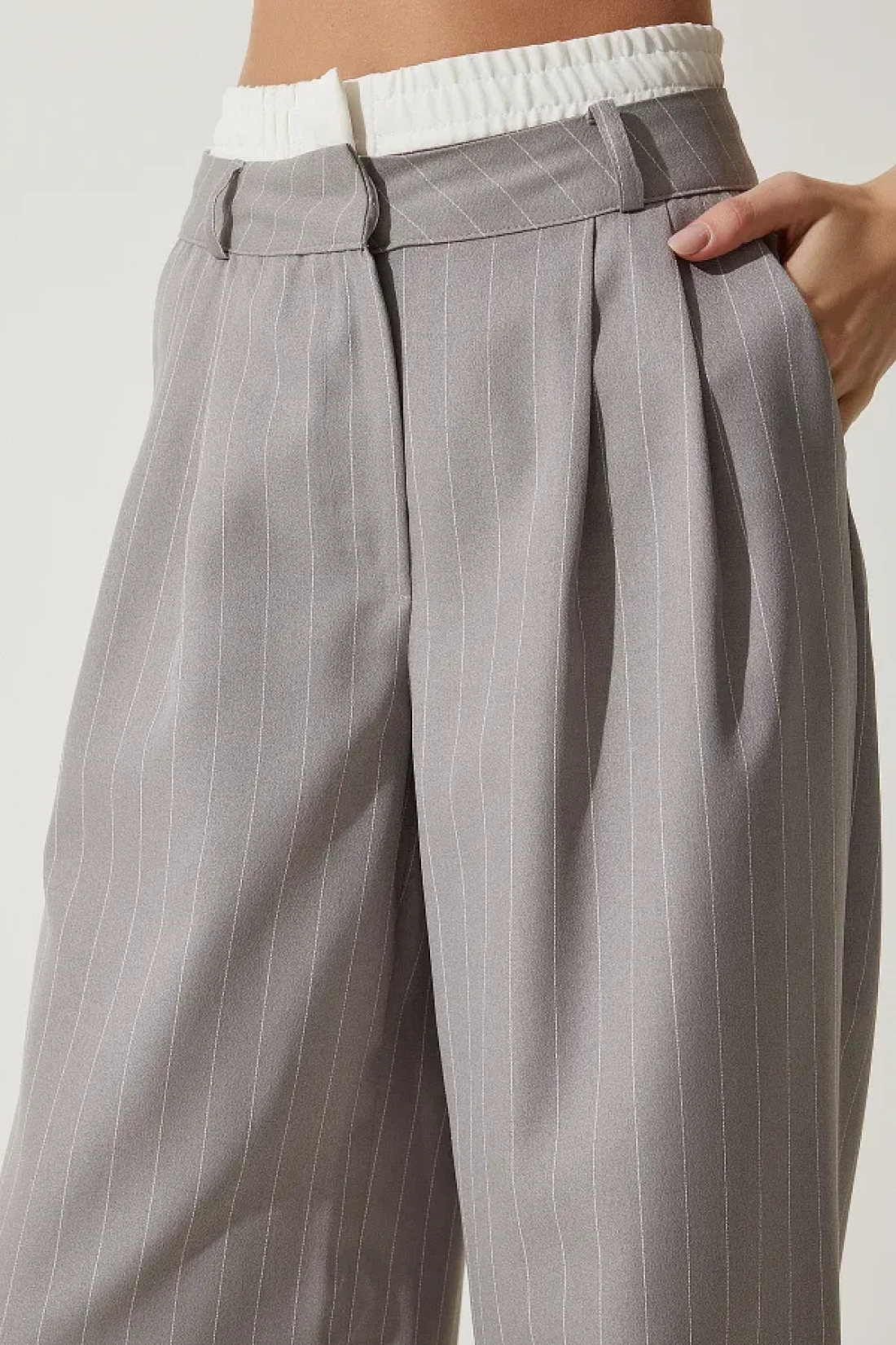 Happiness İstanbul Women's Gray Contrast Waist Detailed Striped Woven Trousers CI00104