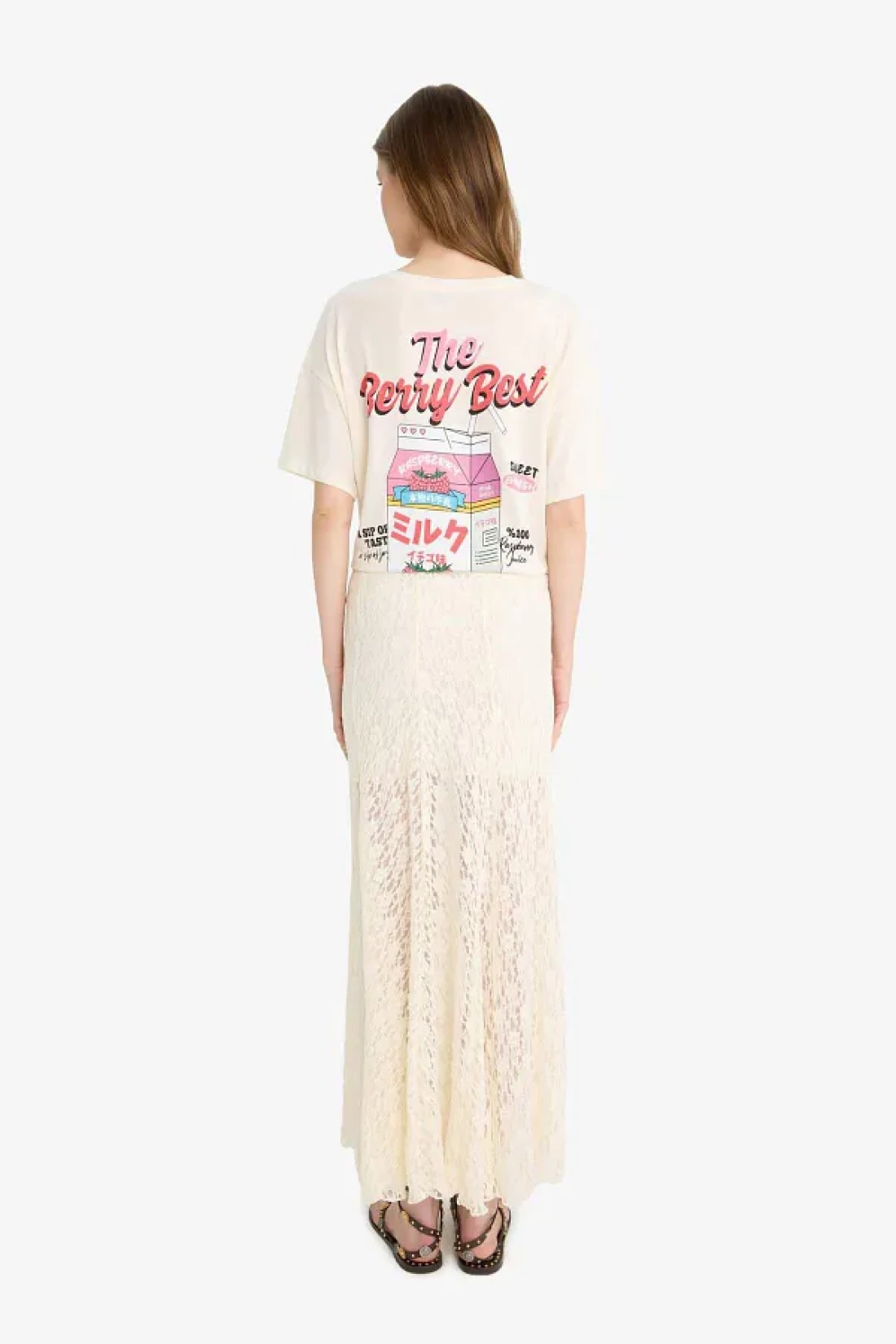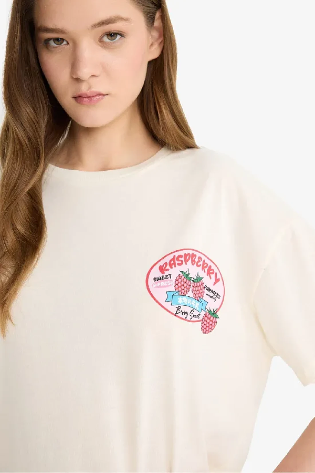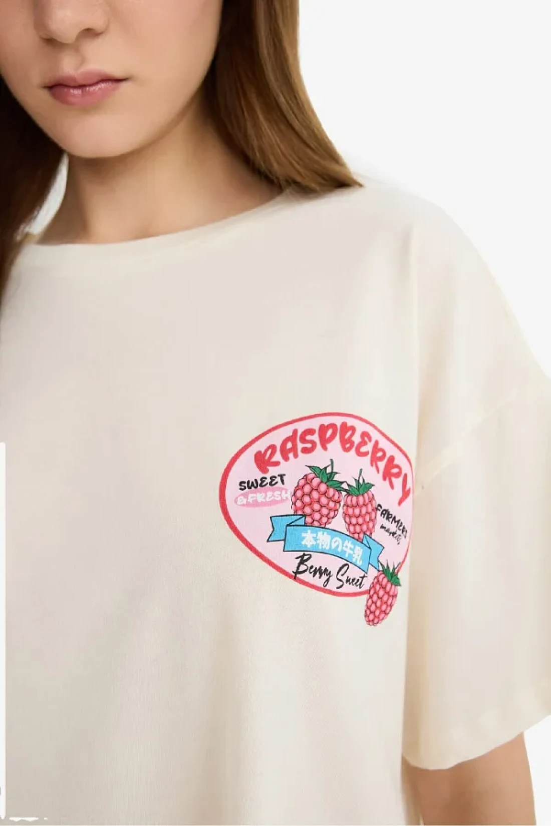 Women's short-sleeved t-shirt with a Oversized wide print from the coool brand for adults. Photo Printed fruit patterned, sustainable ecru t-shirt.