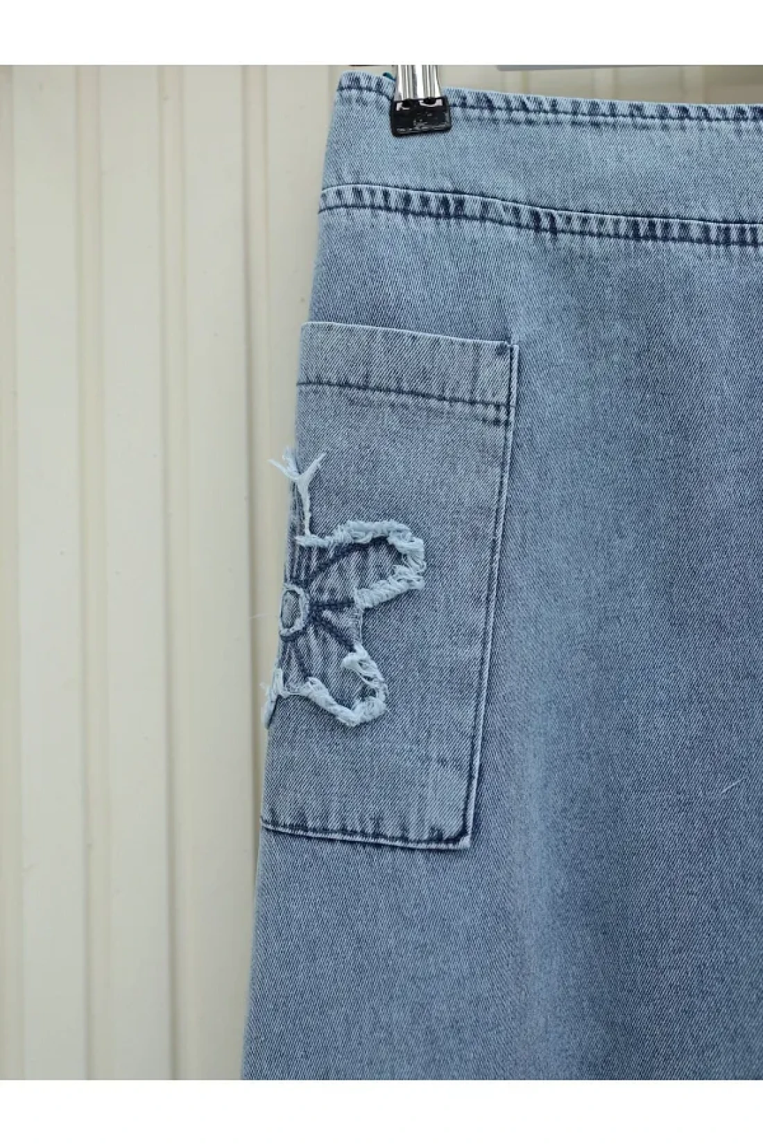 Patterned Skirt Elastic Waist Vest Skirt Denim Set - Ice Blue