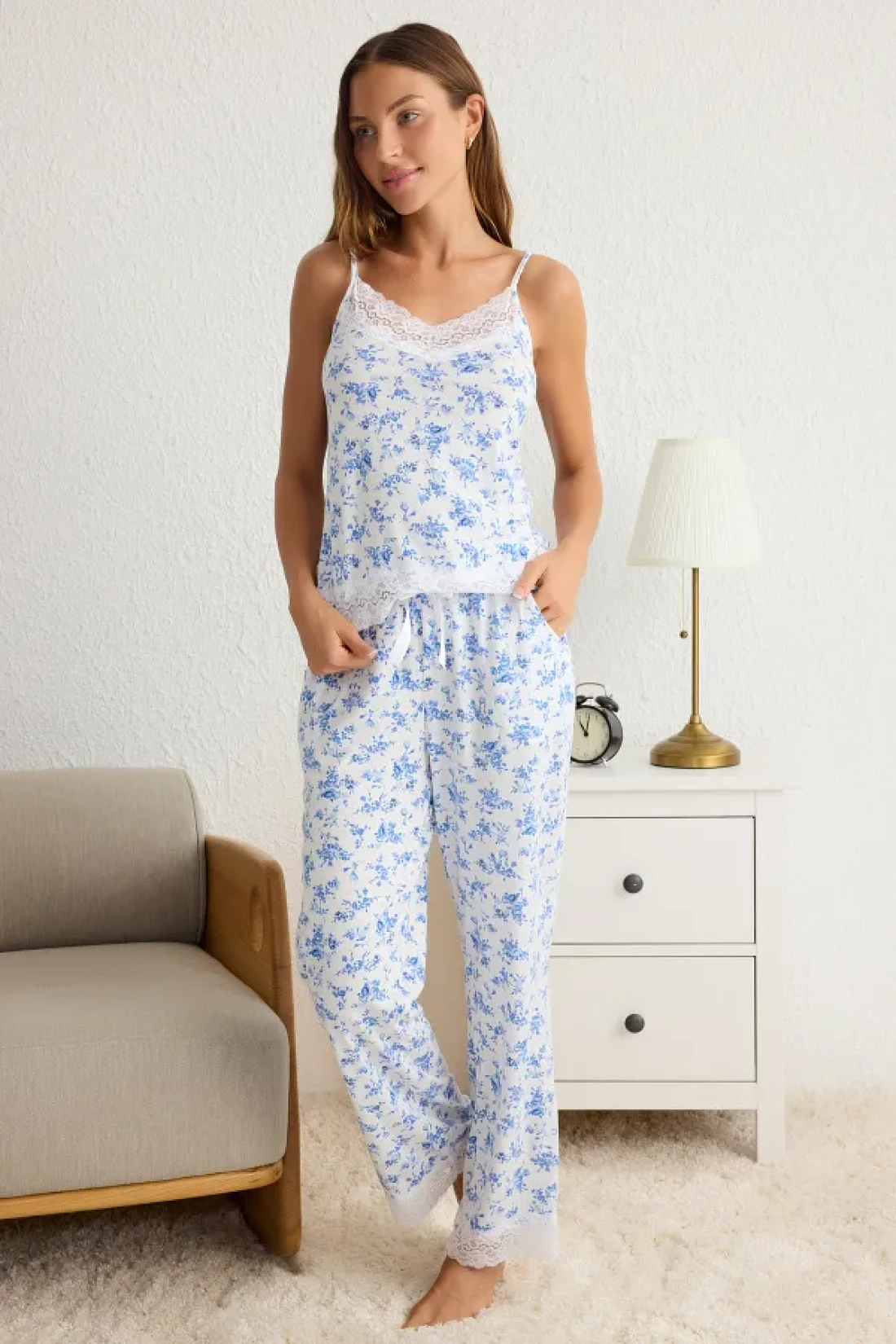 Collection Blue-Multicolor Floral Lace and Ribbon/Bow Detail Viscose Knitted Pajamas Set Thmss20Pt0134