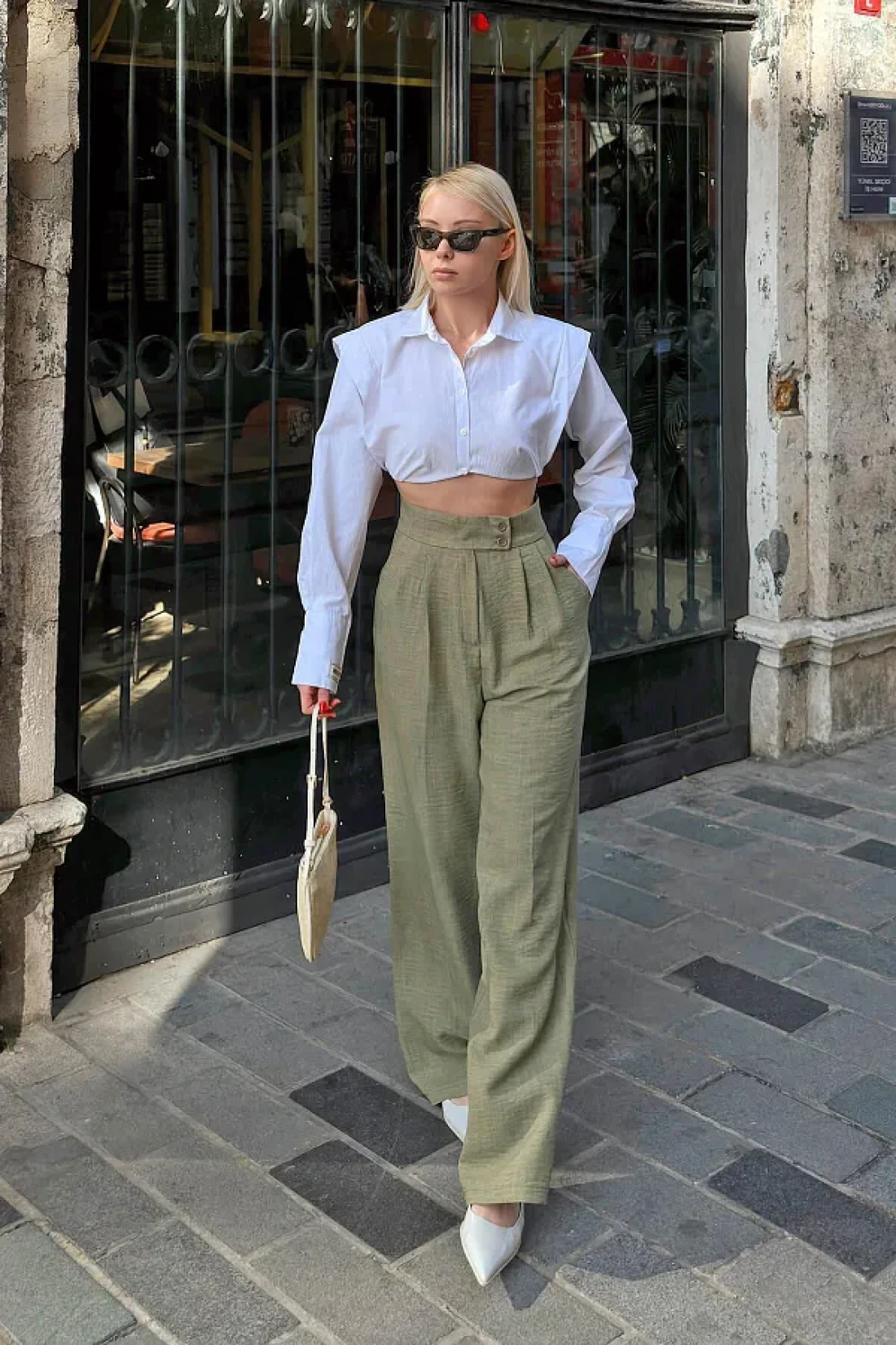 Swist Women's Palazzo Linen Trousers - Double Buttoned and Pleated