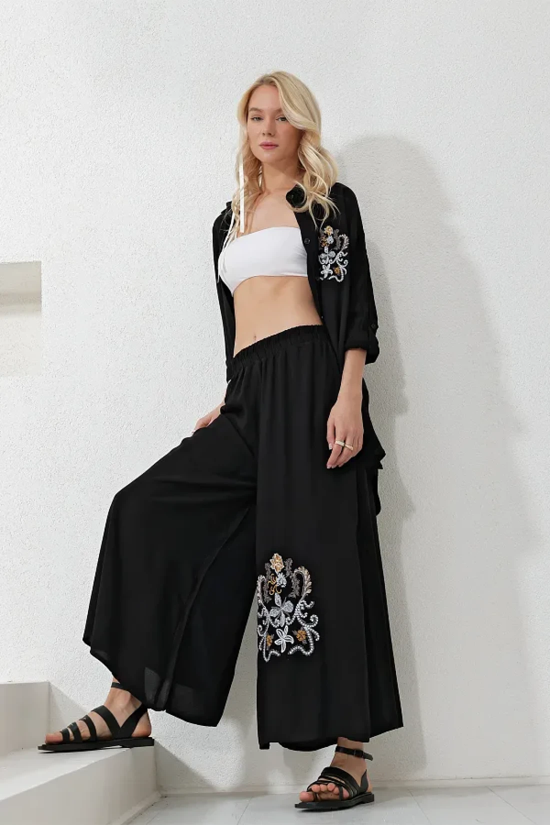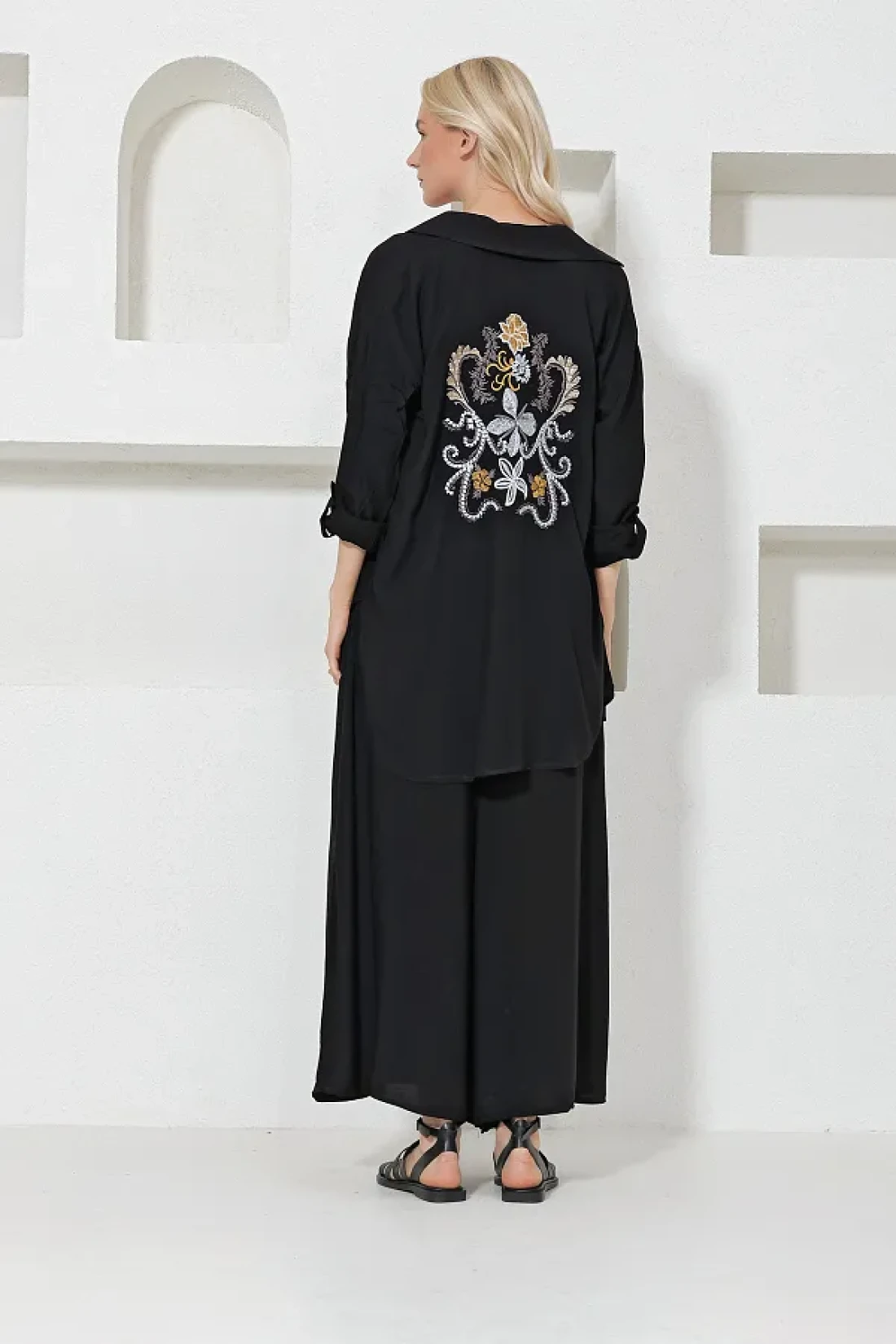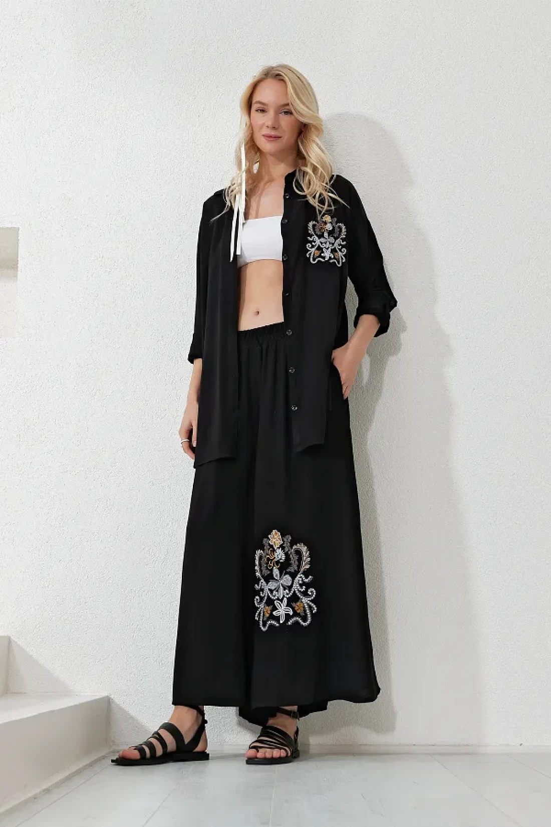 Trend Alaçatı Stili Women's Black Back and Front Embroidered Long Shirt and Loose Trousers Set ALC-X11915