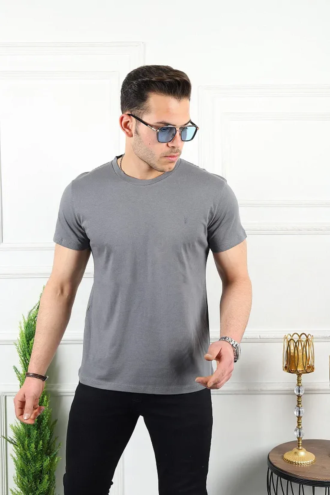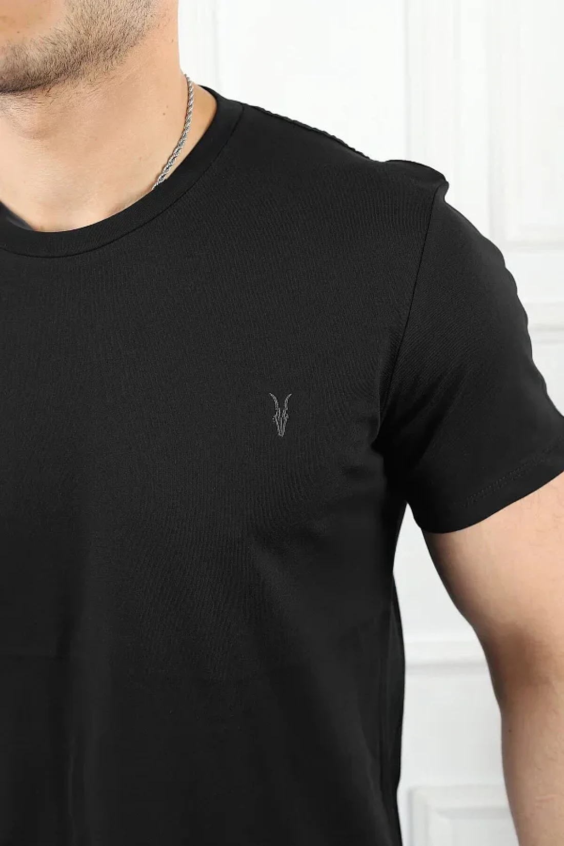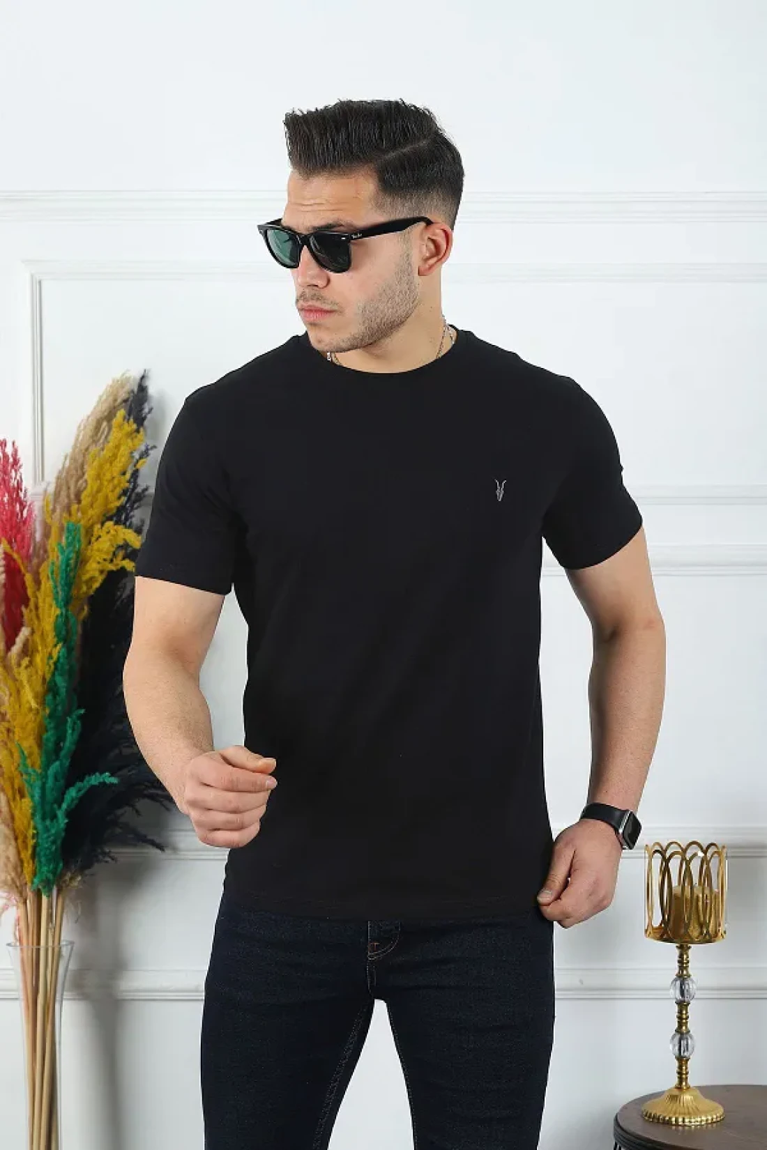 Men's black-gray-white standard fit bicycle collar %100 cotton non-shrinkage 3-pack men's t-shirt the size on the model is m. The material is 100% cotton. The patterns are standard. The collar is a bicycle collar. The product has embroidery on it. There will be no problems like shrinkage after washing the product. The collar side of the men's t-shirt is stitched with a chain. There is Ribbed Knit on the collar of the t-shirt. The advantages of the product include cotton fabric. the advantages of cotton fabric are that there are absolutely no problems such as shrinkage or color fading. Generally, many t-shirts have underarm yellowing and retain odor, and the reason for this is the quality of the fabric used to reduce costs.