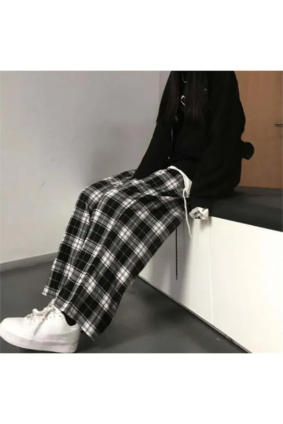 The thin cashmere cotton tracksuit with black plaid pattern on white, which attracts attention with its soft texture, can be easily preferred in all seasons.