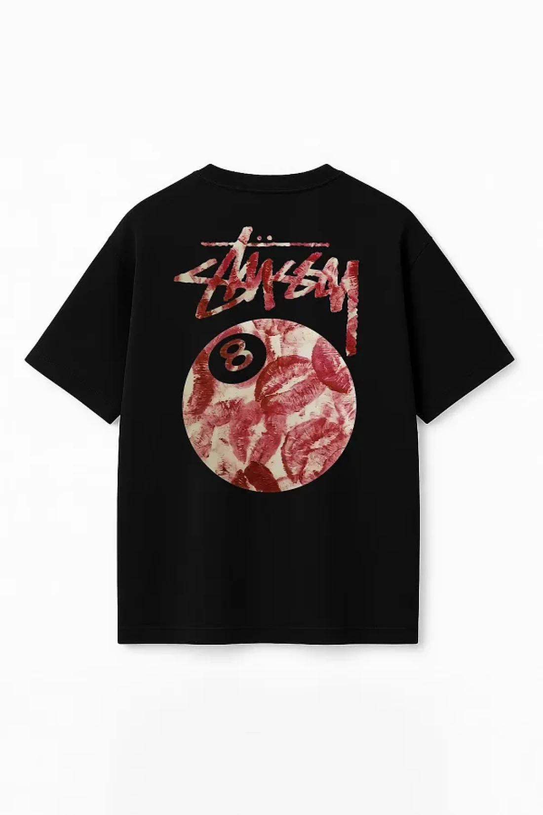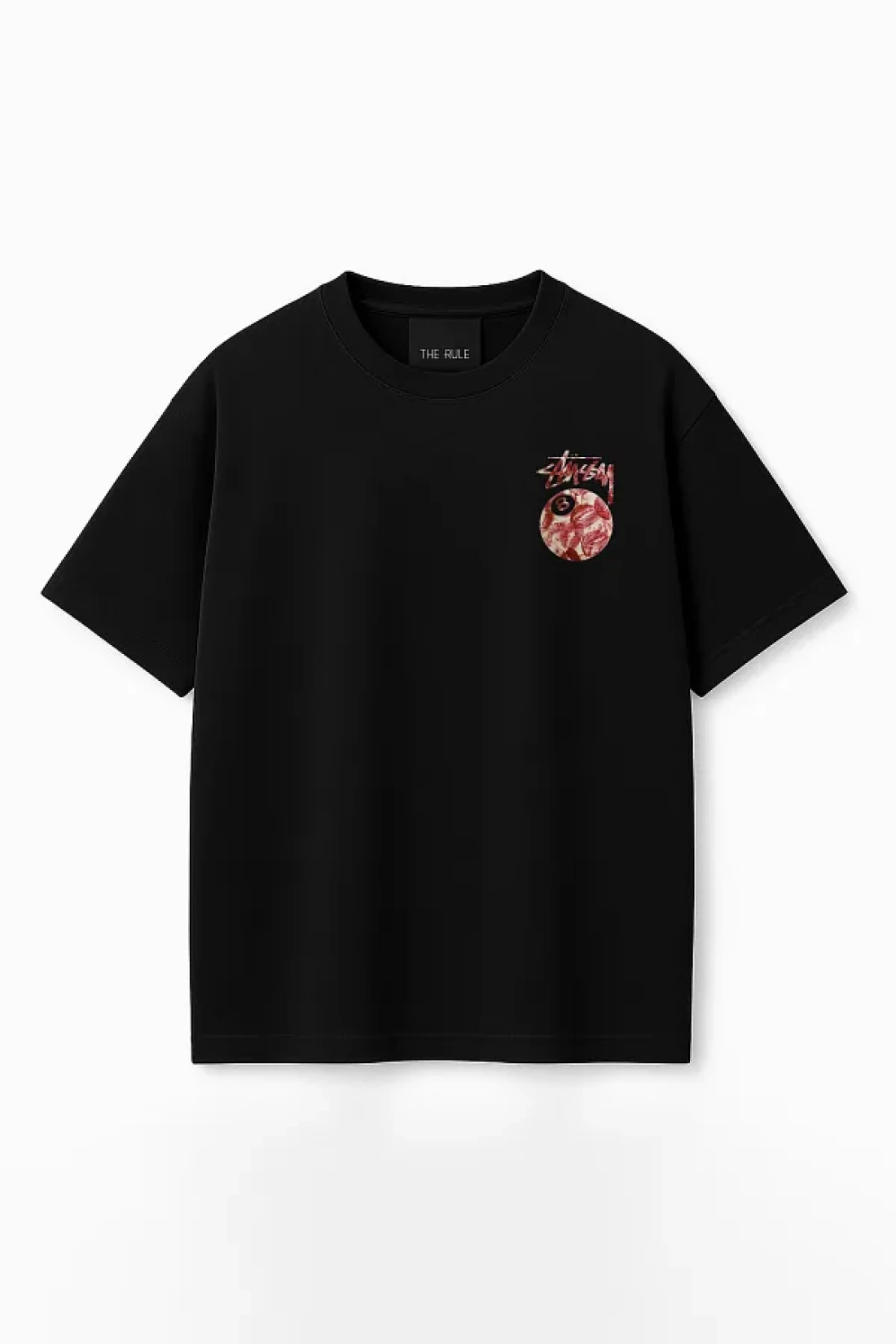 THE RULE Unisex Stüssy Kiss Printed Oversize 100% Cotton Wide Cut Textured Black Crew Neck T-Shirt Rf0512