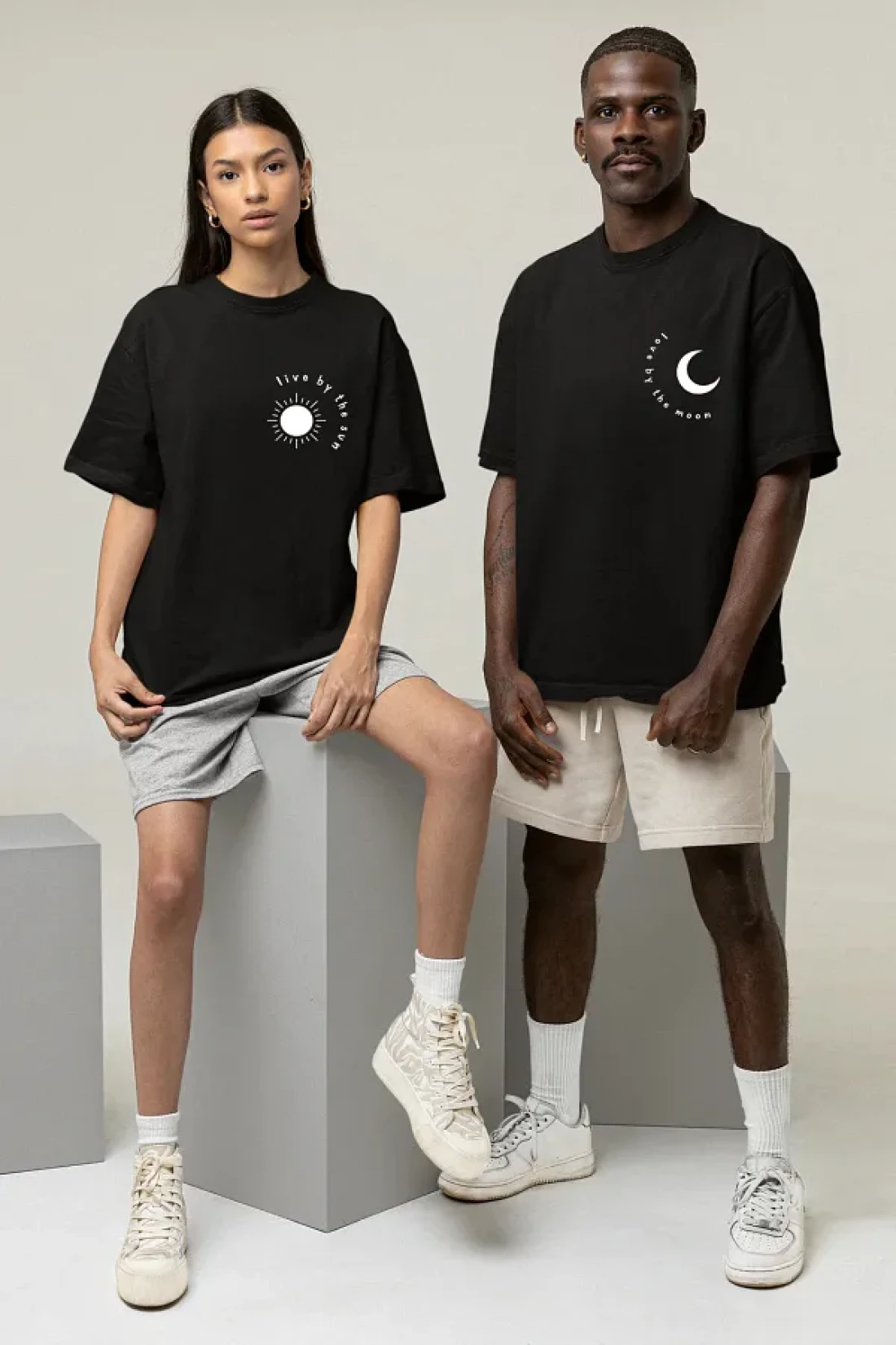 Pear Wear Moon Sun Printed T-Shirt Dear Couple Suit Moon Sun Black White Oversize Couple T-shirt