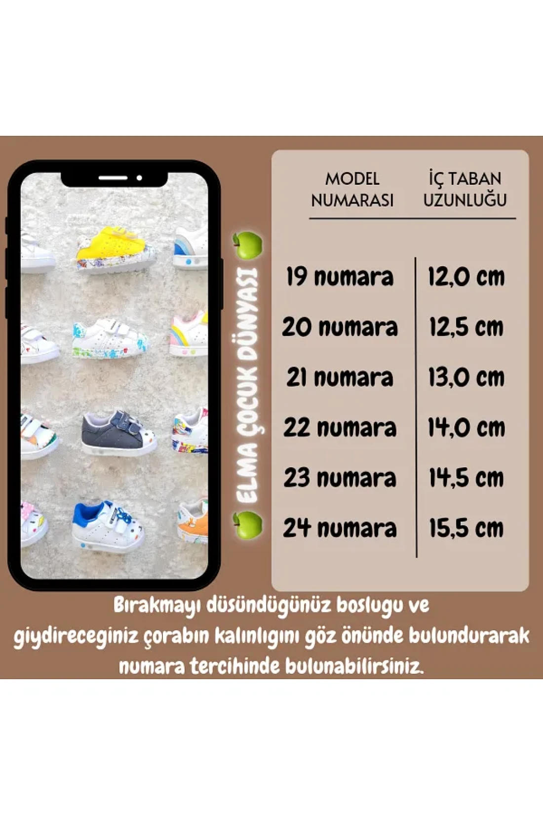 The size chart is in the last image. The orthopedic sole, which supports children's foot health with its ergonomic design, offers comfort even in long-term use. This sneaker, ideal for daily use, allows you to experience comfort and elegance together. Thanks to its outer material made of synthetic leather, durability and easy cleanability features come to the forefront. It offers practical wear and removal with its velcro fastening system, while gently wrapping your baby's feet. It provides extra protection for you to take safe steps with its non-slip base feature