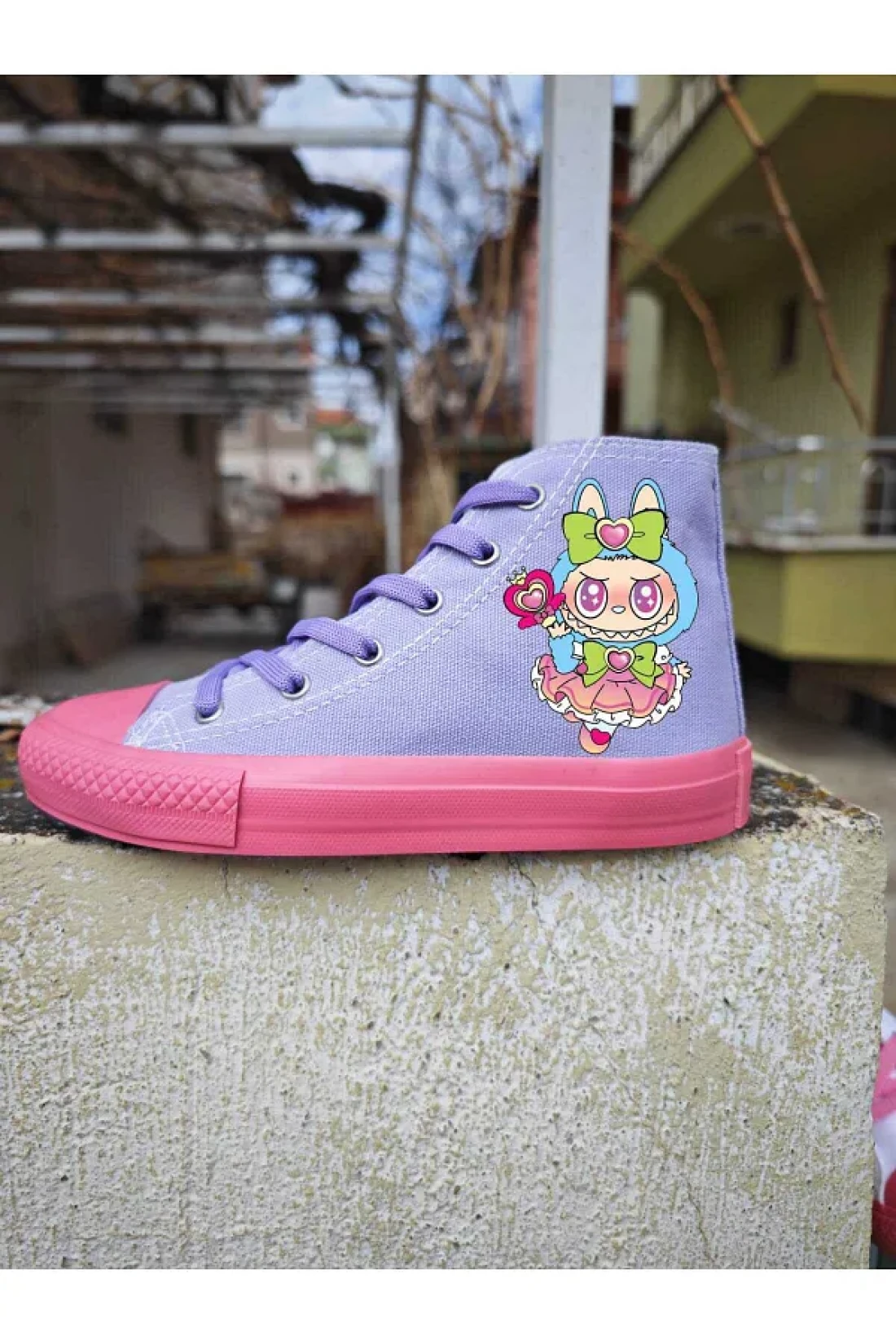 Heart wand lalalob Printed purple pink sole children's sports shoes, which attract attention with their comfortable and stylish design, ideal for daily use. It offers a comfortable interior structure by using textile as lining material.