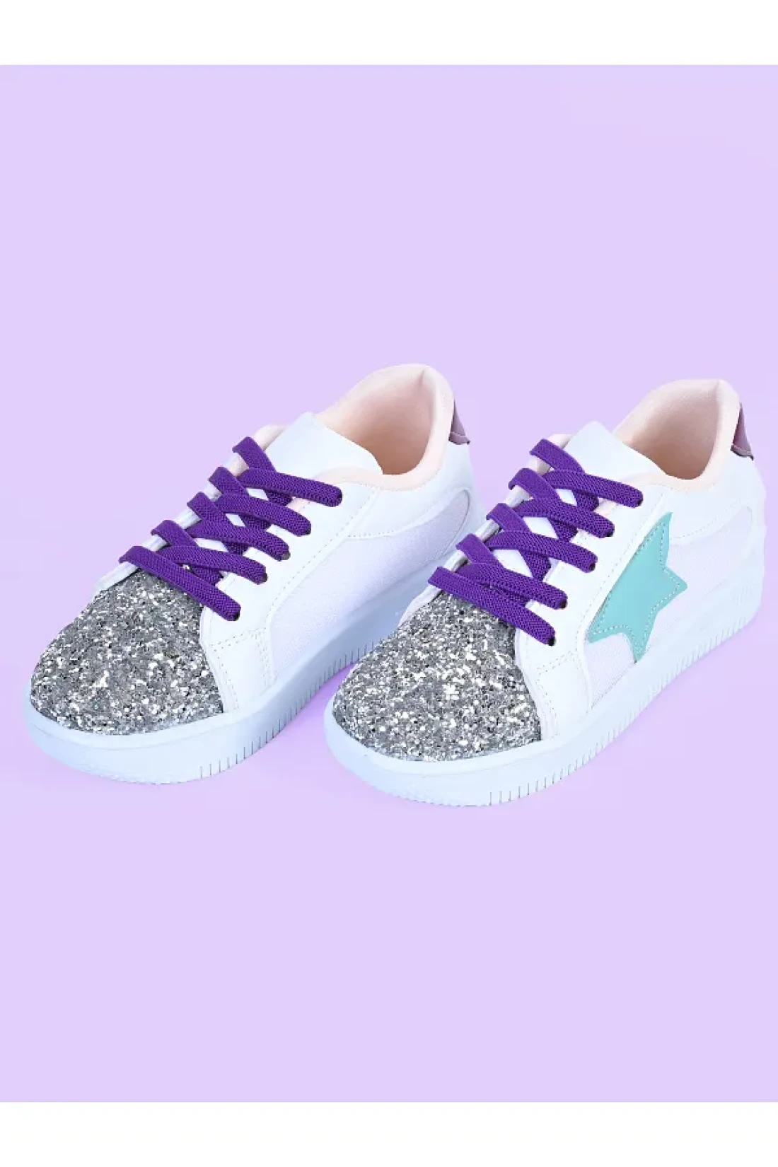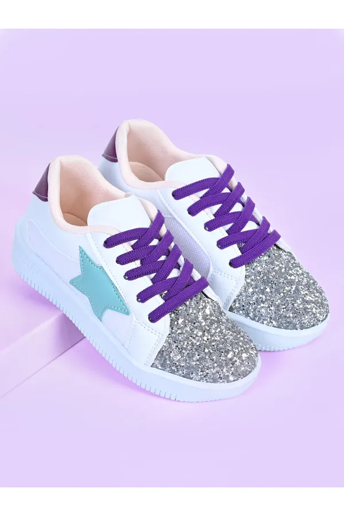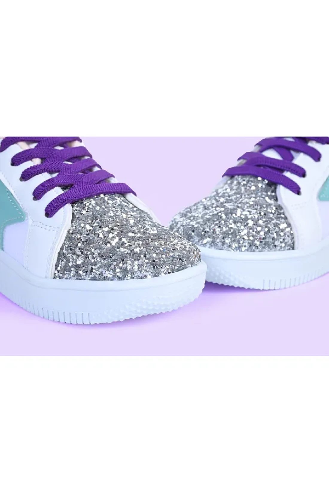MECH BUTİK Girl's White Sneakers Green Starry Silver Sequin Colorful Lace-Up Sneakers