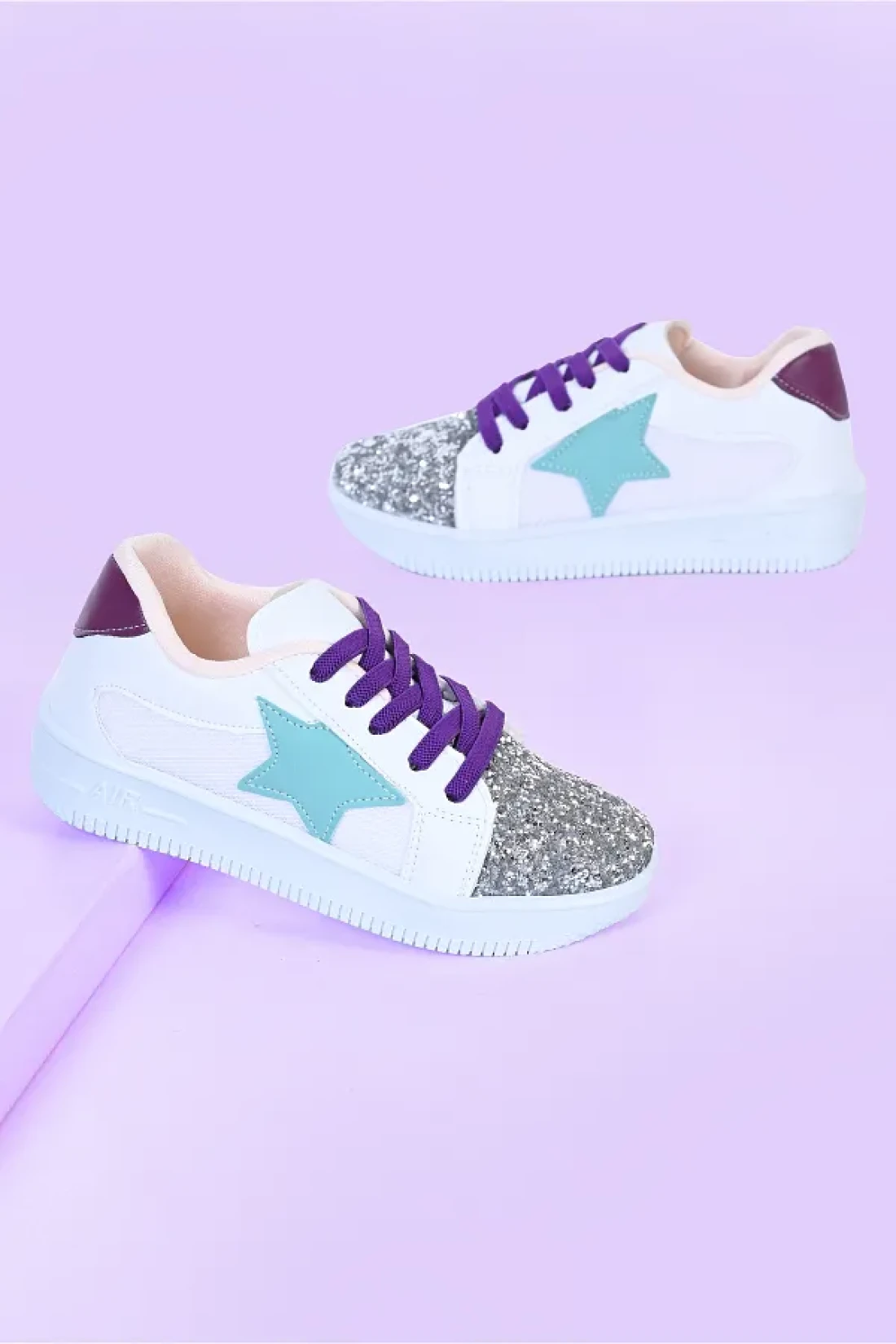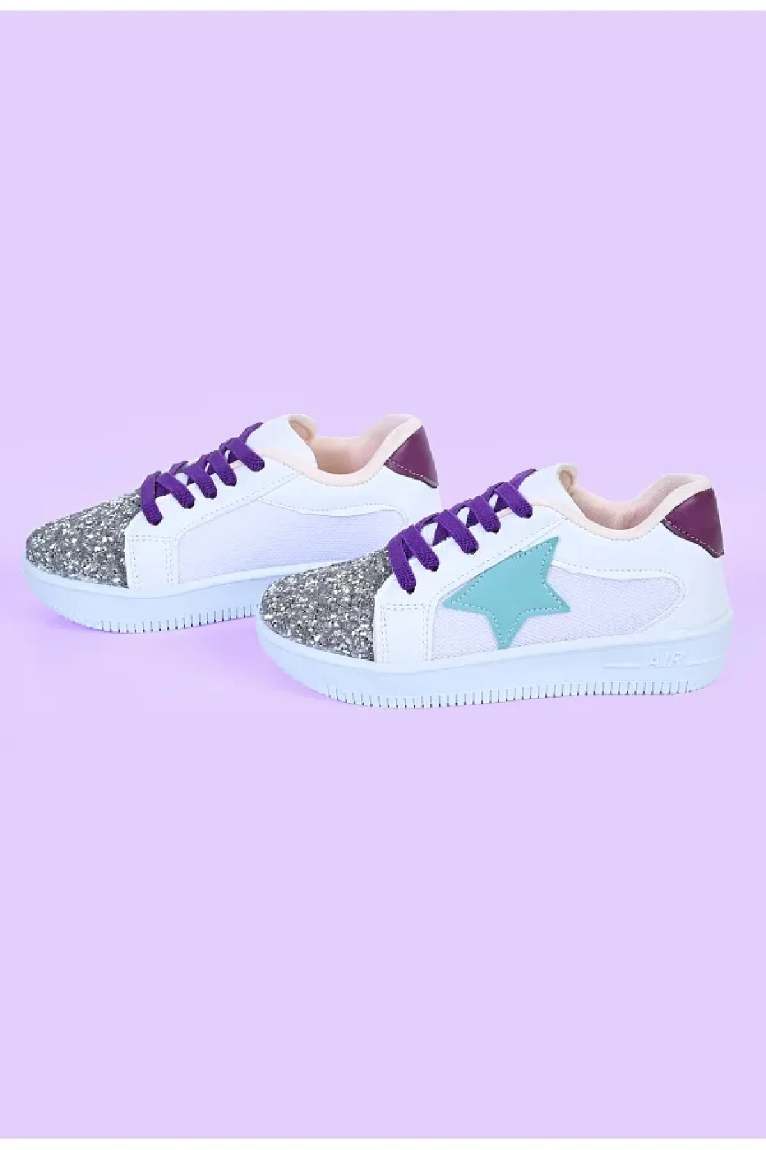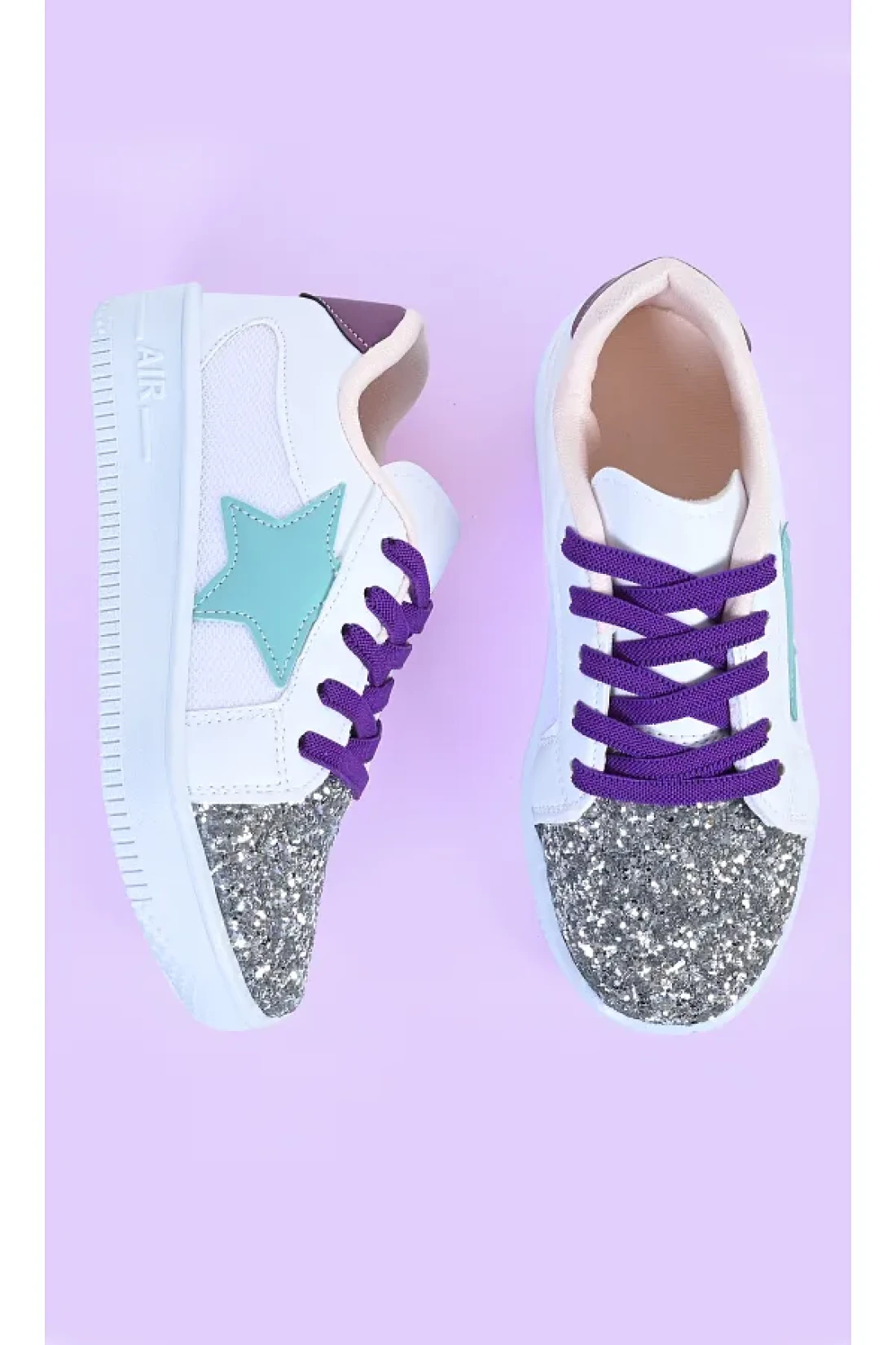 MECH BUTİK Girl's White Sneakers Green Starry Silver Sequin Colorful Lace-Up Sneakers