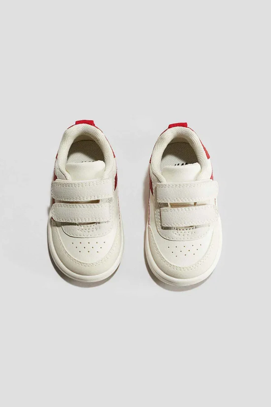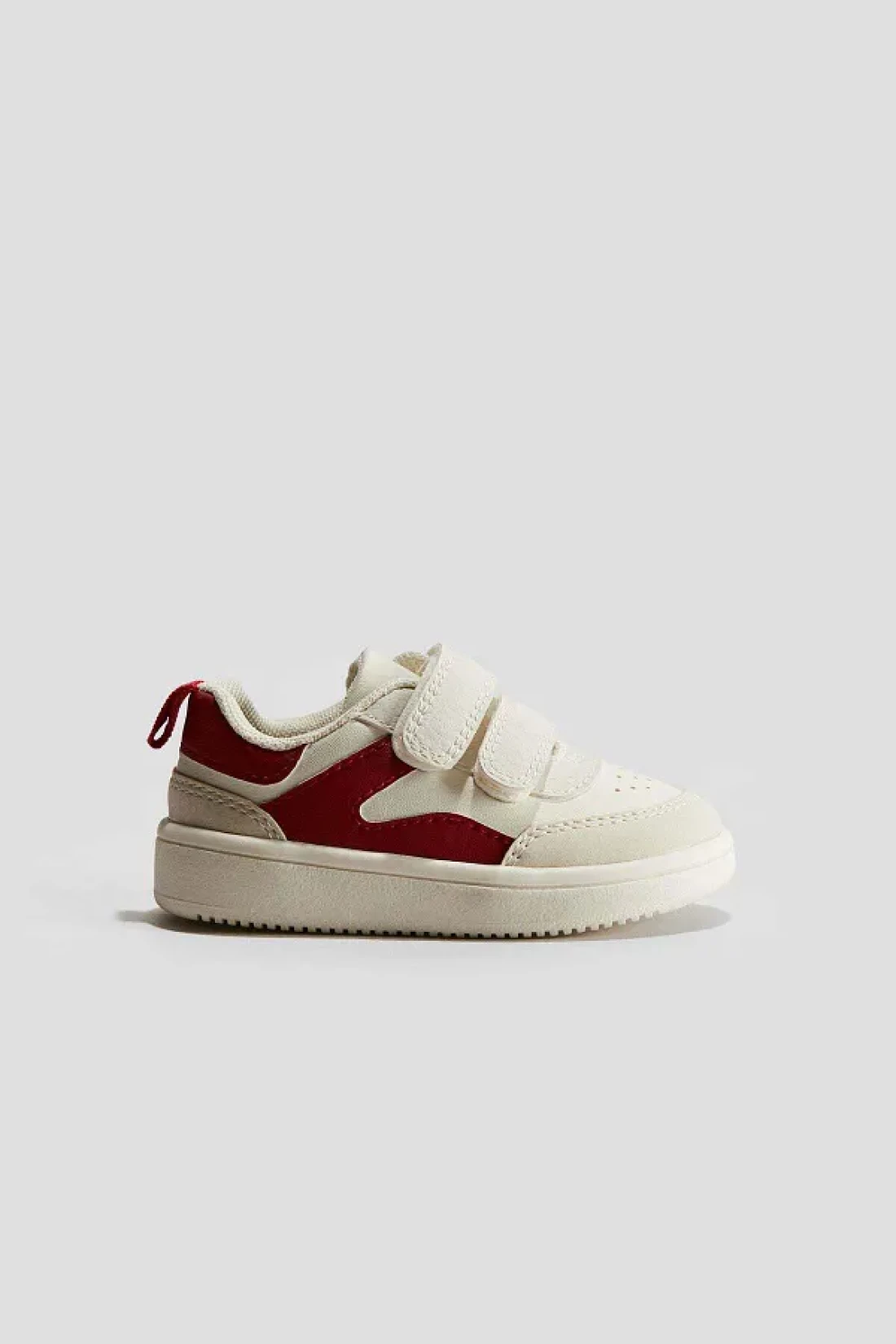 Block-coloured trainers with hook and loop tabs at the front and a loop at the back.