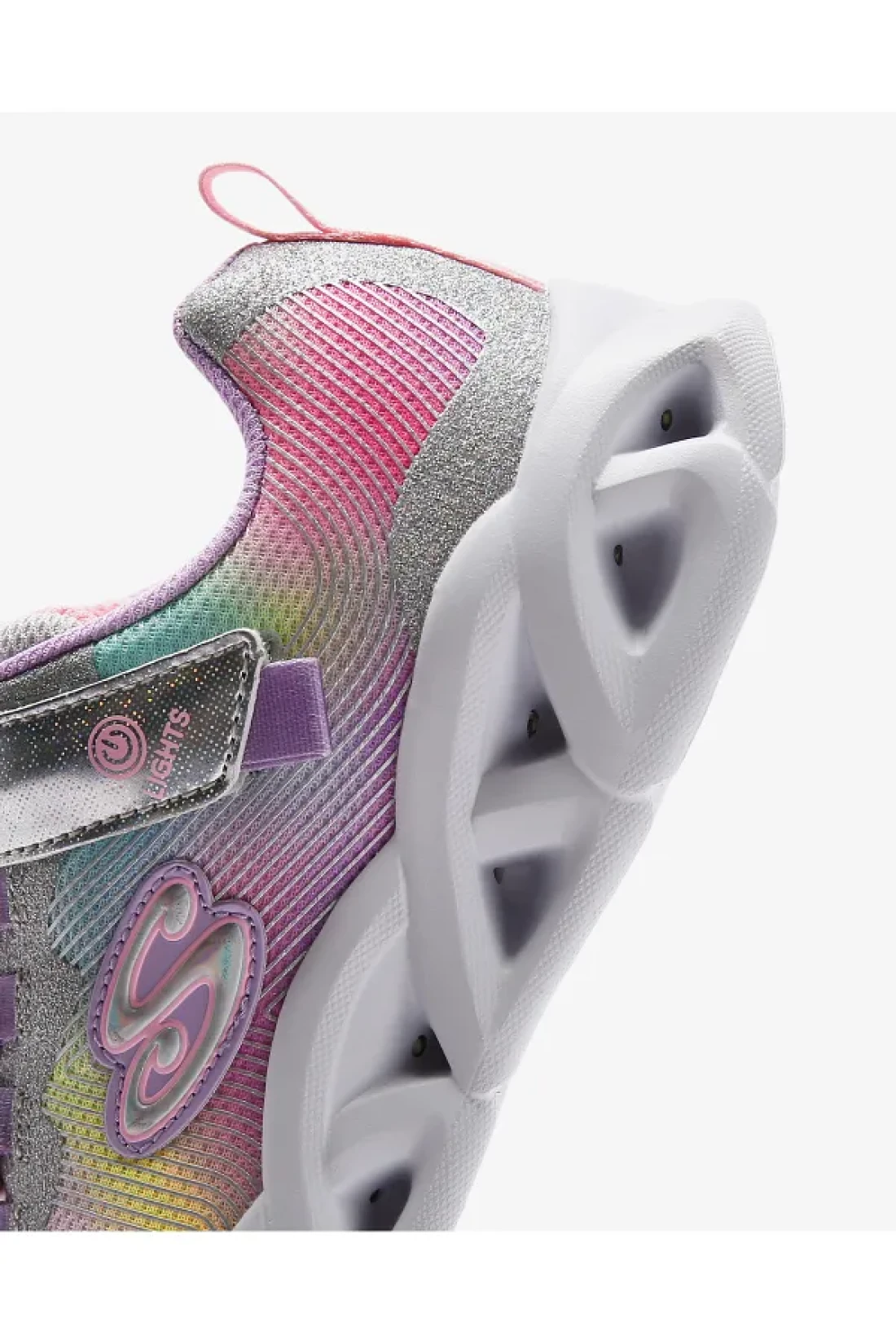 It has a cushioned, comfortable inner sole. It has a shock absorbing, shaped midsole. It has a flexible outer sole that provides grip. It has adjustable upper strap satin flexible laces. It is mesh and synthetic. The heel height is 2.54 cm. There is an on/off light button on the larger child sizes.