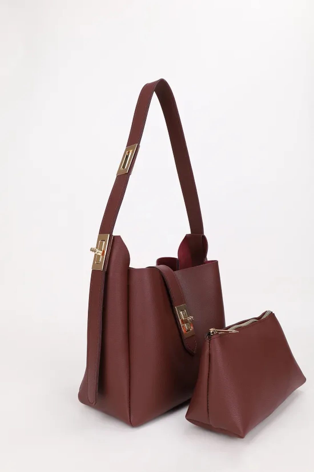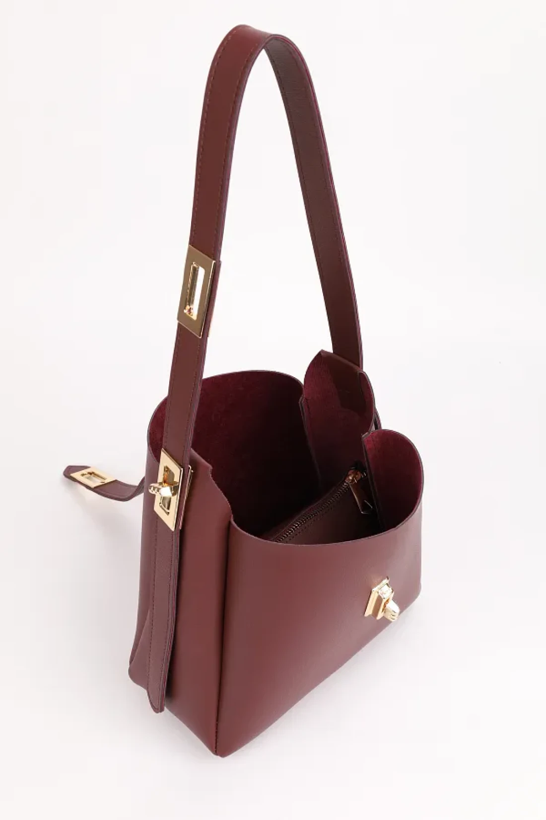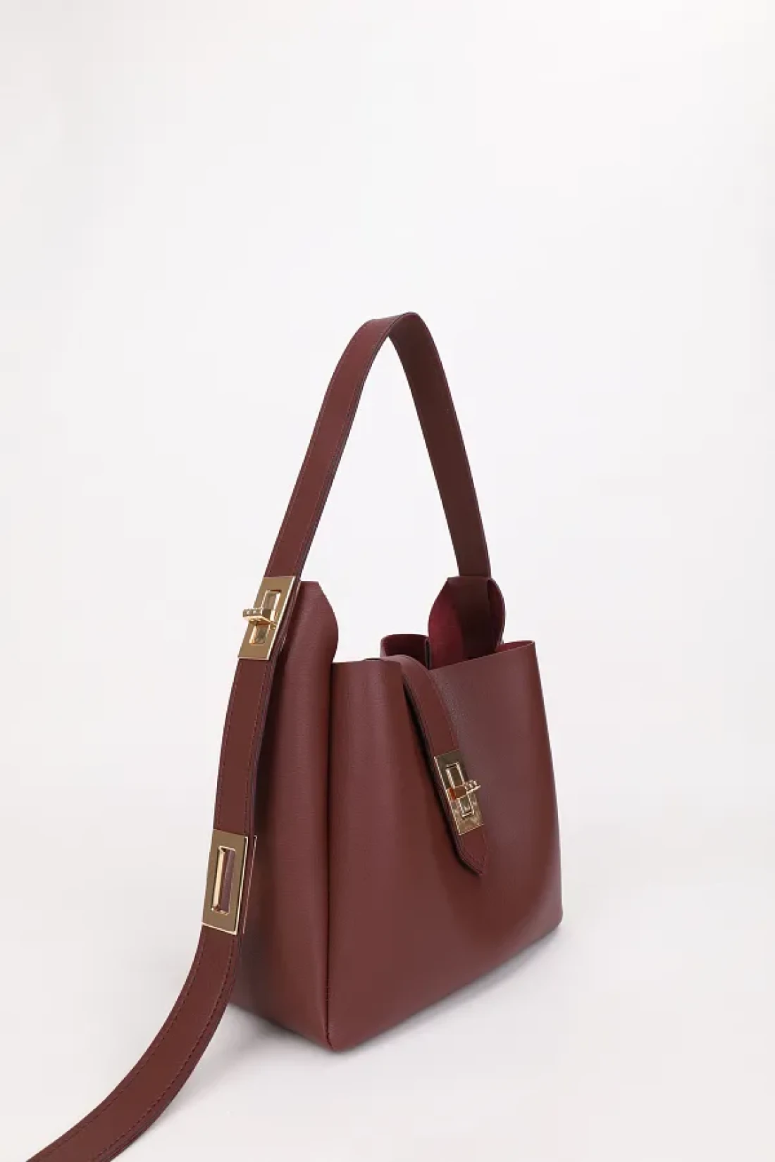 NOTHING Women's Burgundy Gold Lock Detailed Accessory Adjustable Lock Strap Handbag and Shoulder Bag
