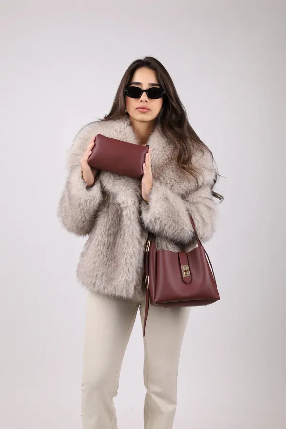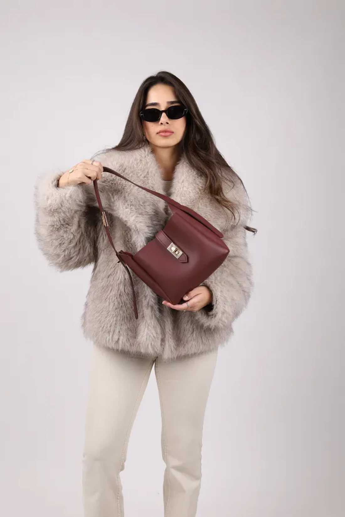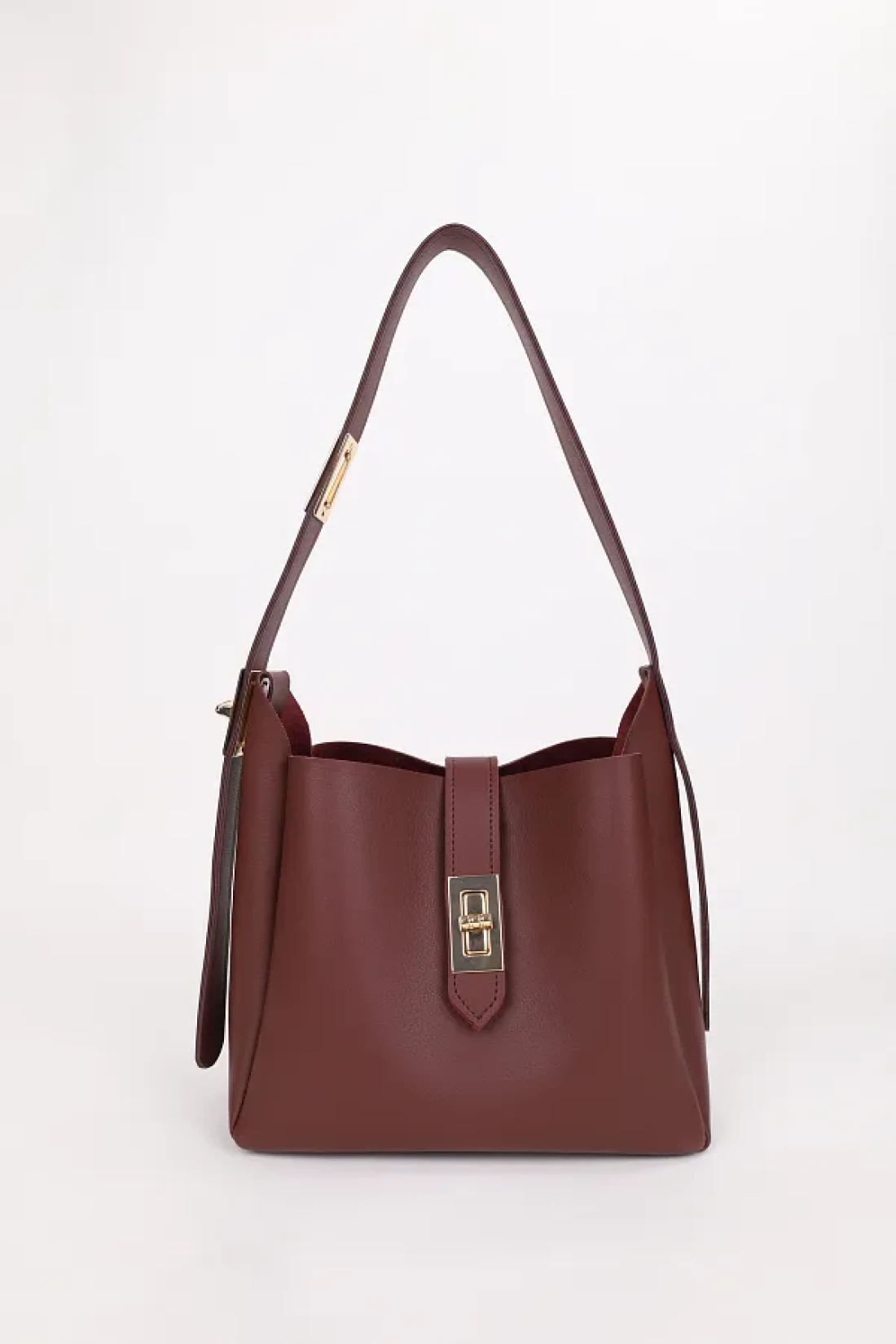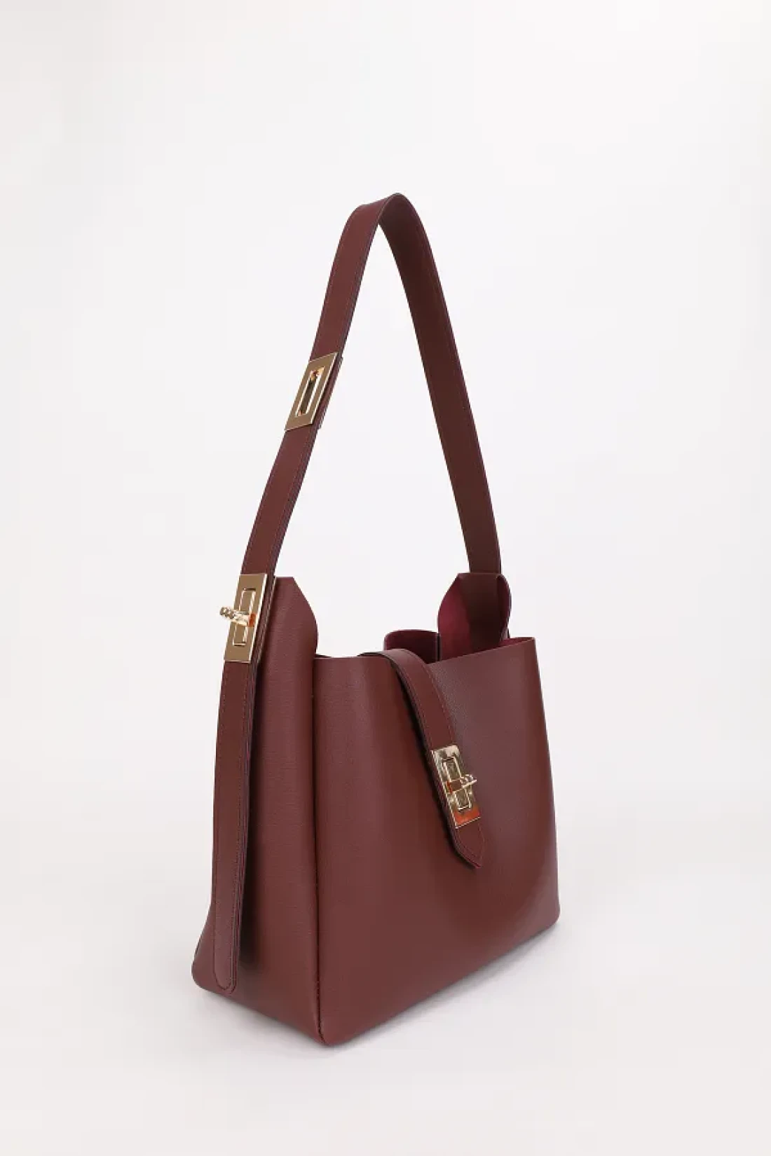 NOTHING Women's Burgundy Gold Lock Detailed Accessory Adjustable Lock Strap Handbag and Shoulder Bag