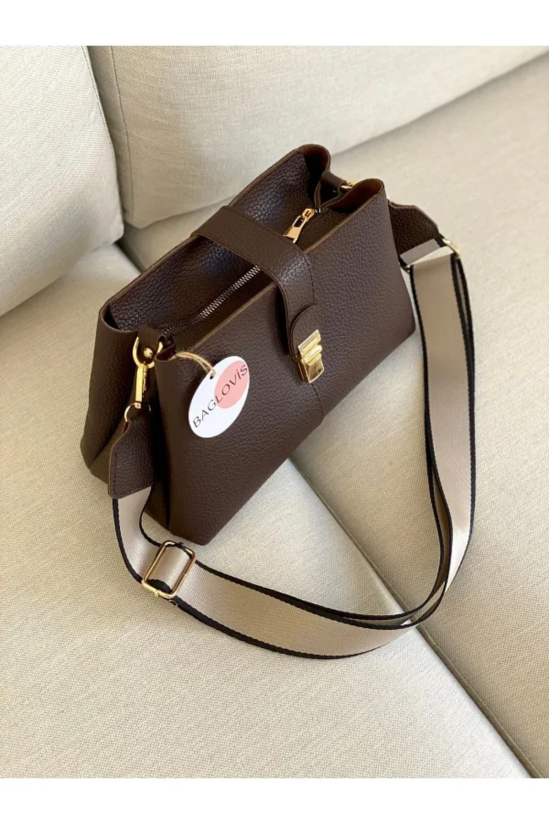 It offers durability and stylish appearance together with its polyester column and textured artificial leather material component. The use of imitation leather combines the aesthetics of real leather with an economical alternative. Thanks to its artificial leather material, it provides long-lasting use and easy maintenance. With its striped pattern, it creates a modern and dynamic style, matching all kinds of clothes