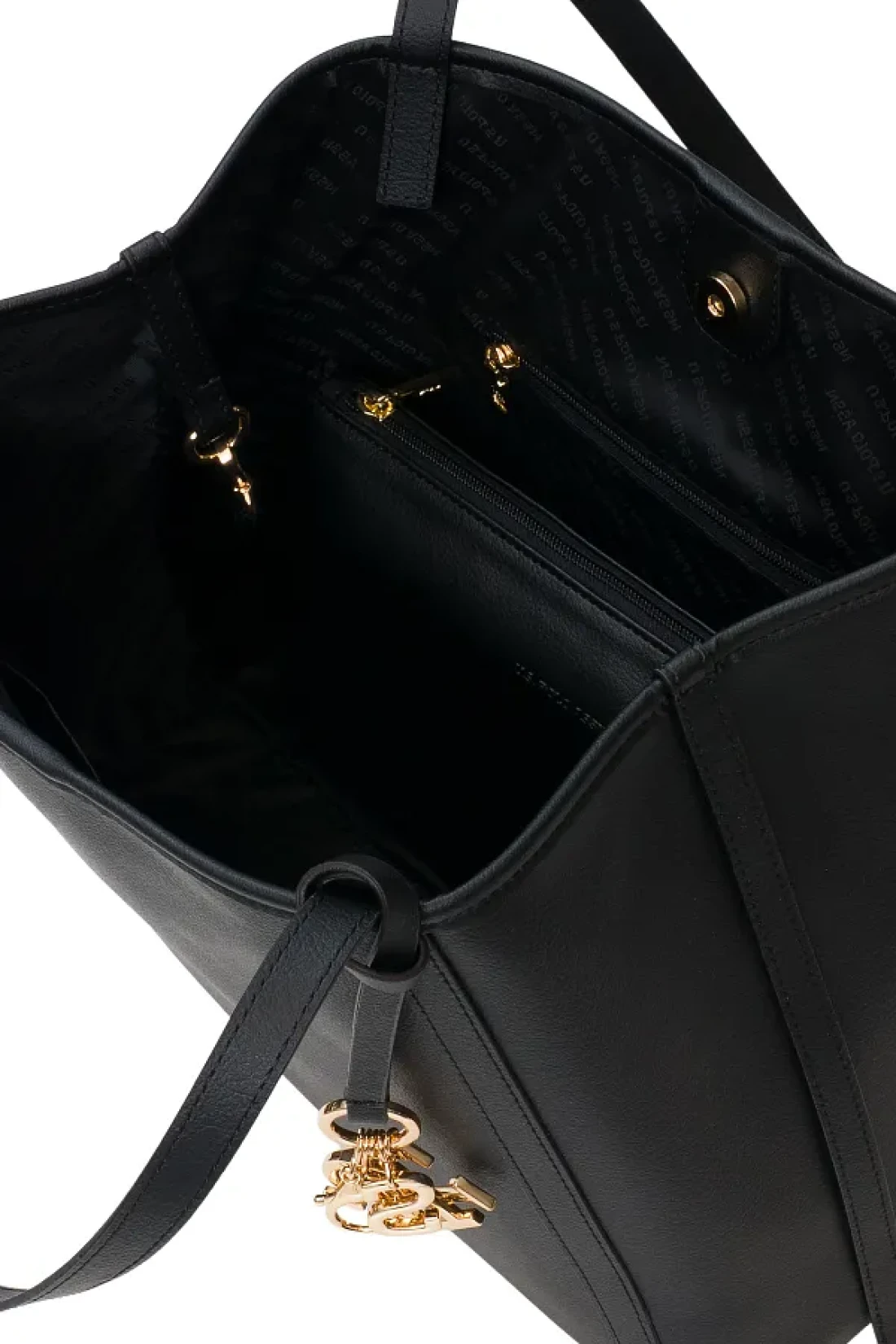 there is a zippered pocket inside. There is a phone holder. Handle length: 65 cm. Mouth closure type: magnet