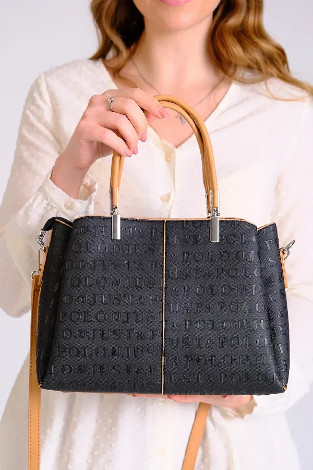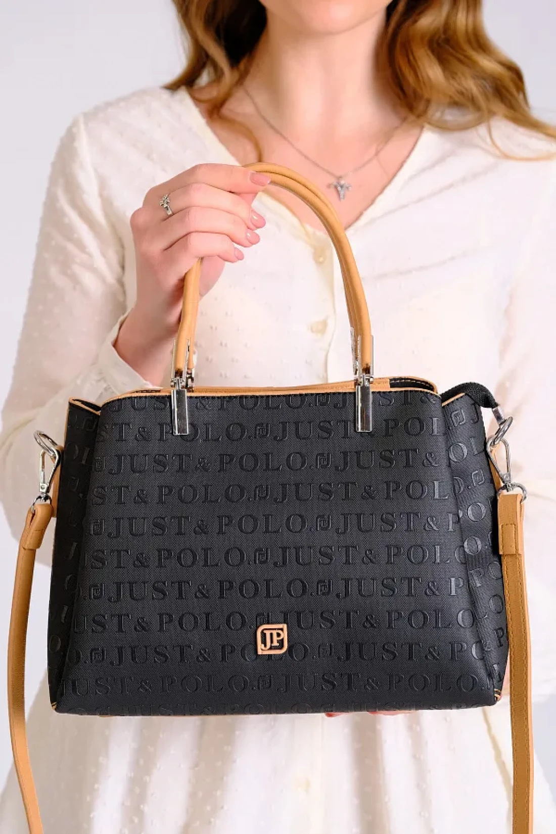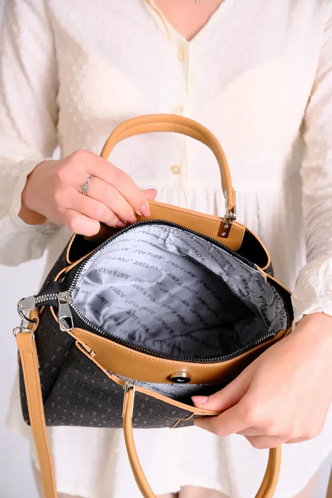 Just Polo Women's Black Tan Just & Polo Patterned Snap and Zipper Closure Shoulder and Hand Bag