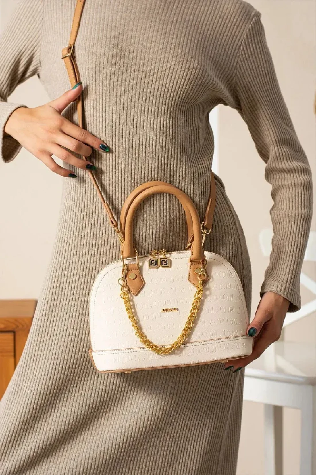 Just Polo Women's Embossed Chain Embossed Patterned Cotton Woven Strap Vegan Hand and Shoulder Bag