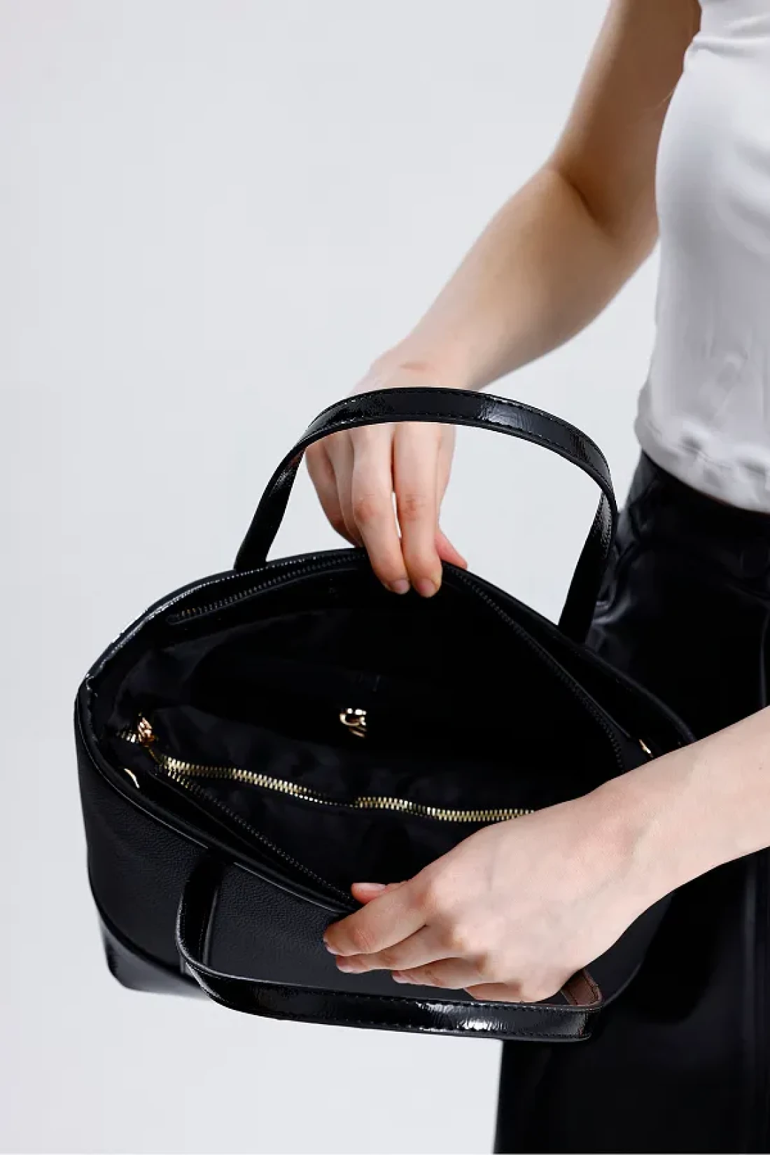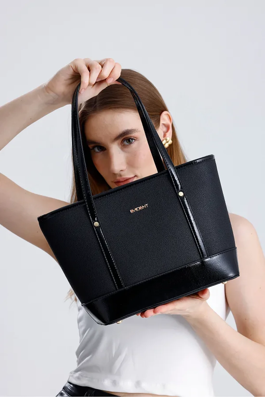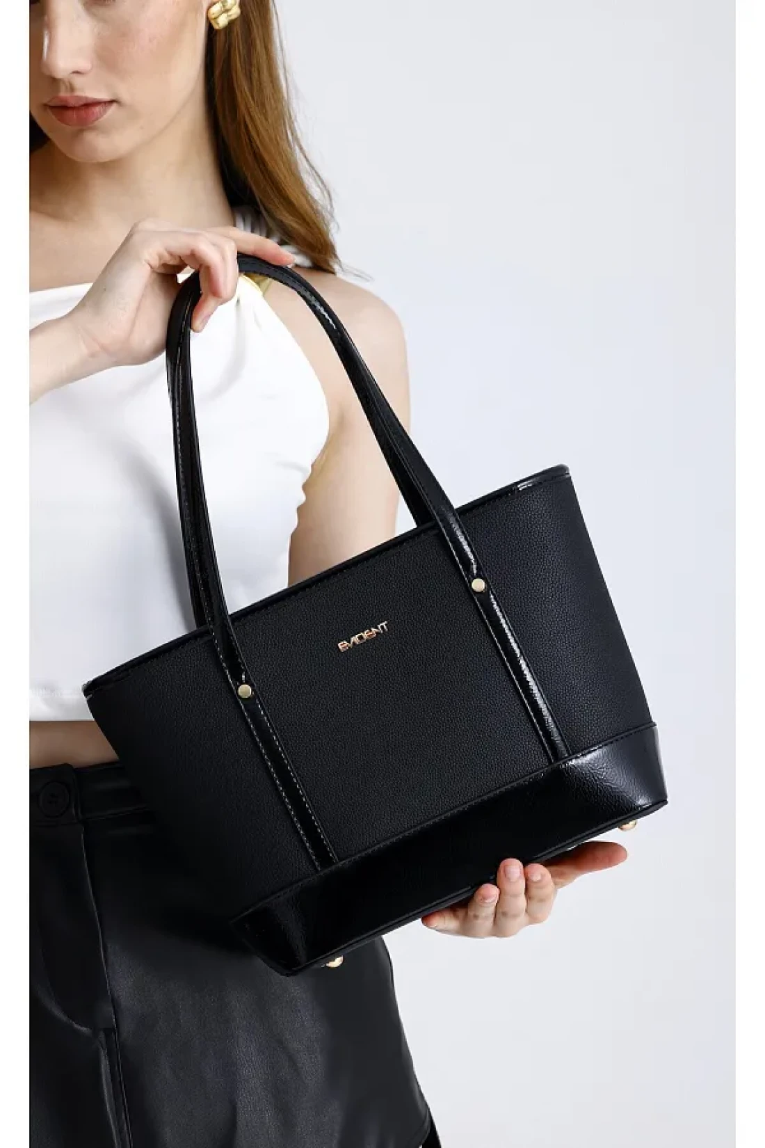 The medium-sized bucket model women's shoulder bag, offering elegance and grace together with black patent details, is ideal for daily use.