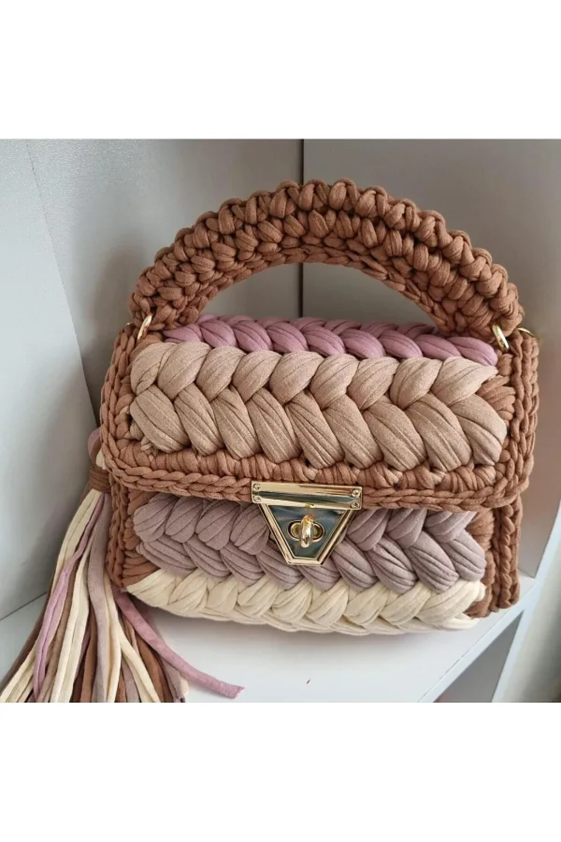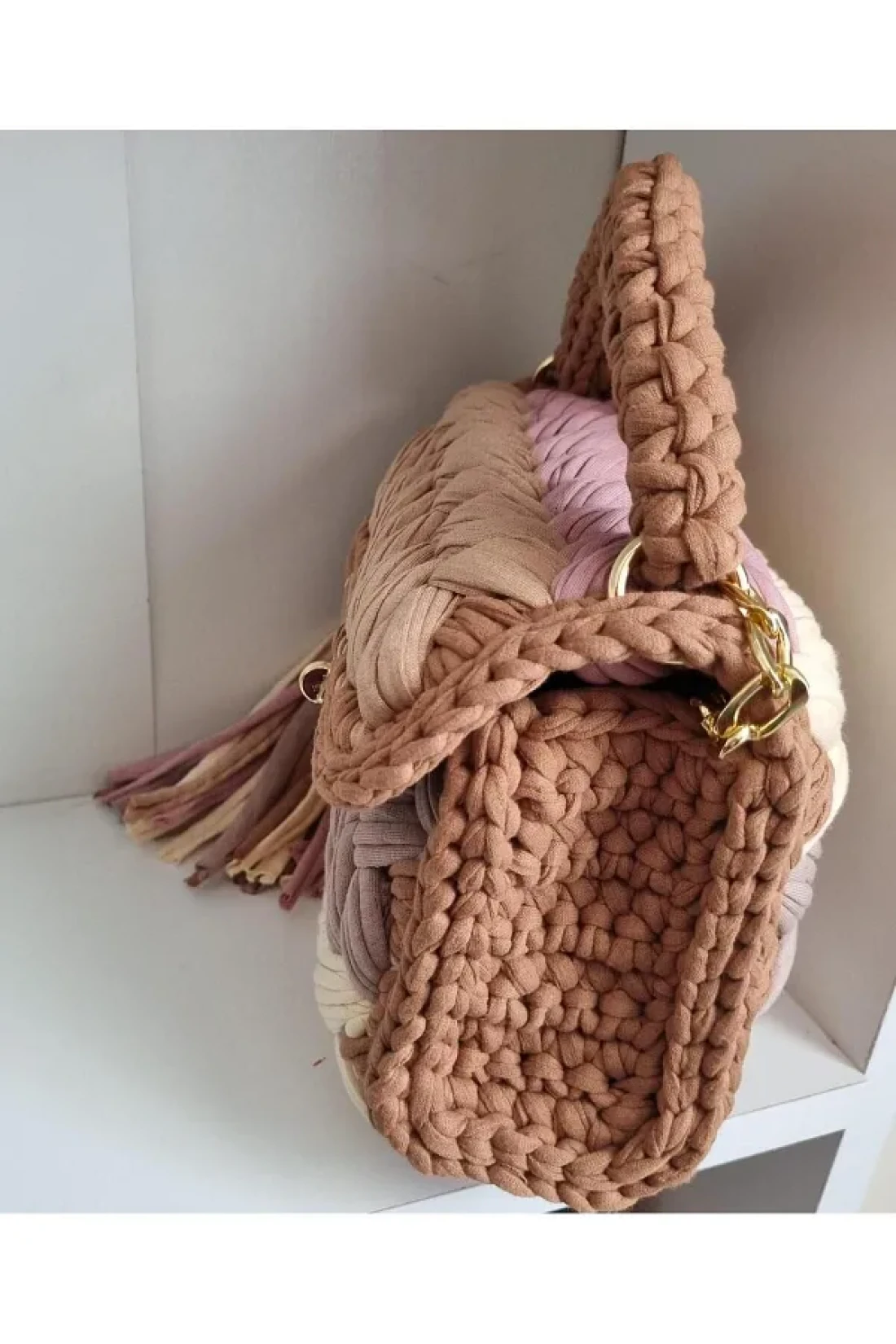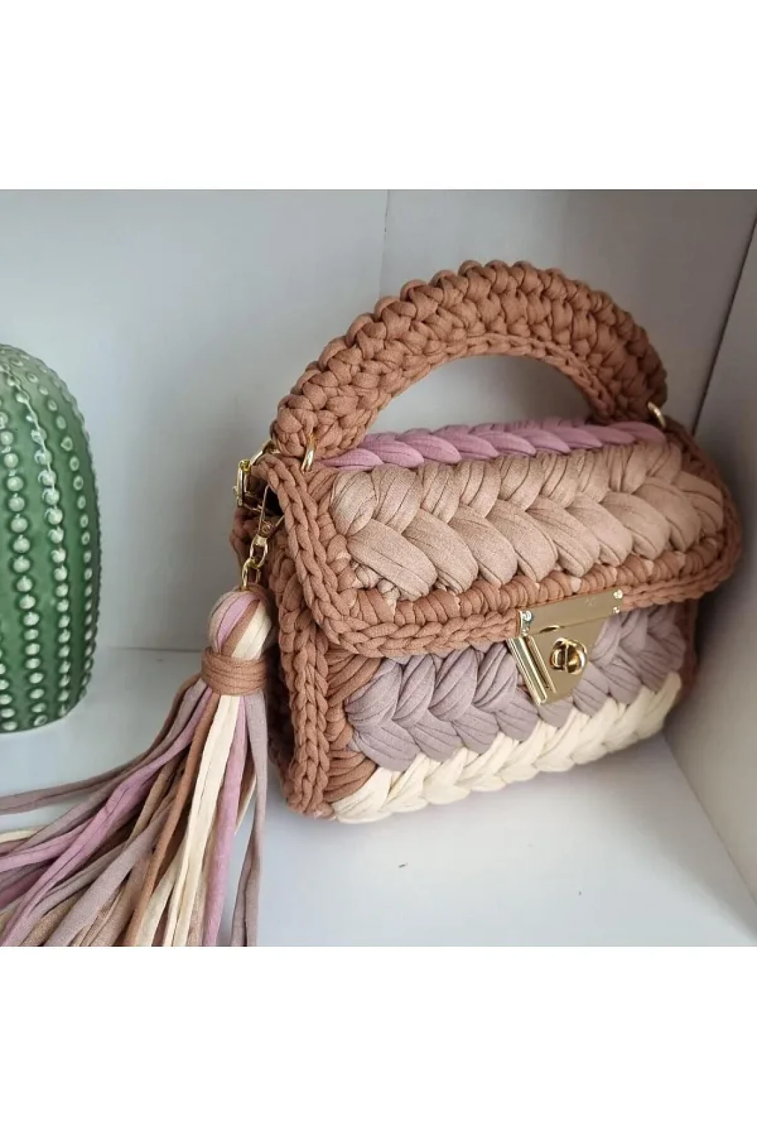* it is a handmade product made of high quality combed yarn and accessories. It will be a very stylish choice for your special days or daily use. * you can use it as a handbag or shoulder bag or crossbody bag. This bag will also be a very special gift to make your loved ones happy. It is a completely handmade bag, the dimensions of the bag may vary up to 2cm, and there may be differences in color tones due to the recycled yarn. It has a removable decorative tassel, it has a chain that is 100 cm long. The color of the metal parts is gold. Bag dimensions, height: 18-20cm length: 22-23cm