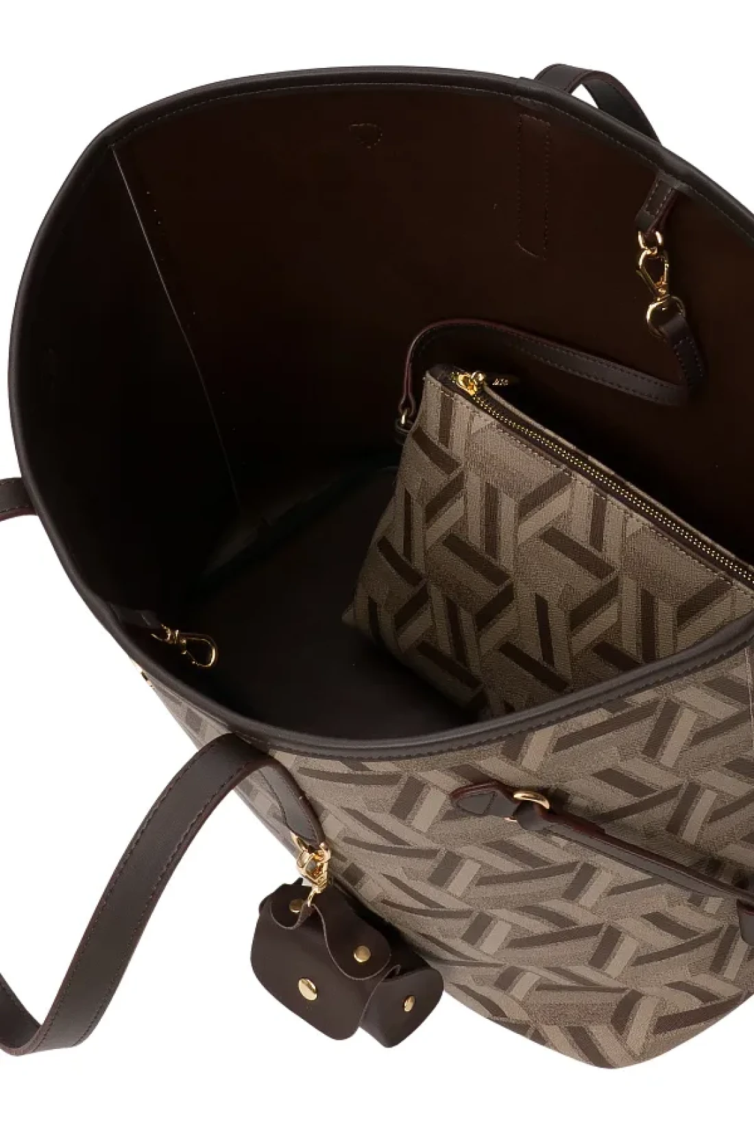 there is a zippered pocket inside. It is a lightweight unlined bag. Handle length: 22 cm. Mouth closure type: hook