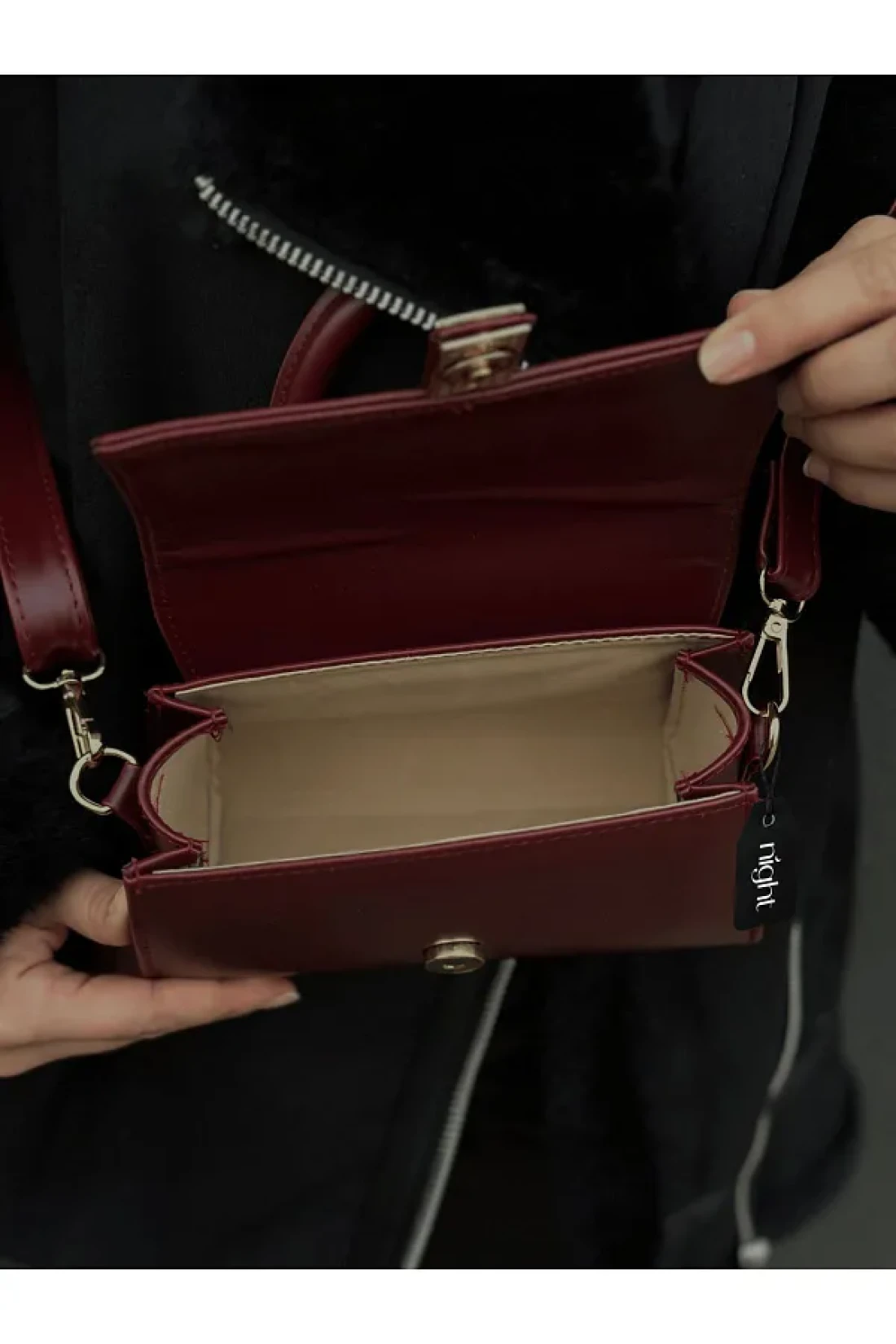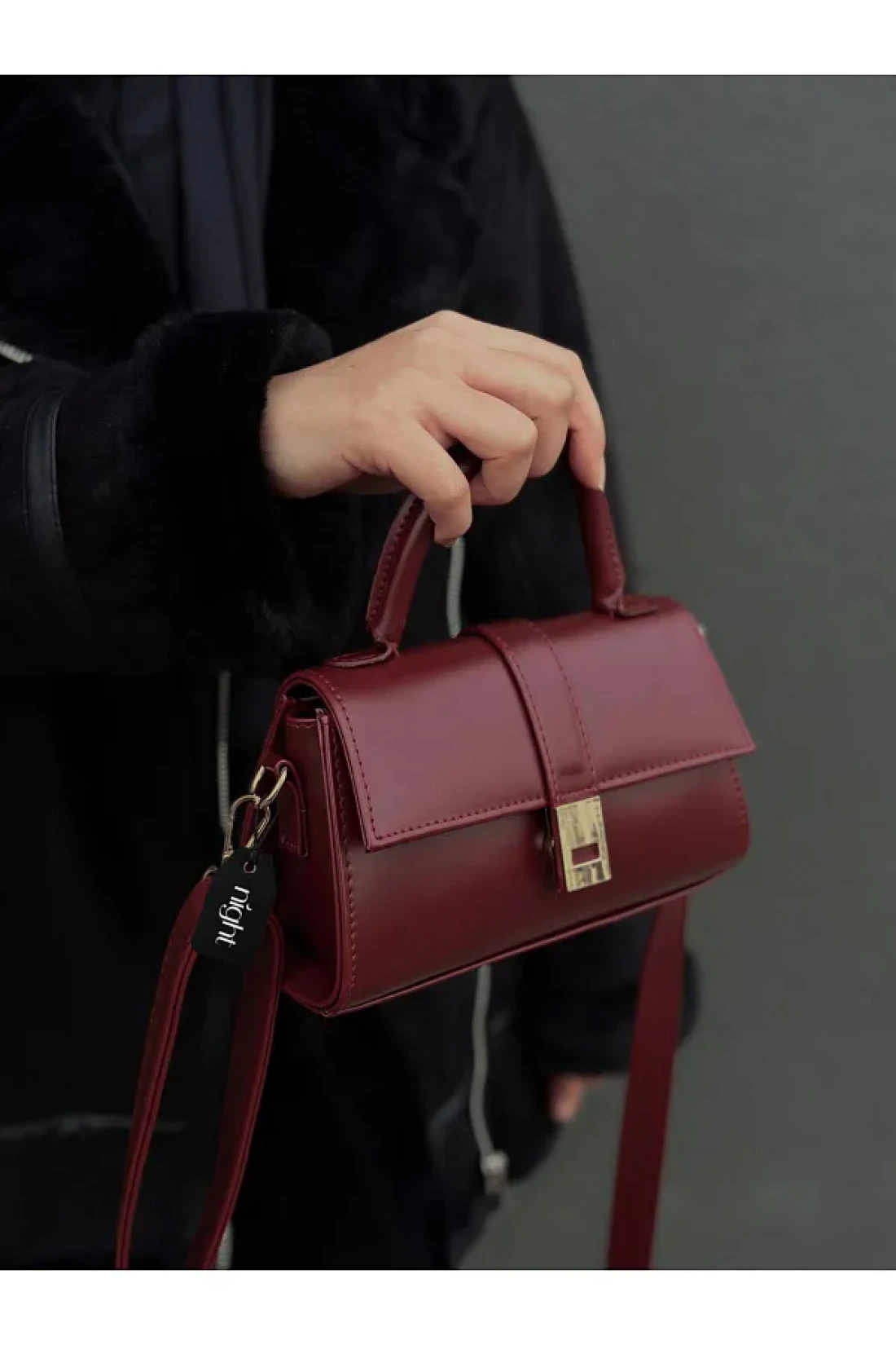 it has a leather handle to hold it in hand. The leather handle is stitched. In addition to the leather handle, it has an adjustable strap and the same leather strap as the bag. The leather strap is stitched. The lid of the bag opens and closes with a magnetic accessory. All accessories are gold in color. The gold magnet apparatus on the front of the bag comes to you covered with a transparent tape to protect against scratches and damage. The product is suitable for daily use.