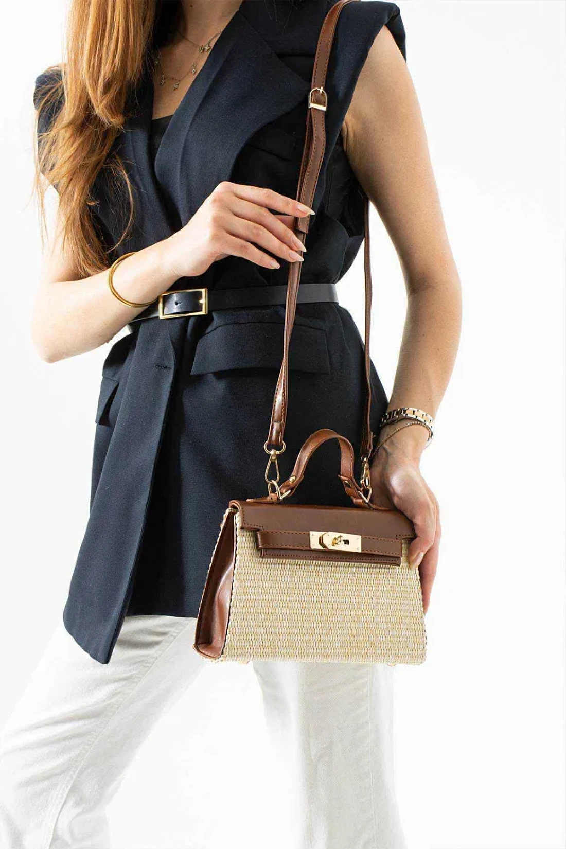 Mimoza Women's Straw - Tan Leather Detailed Hand and Shoulder Bag