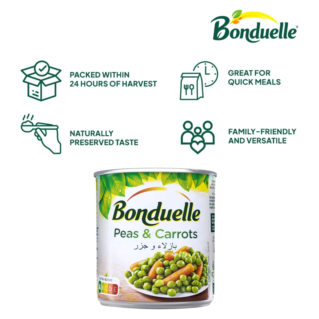 Bonduelle Peas and Carrots offer a delightful combination of sweet green peas and tender carrots, providing a balanced flavour that complements a variety of dishes. This product has a low-fat content, making it a healthy addition to meals. Each 400g pack contains a generous serving, perfect for family meals or side dishes. The vegetables are carefully selected and preserved to maintain their freshness and nutritional value, ensuring you enjoy the taste of garden-fresh produce all year round.
