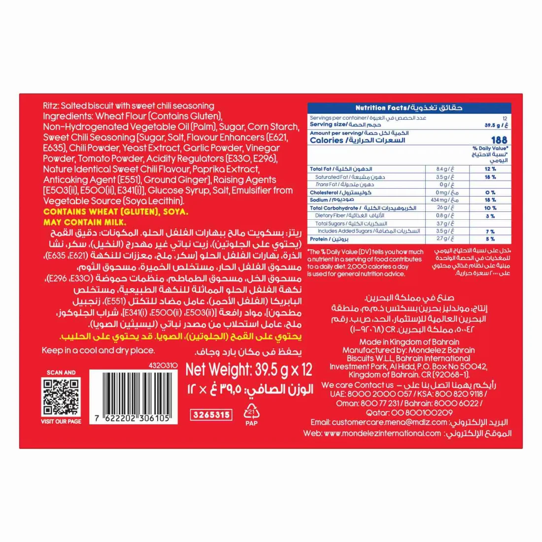 ingredients : Wheat Flour (Contains Gluten), Non-Hydrogenated Vegetable Oil (Palm), Sugar, Corn Starch, Sweet Chili Seasoning [Sugar, Salt, Flavour Enhancers (E621, E635), Chili Powder, Yeast Extract, Garlic Powder, Vinegar Powder, Tomato Powder, Acidity Regulators (E330, E296), Nature Identical Sweet Chili Flavour, Paprika Extract, Anticaking Agent (E551), Ground Ginger], Raising Agents [E503(ii), E500(ii), E341(i)], Glucose Syrup, Salt, Emulsifier from Vegetable Source (Soya Lecithin)