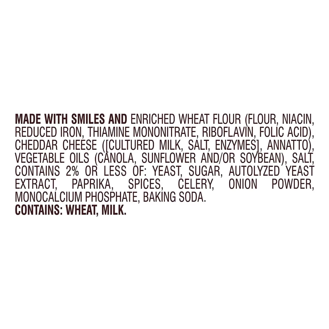 ingredients : Enriched Wheat Flour (Flour, Niacin, Reduced Iron, Thiamine Mononitrate, Riboflavin, Folic Acid), Cheddar Cheese ([Cultured Milk, Salt, Enzymes], Annatto), Vegetable Oils (Canola, Sunflower And/Or Soybean), Salt, Contains 2% Or Less Of: Yeast, Sugar, Autolyzed Yeast Extract, Paprika, Spices, Celery, Onion Powder, Monocalcium Phosphate, Baking Soda