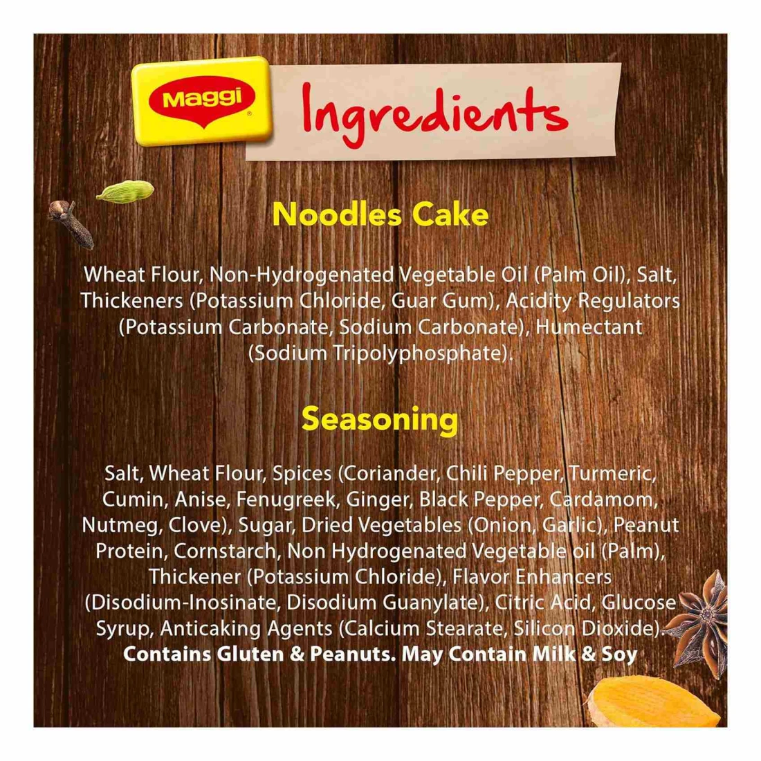 ingredients : Noodles: Refined Wheat Flour (Maida), Palm Oil, Wheat Gluten, Iodized Salt, Thickeners (508 & 412), Acidity Regulators (5010) & 500 (1)) and Humectant (451()), Tastemaker: Mixed Spices (35.2%) (roasted Spice Powder (9.3%) (Coriander, Turmeric, Cumin, Aniseed, Black Pepper, Fenugreek, Ginger, Green Cardamom, Cinnamon, Clove, Nutmeg, Bay Leaf & Black Cardamom), Red Chilli Powder, Onion Powder, Garlic Powder, Black Pepper Powder, Coriander Powder, Turmeric Powder, Cumin Powder, Ginger Powder, Aniseed Powder, Fenugreek Powder, Capsicum Extract, Com Pounded Asafoetida, Star Anise Powder, Coriander Extract & Cumin Extract), Sugar, Iodized Salt, Refined Wheat Flour (Maida), Onion, Thickener (508), Starch, Flavour Enhancer (635), Yeast Extract Powder, Palm Oil, Dehydrated Kasuri Methi Leaves, Acidity Regulator (330), Corn Oil, Mineral and Wheat Gluten