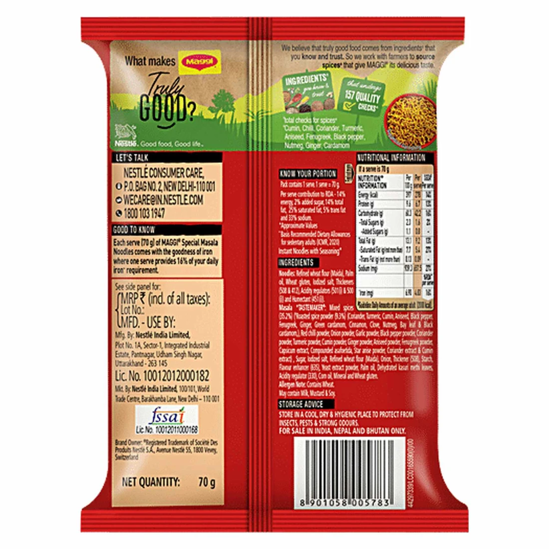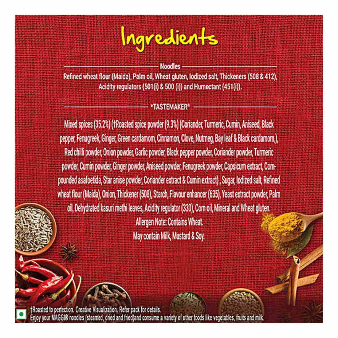 ingredients : Noodles: Refined Wheat Flour (Maida), Palm Oil, Wheat Gluten, Iodized Salt, Thickeners (508 & 412), Acidity Regulators (5010) & 500 (1)) and Humectant (451()), Tastemaker: Mixed Spices (35.2%) (Roasted Spice Powder (9.3%) (Coriander, Turmeric, Cumin, Aniseed, Black Pepper, Fenugreek, Ginger, Green Cardamom, Cinnamon, Clove, Nutmeg, Bay Leaf & Black Cardamom), Red Chilli Powder, Onion Powder, Garlic Powder, Black Pepper Powder, Coriander Powder, Turmeric Powder, Cumin Powder, Ginger Powder, Aniseed Powder, Fenugreek Powder, Capsicum Extract, Com Pounded Asafoetida, Star Anise Powder, Coriander Extract & Cumin Extract), Sugar, Iodized Salt, Refined Wheat Flour (Maida), Onion, Thickener (508), Starch, Flavour Enhancer (635), Yeast Extract Powder, Palm Oil, Dehydrated Kasuri Methi Leaves, Acidity Regulator (330), Corn Oil, Mineral and Wheat Gluten