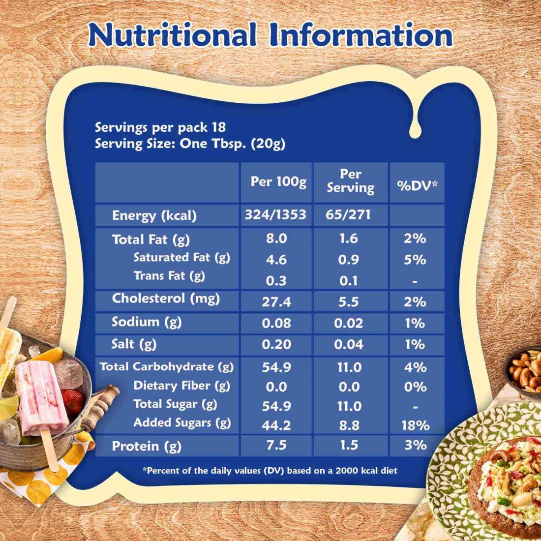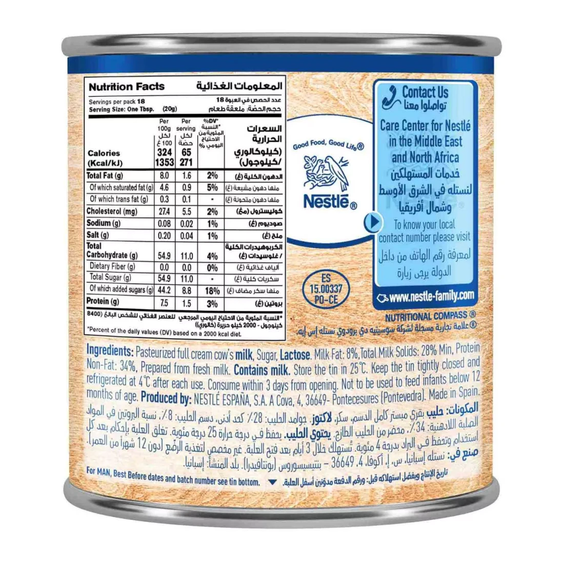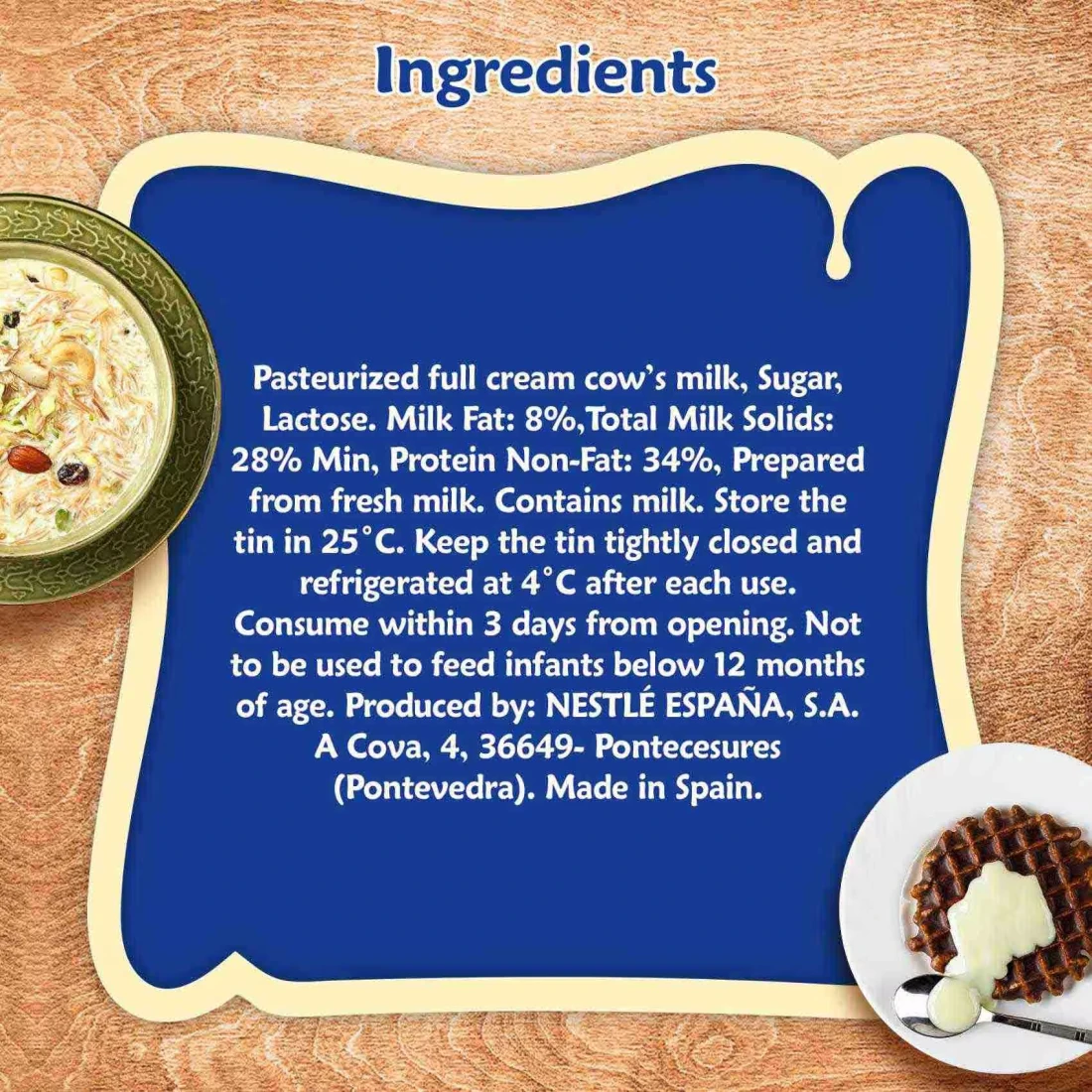 ingredients : Pasteurized Full Cream Cow’s Milk, Sugar, Lactose. Milk Fat: 8%, Total Milk Solids: 28% Min, Protein Non-Fat: 34%, Prepared From Fresh Milk