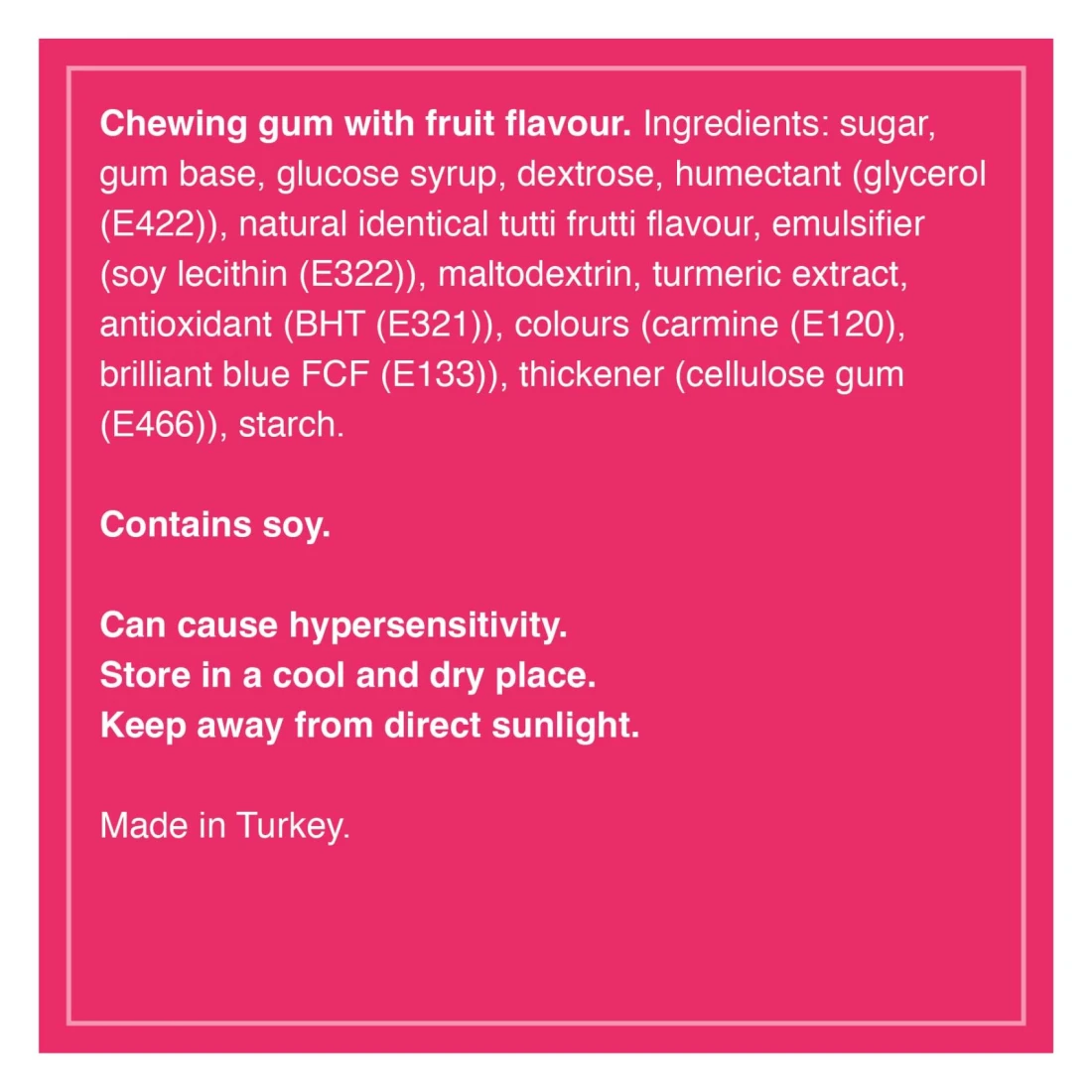 ingredients : Sugar, Gum Base, Glucose Syrup, Dextrose, Humectant (Glycerol (E422)), Natural Identical Tutu Frutti Flavour, Emulsifier (Soy Lecithin (E322)), Maltodextrin, Turmeric Extract, Antioxidant (Bht (E321)), Colours (Carmine (E120), Brilliant Blue FCF (E133)), Thickener (Cellulose Gum (E466)), Starch