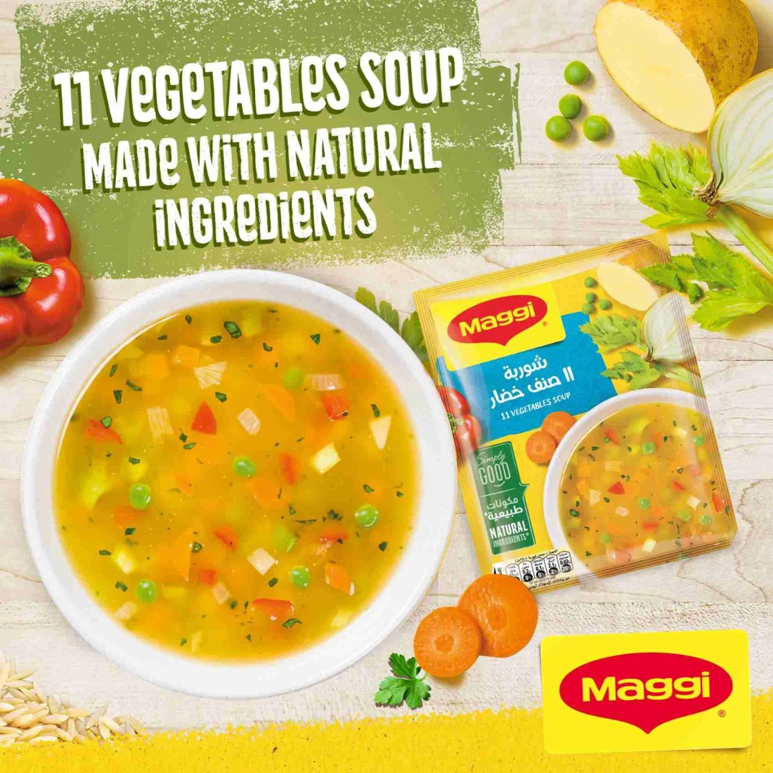 Nestle Maggi 11 Vegetables Soup is a 53g pack of 12 instant soup packets. Made with a combination of 11 different vegetables this soup is not only delicious but also nutritious. The soup is easy to prepare requiring only hot water. Simply empty the contents of the packet into a bowl add hot water stir well and it's ready to be enjoyed. Each serving of this soup is packed with the goodness of vegetables making it a great choice for a quick and healthy meal. Whether you're at home or on the go Nestle Maggi 11 Vegetables Soup is a convenient and delicious option.