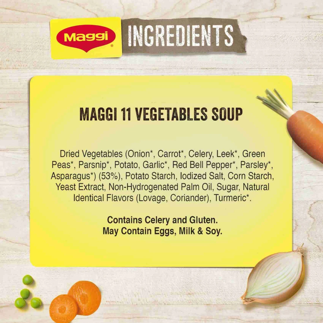 ingredients : Dried Vegetables (Onion, Carrot, Parsnip, Green Peas, Leek, Celery, Potato, Garlic, Red Bell Pepper, Parsley, Asparagus) (53.4%), Potato Starch, lodized Salt, Corn Starch, Yeast Extract, Non-Hydrogenated Palm Oil, Sugar, Natural Identical Lovage Flavor, Natural Coriander Flavor, Turmeric